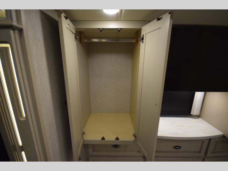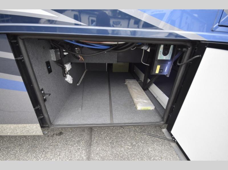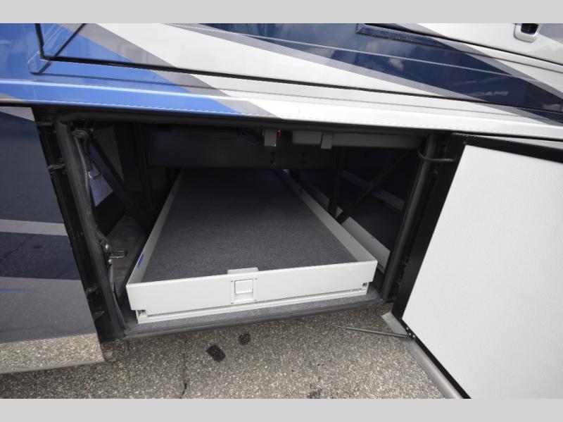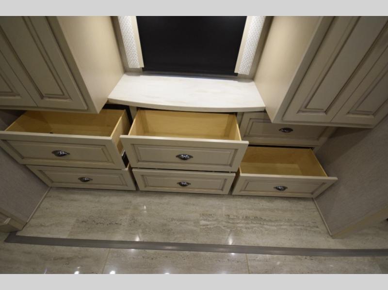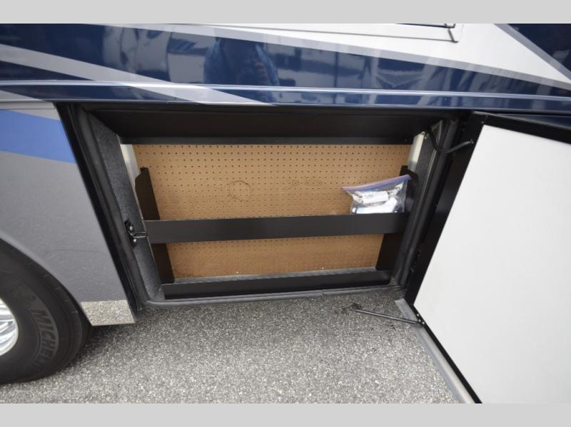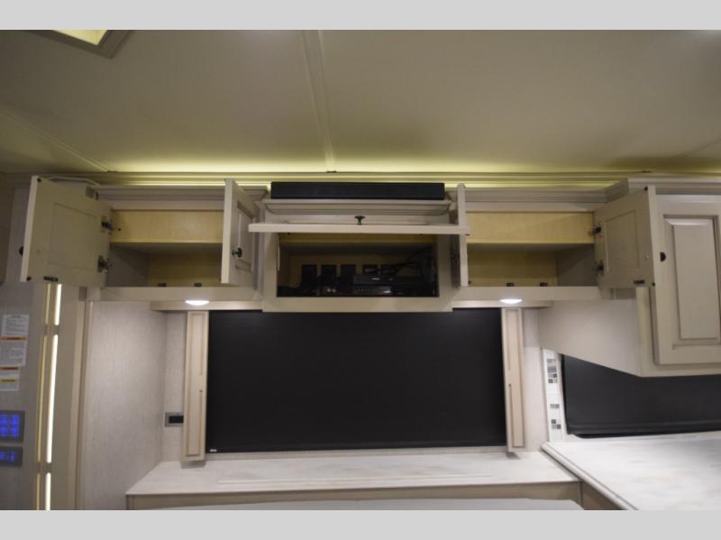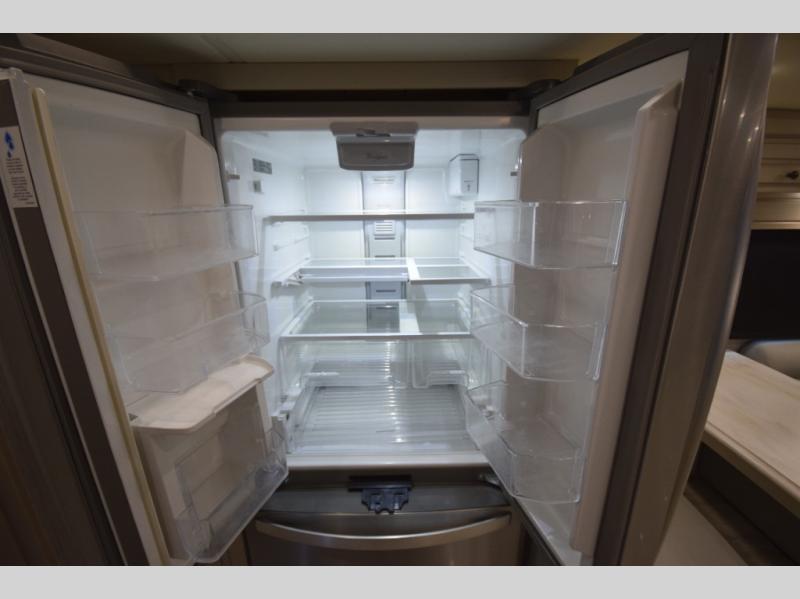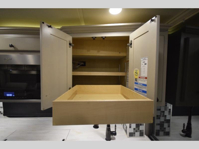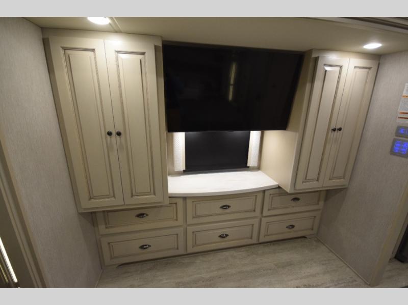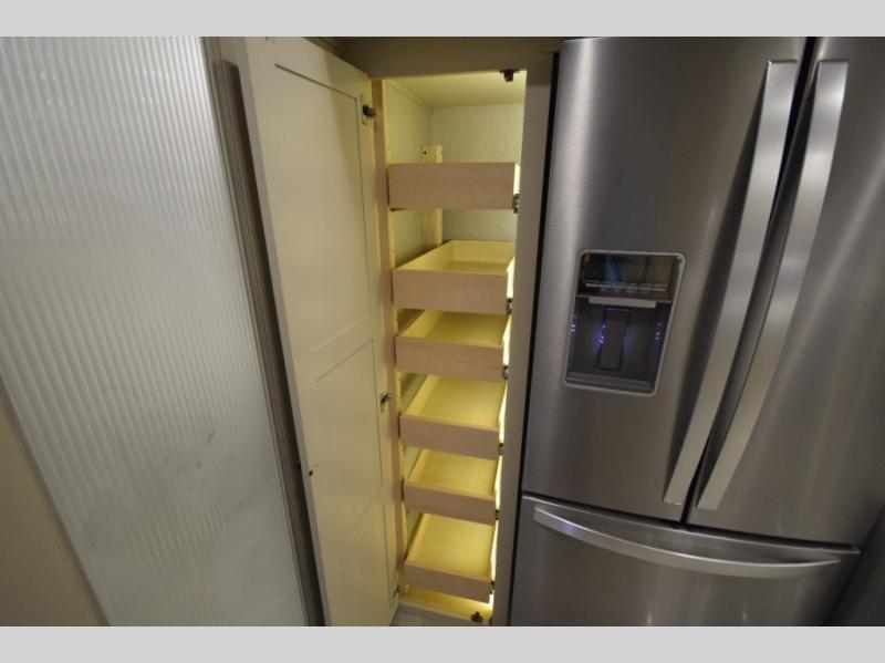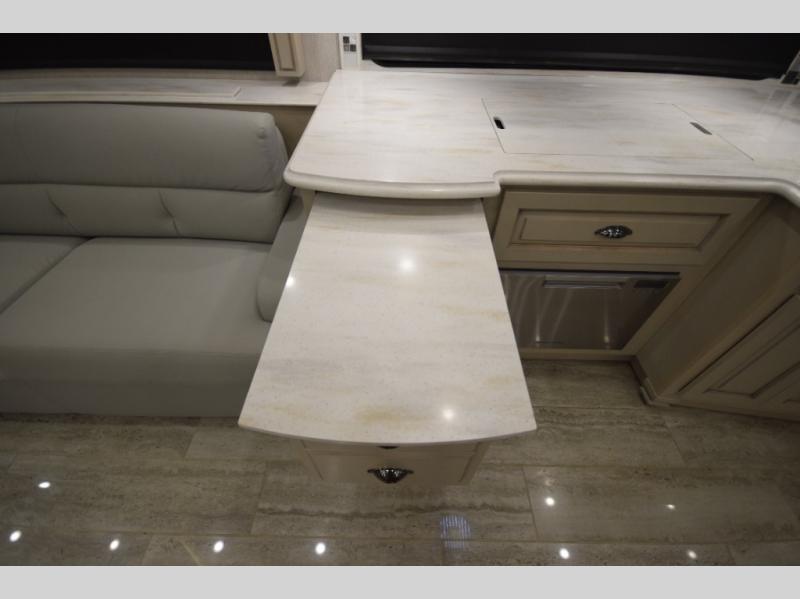 The full-wall slide, paired with two additional slide-outs, dramatically expands your living space—creating an interior that feels more like a luxury condo on wheels. Entertain guests, relax in style, or work remotely with ease from the passenger workstation or hide-a-leaf dinette.