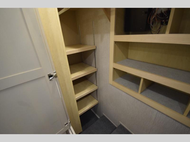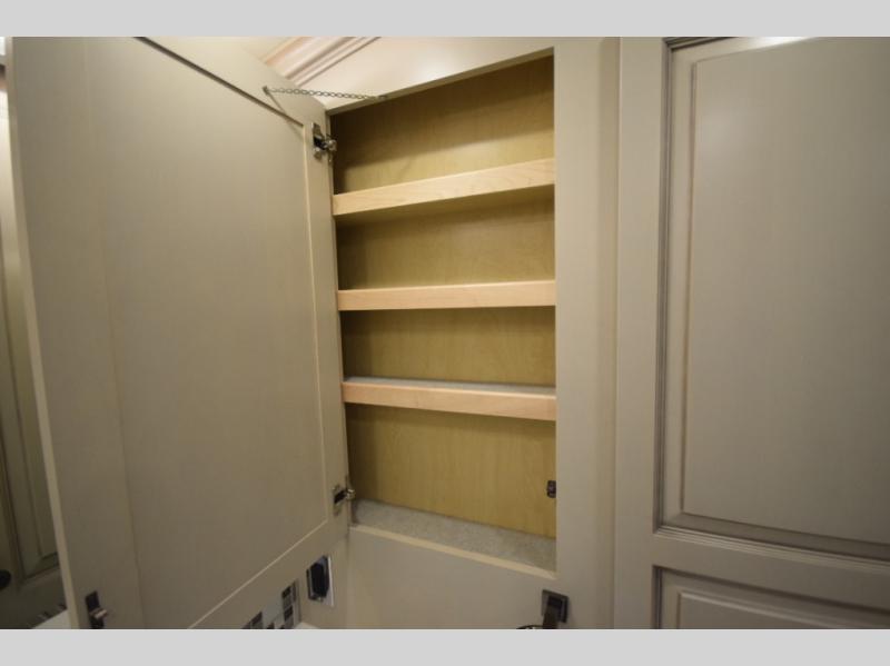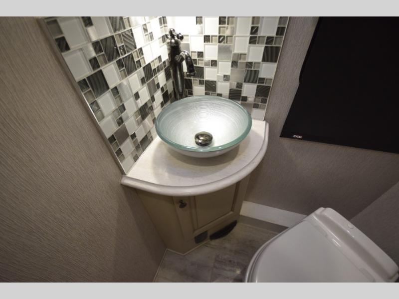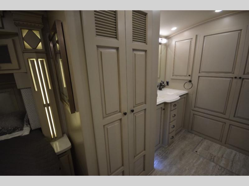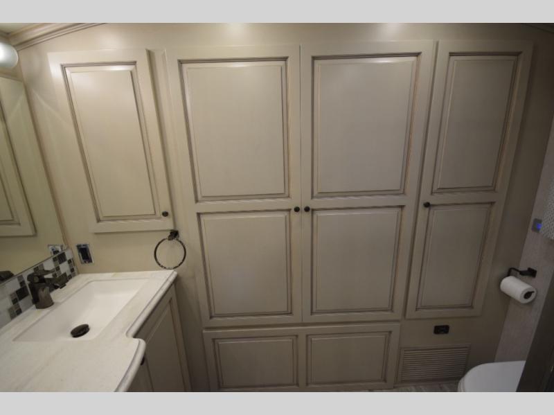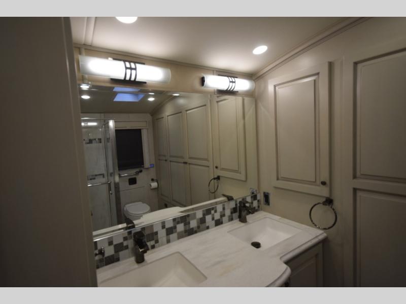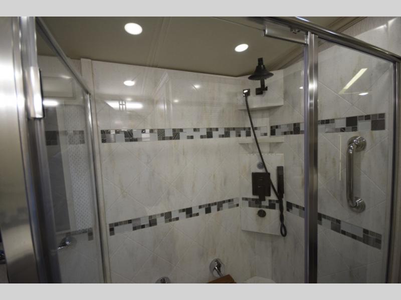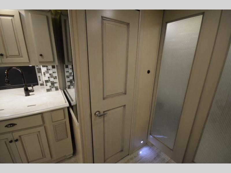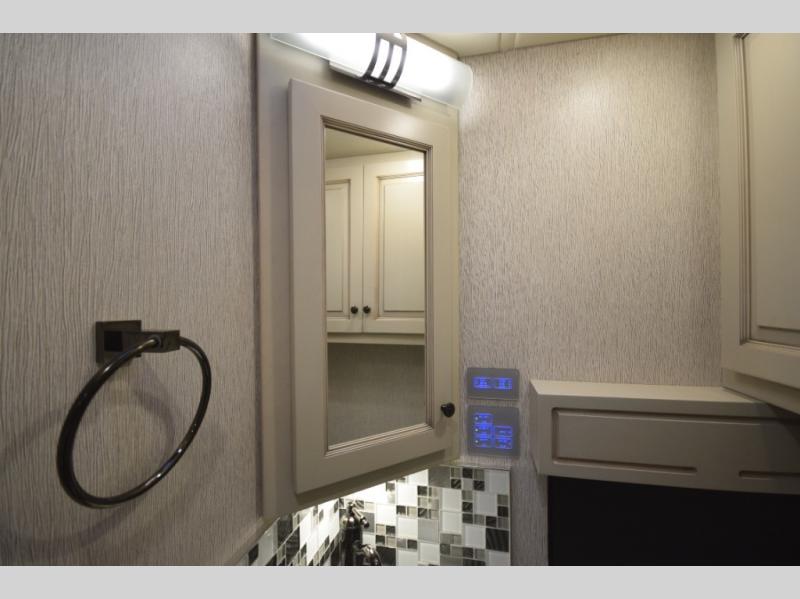 At the rear, you'll find a luxurious full bath with a dual-sink vanity, abundant storage, and a cathedral ceiling for added headroom and elegance. A convenient half bath mid-coach makes it easy to host guests without compromising your own space.