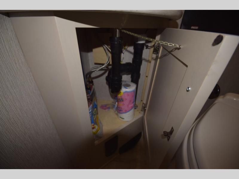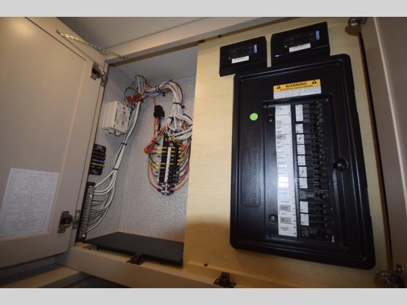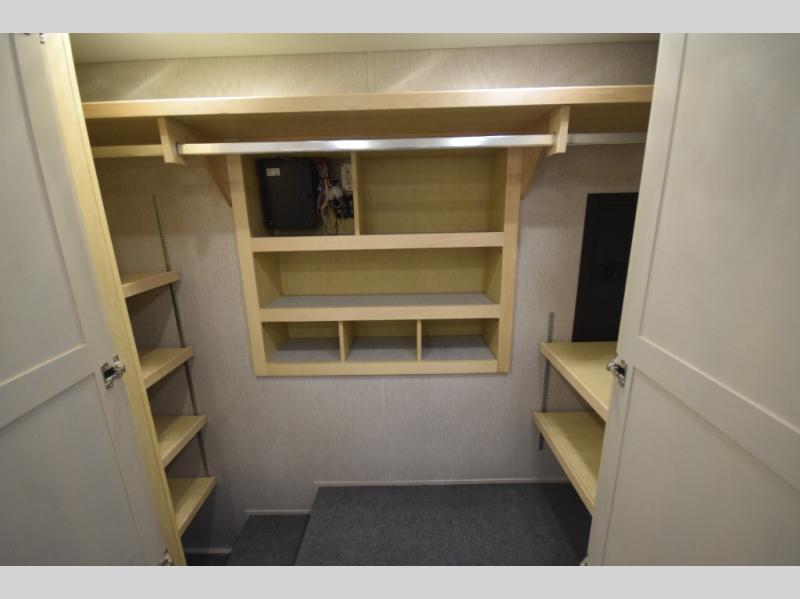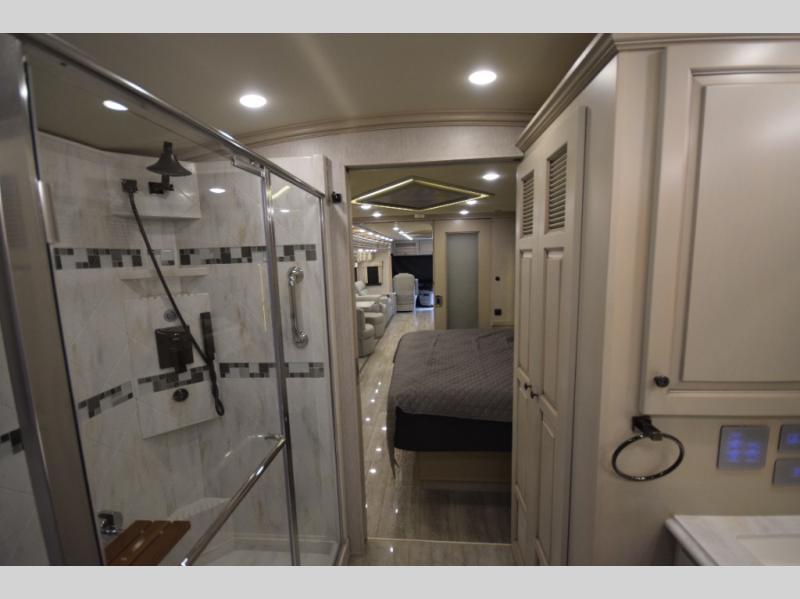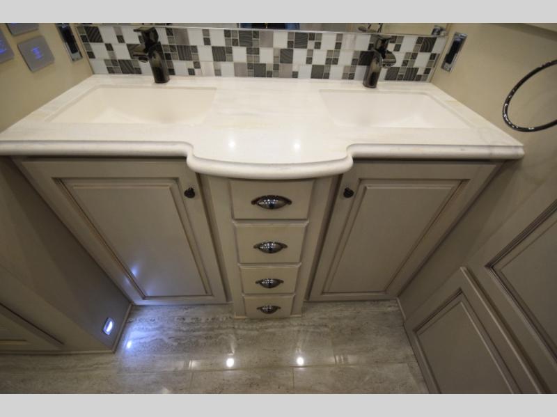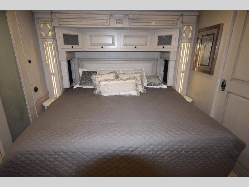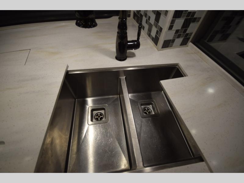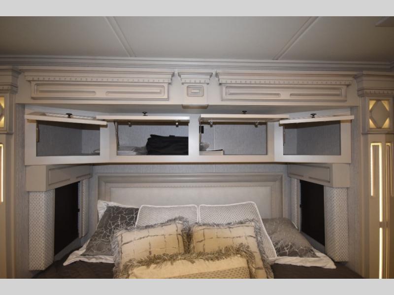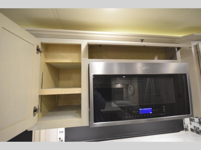 At the rear, you'll find a luxurious full bath with a dual-sink vanity, abundant storage, and a cathedral ceiling for added headroom and elegance. A convenient half bath mid-coach makes it easy to host guests without compromising your own space.