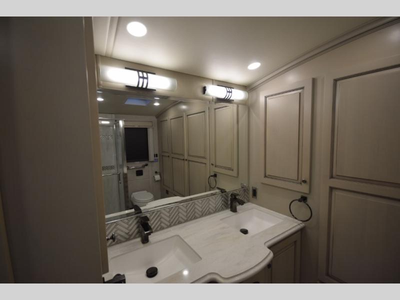 Full & Half Bath, Rear Master Bath with Cathedral Ceiling, Dual-Sink Vanity, Pillowtop King Bed, Hide-A-Leaf Dinette + Passenger Workstation, Two Sofas, Full-Wall Slide + Two Additional Slides