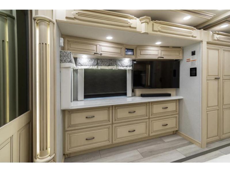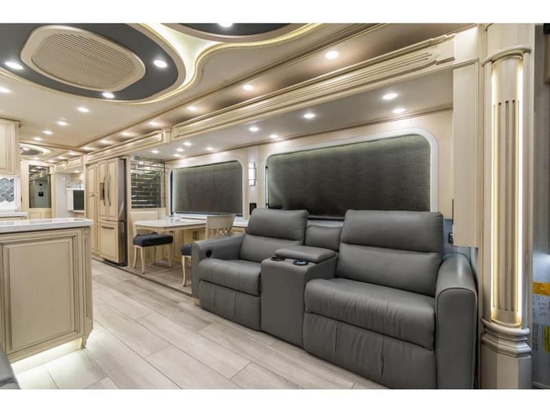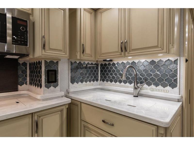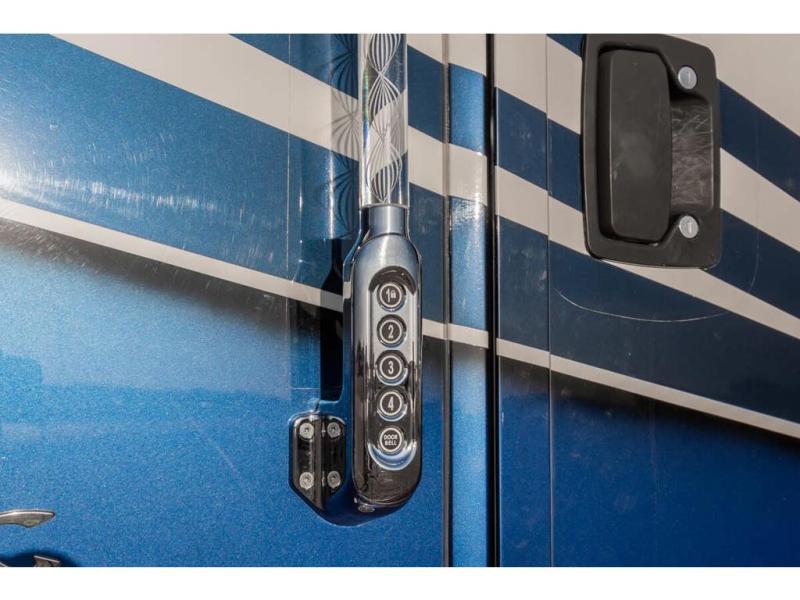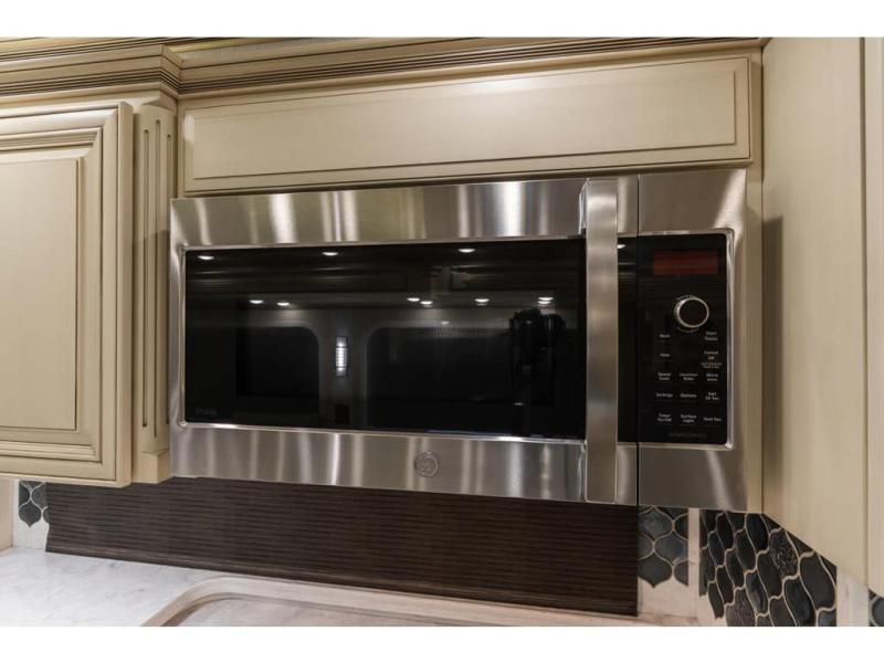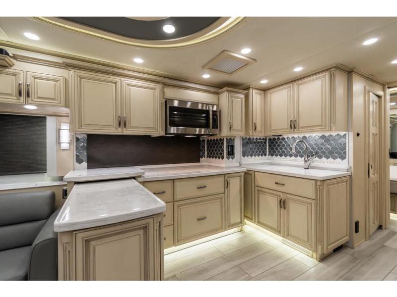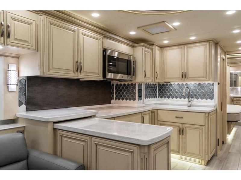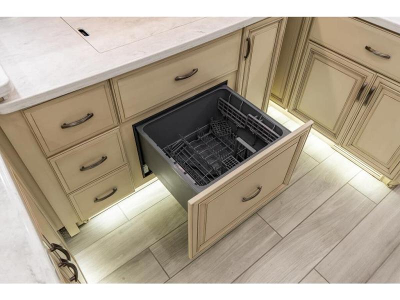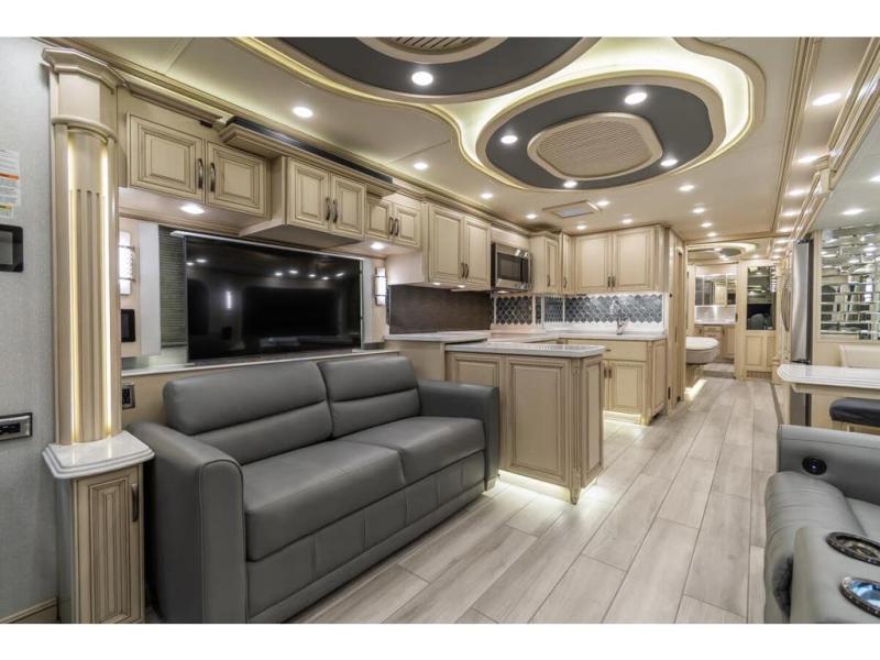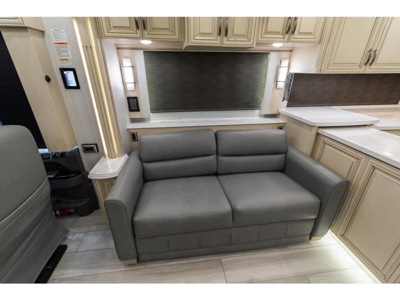 You won't be left wanting for comfort in this coach that can sleep five people each night. The king bed in the master bedroom is sure to provide a great night's rest, and the full rear bath will allow you to get ready in luxury. Here, you'll find full tiled shower walls and a fold down shower seat, a Whirlpool stacked washer and dryer, plus two wardrobes to keep your clothes neat and tidy. If you have any guests stay over, they can sleep on the jack knife and side hide-a-bed sofa, and there is a Samsung LED TV on power lift here so the little ones can watch morning cartoons. Breakfast can be prepared on the recessed two burner induction cooktop, or in the GE Profile Advantium microwave, and there is an island peninsula with a stationary base for extra counter space.