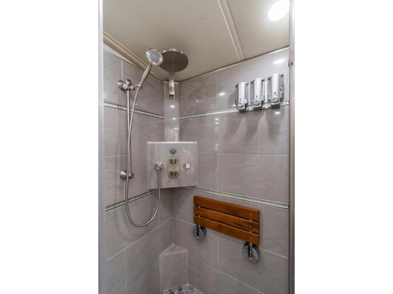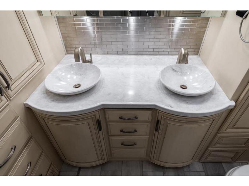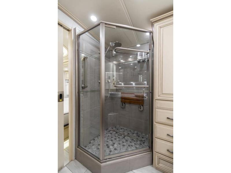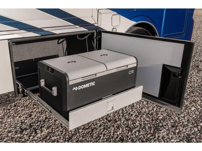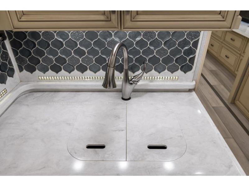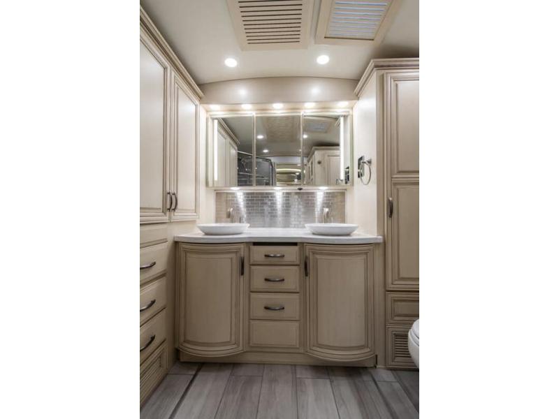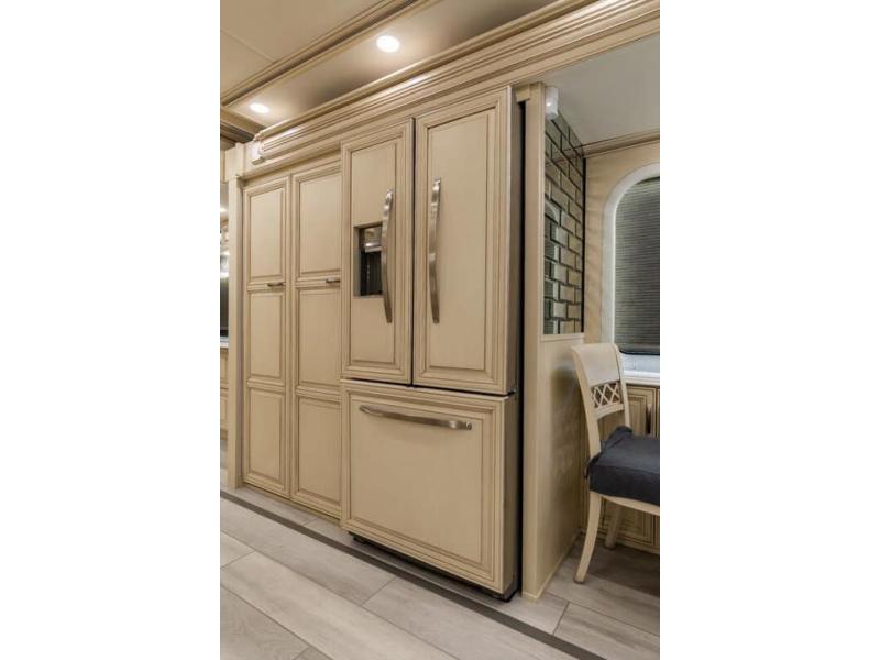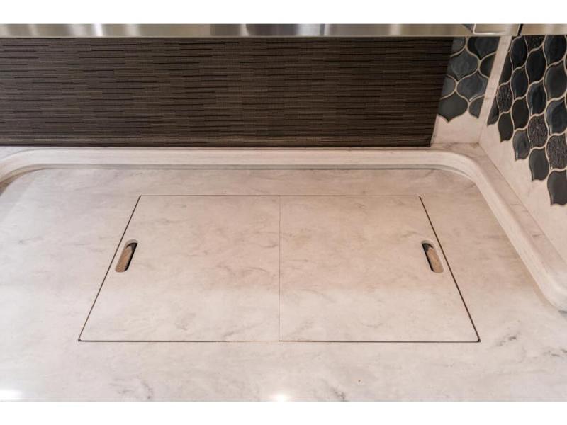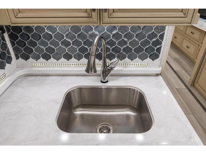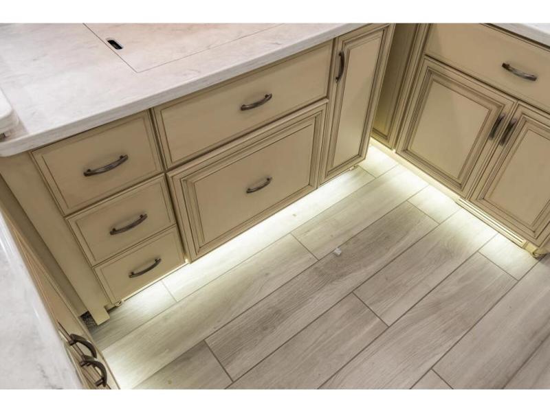 You won't be left wanting for comfort in this coach that can sleep five people each night. The king bed in the master bedroom is sure to provide a great night's rest, and the full rear bath will allow you to get ready in luxury. Here, you'll find full tiled shower walls and a fold down shower seat, a Whirlpool stacked washer and dryer, plus two wardrobes to keep your clothes neat and tidy. If you have any guests stay over, they can sleep on the jack knife and side hide-a-bed sofa, and there is a Samsung LED TV on power lift here so the little ones can watch morning cartoons. Breakfast can be prepared on the recessed two burner induction cooktop, or in the GE Profile Advantium microwave, and there is an island peninsula with a stationary base for extra counter space.