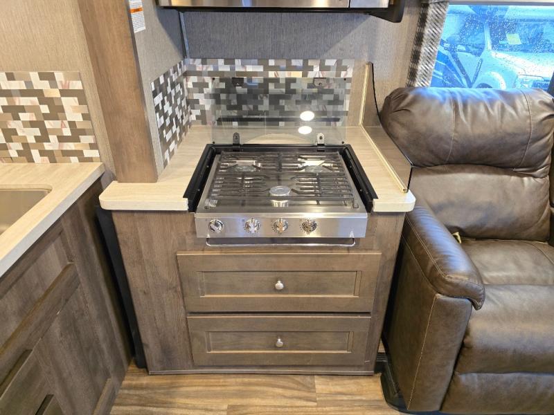 Visiting family a few states over has never been easier than in this spacious Triumph Super C. You will find plenty of storage space including a pantry and three wardrobes. One of the wardrobes even has a space that has been prepped to add an optional washer and dryer for easy full-time RV living. The grandkids can tag along since there is sleeping space for them on the cab-over bunk, the booth dinette, and the jackknife sofa. You and your spouse will enjoy the rear private bedroom all to yourselves with a queen bed, a large wardrobe, and an optional TV if you want to watch a late night movie. The full bath will provide complete privacy when getting ready each day, and there is even a shower skylight for more standing room and natural light. If you enjoy cooking breakfast outdoors, make sure you choose the optional exterior kitchen!