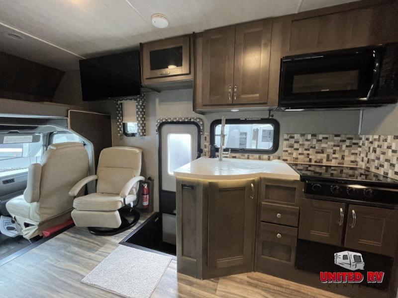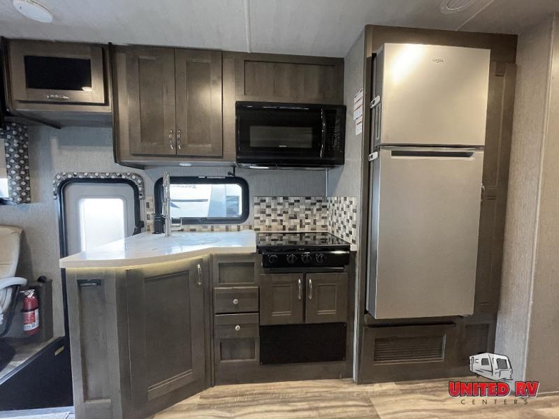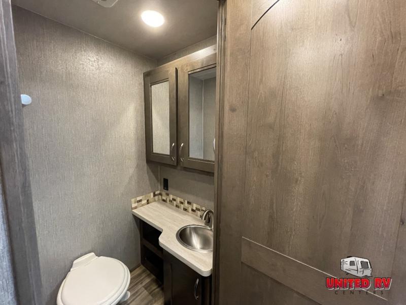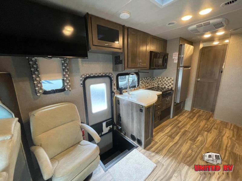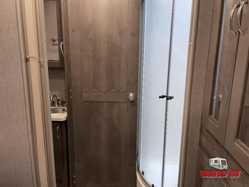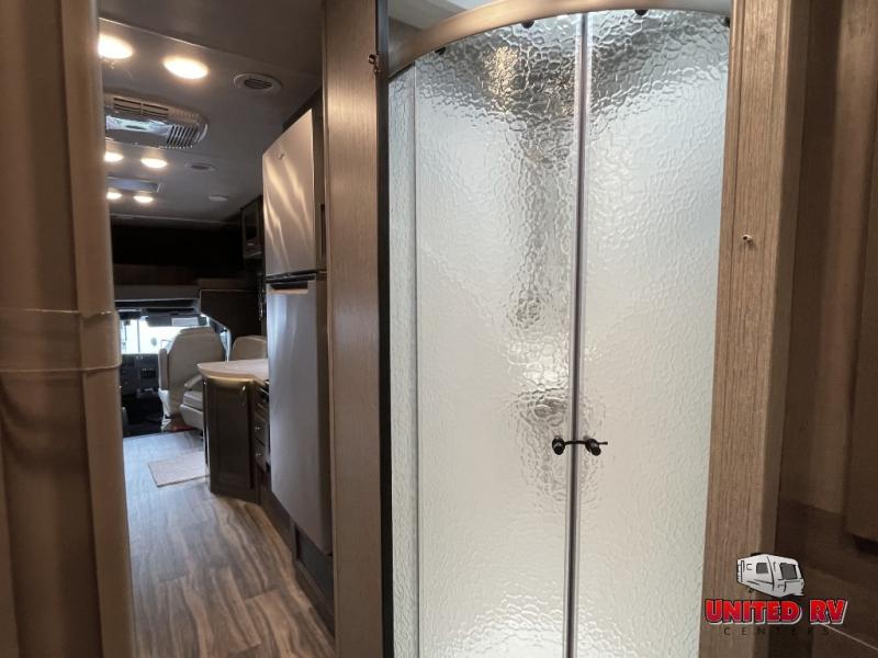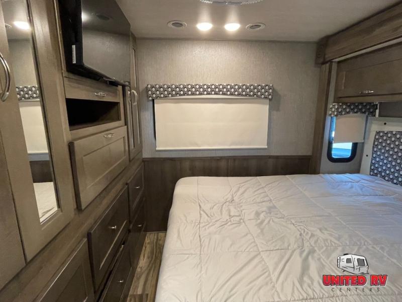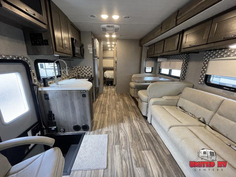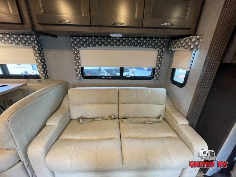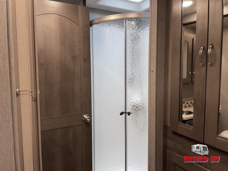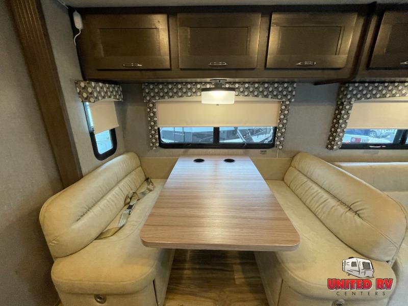 Enjoy a home away from home with this motorhome! The rear private bedroom has a queen bed slide to lay your head on at night with an optional LED TV that can be added across from it, plus the radius shower of the separated bathroom opens up into the bedroom and the toilet and sink are in their own private area. The bunk over cab offers another comfortable place to sleep and comes with a 40" flat screen TV for entertainment at night while relaxing on the deluxe tri-fold sofa. Prepare your best home cooked meals with the three burner cooktop and enjoy them at the deluxe dream booth dinette with storage for your games!