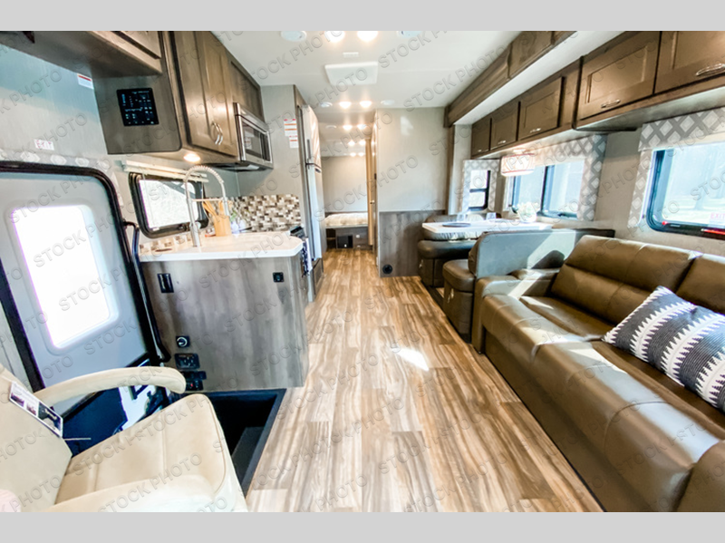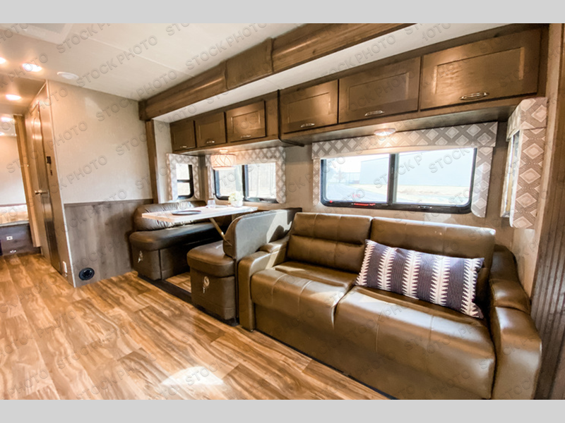 Find your favorite destination and take your favorite people with you in this motorhome! Everyone will have a comfortable place to lay their head at night with a rear queen bed, a bunk over cab with a LED TV, the deluxe tri-fold sofa, and set of bunk beds that could be switched out for an optional wardrobe. You could even transform the deluxe dream booth dinette into a sleeping space if needed. After a long day of traveling, clean up in the full bathroom with the shower and enjoy the natural lighting from the skylight above it. Sip on your morning coffee while relaxing in the Euro recliner while bacon is cooking on the three burner cooktop.