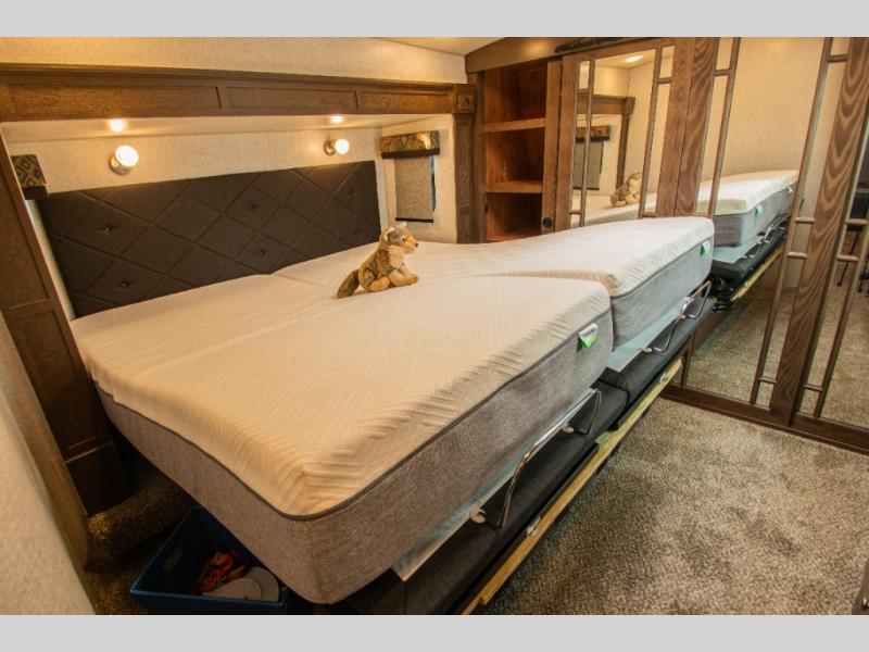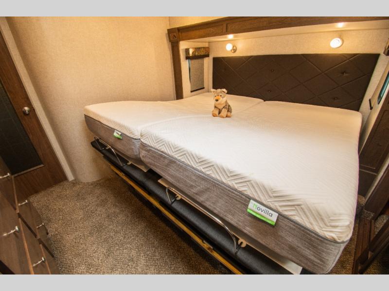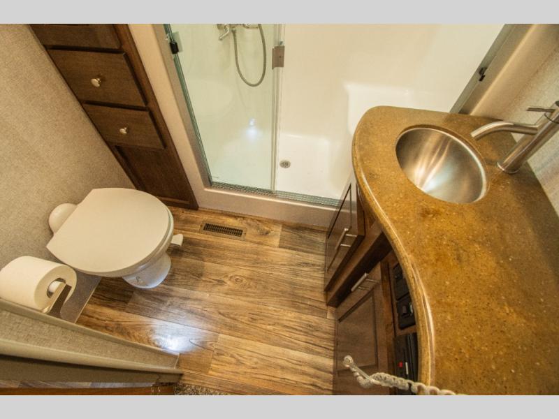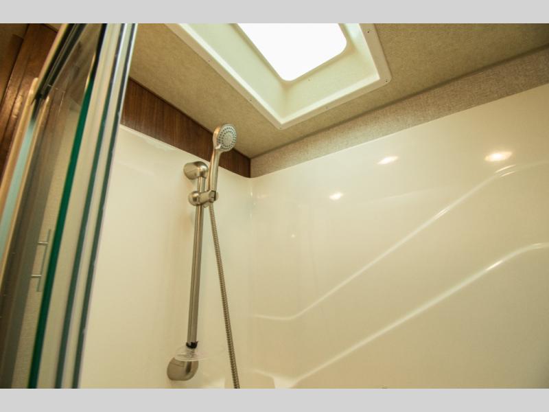 Any Northwood Arctic Fox Grande Ronde fifth wheel is built on a custom built off-road chassis with a wide-body floorplan and offers a true four-season RV with residential fiberglass insulation, reinforced woven highway moisture barrier, heated and insulated holding tanks, and the all-foam condensation resistant A/C ducts. The interior offers cathedral arched ceilings with plenty of headroom for the tallest family member, slow rise night shades for privacy and hidden hinges on cabinet doors for the style you are looking for, a bedroom Starlite with shade, a telescoping lighted vanity mirror and lock box, plus a USB charging port at the dinette and on both sides of the bed.