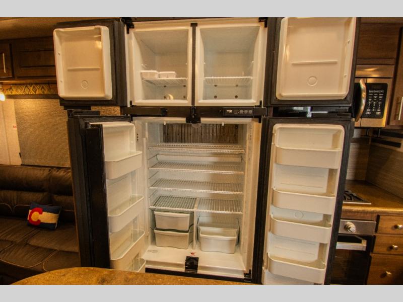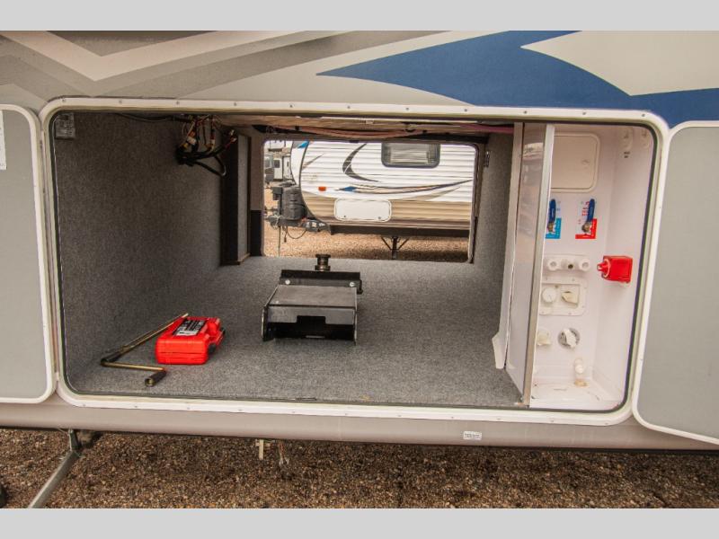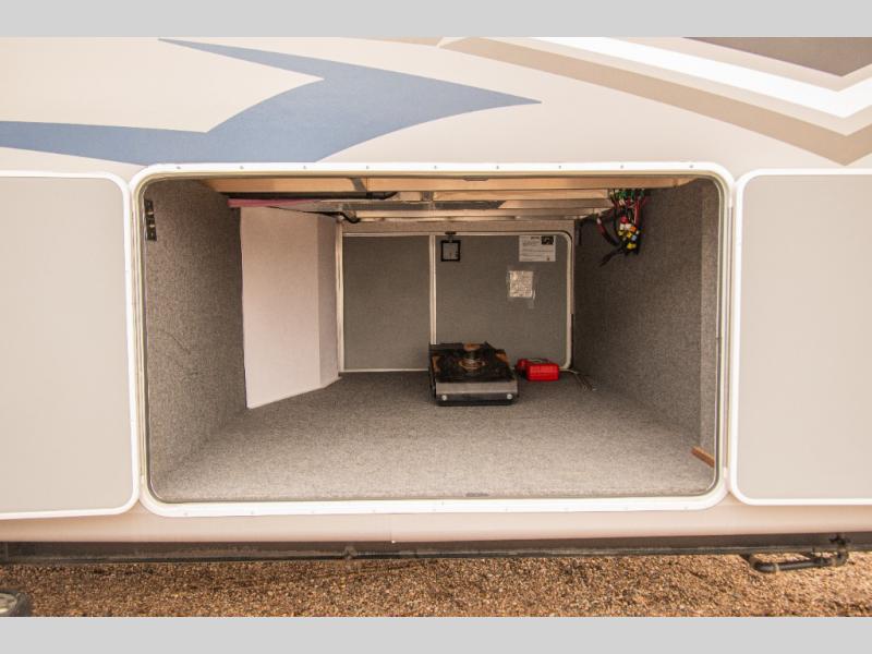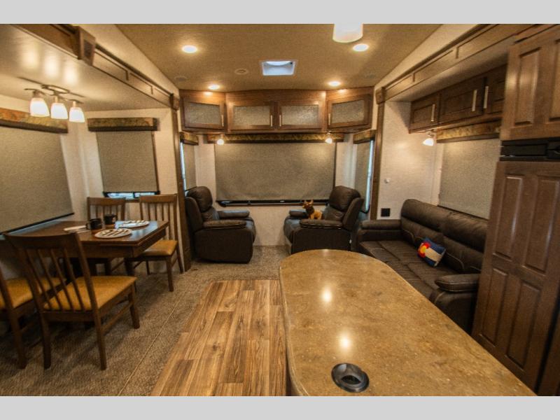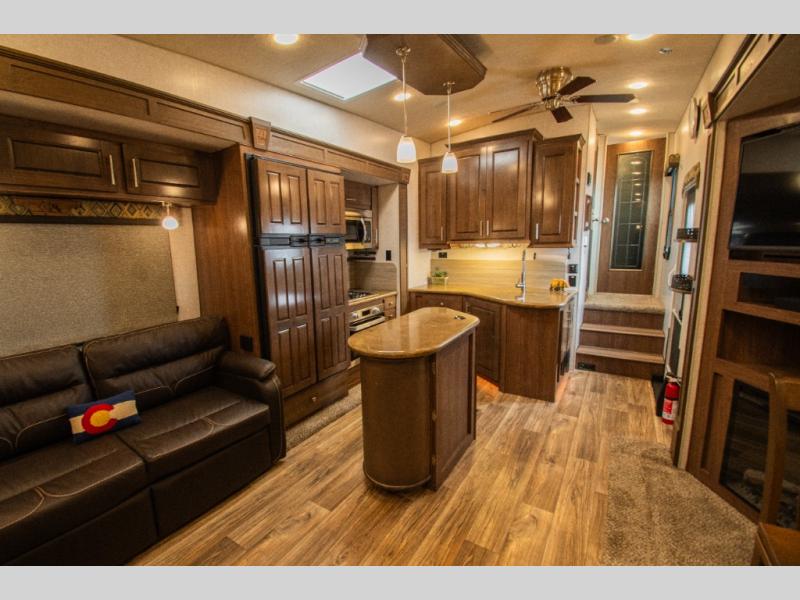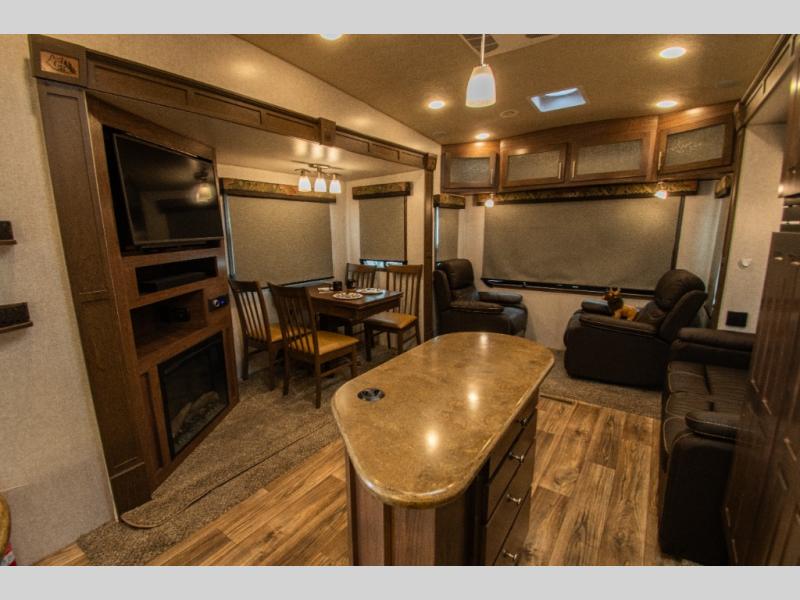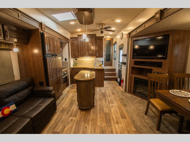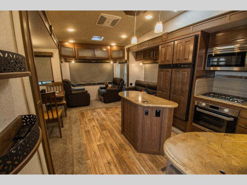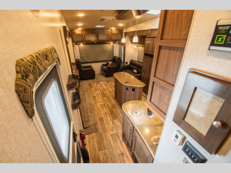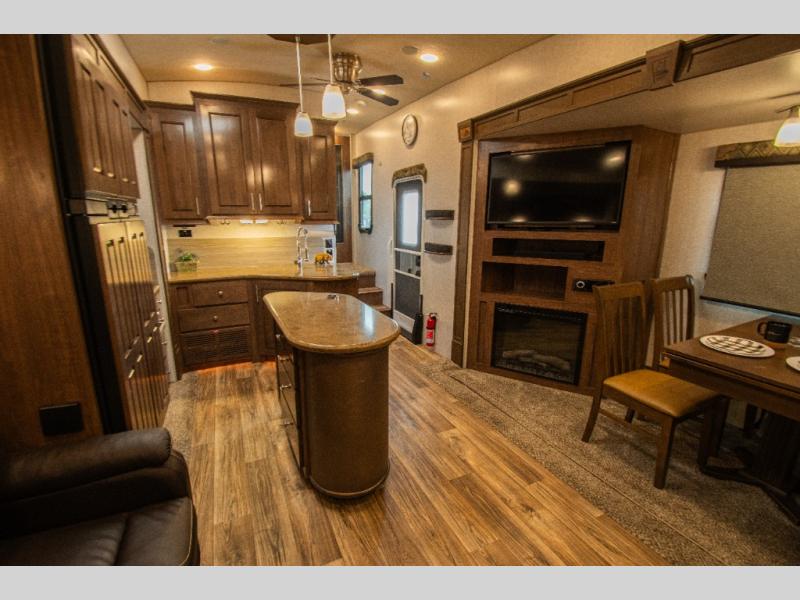 You will love living in this RV, be it full-time or months at a time! From all the home touches such as the ceiling fan, the kitchen island, and the swivel-rocker recliners to the full bathroom with a seated shower, and triple slides, this fifth wheel is spacious and inviting. When you decide to relax inside you can watch the 40" LED Smart TV in the living area or add the optional 32" LED Smart TV in the bedroom. Enjoy many days and evenings relaxing under the Carefree Travel'R awning while you visit with other RVers, and when you are ready to retire for the evening, the front bedroom offers a walk-around queen bed with nightstands or choose the king bed option, and plenty of storage within the dresser, the bench seat, and the full width quad slide wardrobe. And there are more options to choose from to customize your fifth wheel including a washer/dryer for convenience.