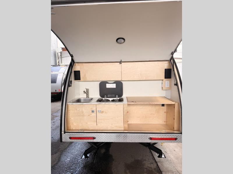 When you enjoy cooking outdoors, traveling light, and sleeping indoors, this teardrop trailer makes sense! From the well-equipped exterior kitchen in the rear hatch, the wet bath and the U-shaped dinette that offers two sleeping configurations, you will have everything you need. You can choose to setup a full bed or split beds, keep your electronics charged with the dual 110/USB ports, and make warm meals outdoors using the two burner glass-top stove, plus the 12V refrigerator will hold your cold items and such. And the wet bath or the external shower will keep you clean and refreshed while camping.