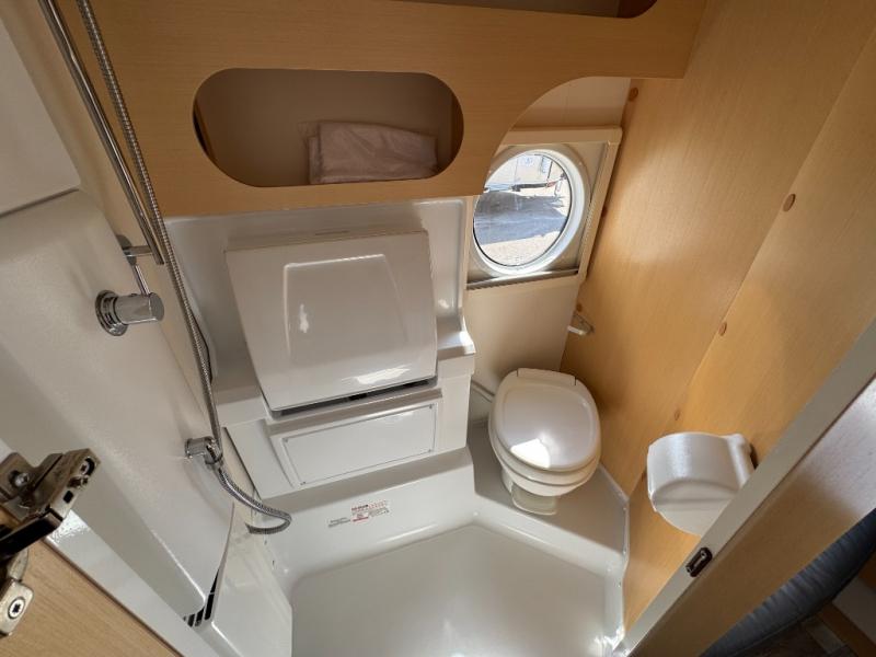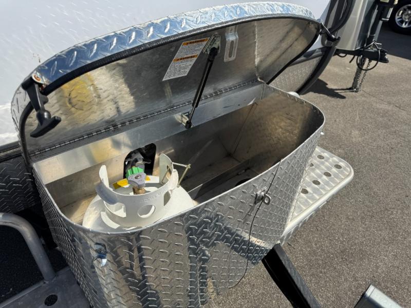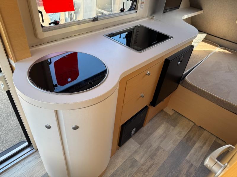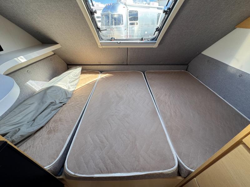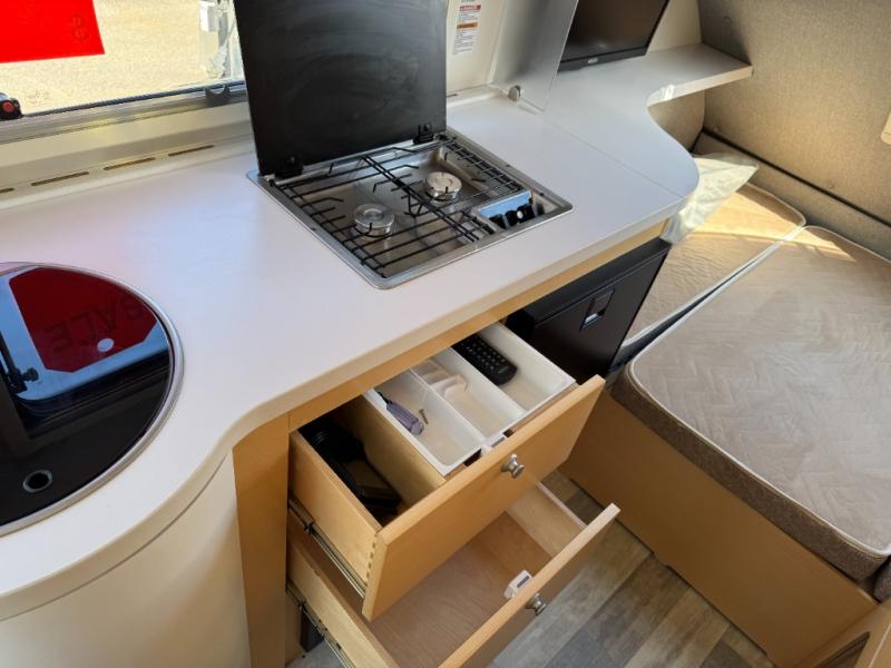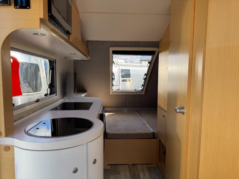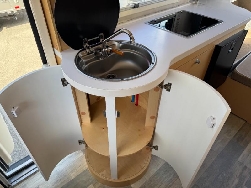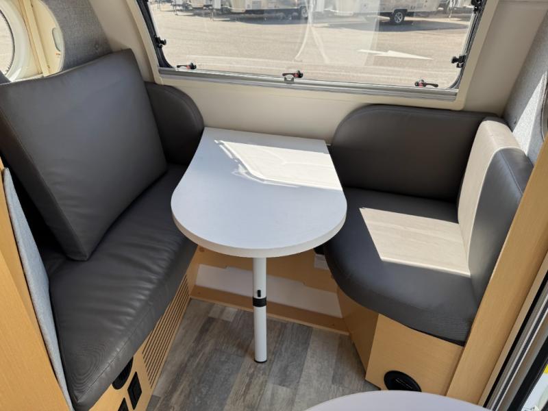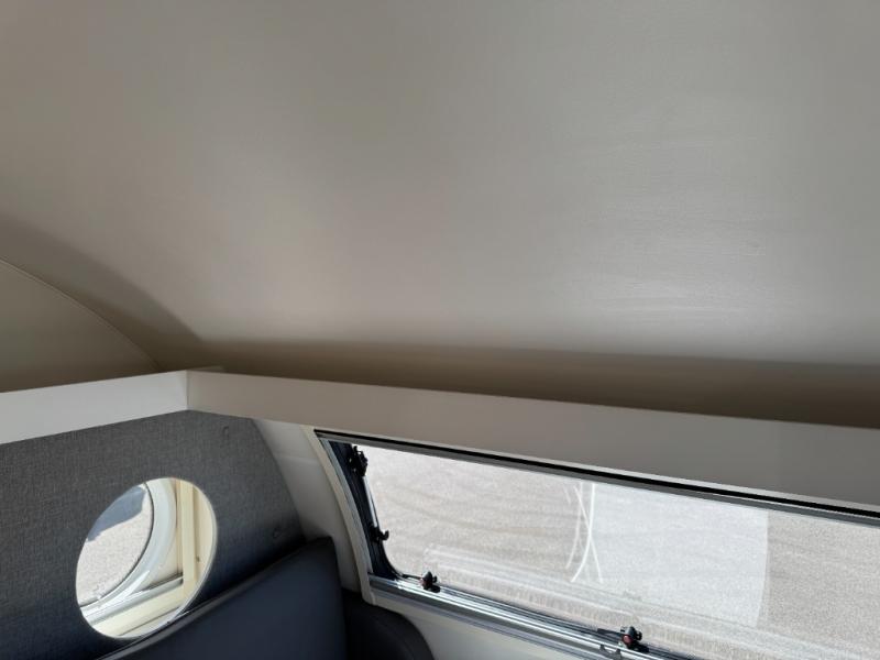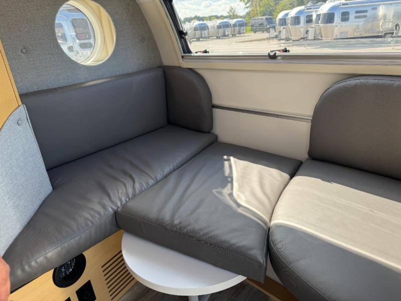 This teardrop trailer offers sleeping space for three with two sleeping areas; one up front and one in the rear. The dinette allows you to eat and relax during the day, and at night this space becomes sleeping space for one. The queen-size sleeping area is located on the opposite side with the wet bath in between for convenience for all. The galley kitchen will give the cook a place to make warm meals and store leftovers in the 2-Way 2.3 cu. ft. fridge or you can choose the 2-Way 4.6 cu. ft. fridge option. Everyone can watch the 24" TV through the Bluetooth media center before bedtime or in the morning as you all plan your next activity. And the Alde central heat and Alde FLOW instant hot water system as well as the central AC system will keep you comfortable where ever you setup. Please note that if you choose the 3-Way fridge option and/or the Boondock option, some specifications will change.