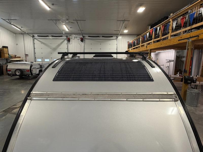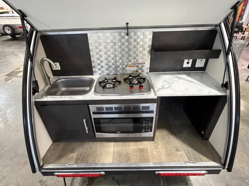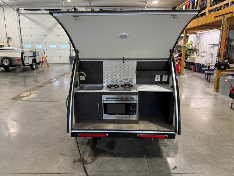 With any nuCamp RV TAG teardrop trailer, you can bring some of the comforts of home with you as you easily tow this lightweight trailer to the campgrounds or off-grid location thanks to the solar roof package. The outdoor kitchen includes a sink, stove, microwave, and removable cooler plus counter space. And the interior offers a composite floor, custom Ohio-Amish cabinetry, a Bluetooth speaker, sleeping accommodations, and a screen/shade system. Get ready for adventure in a TAG!