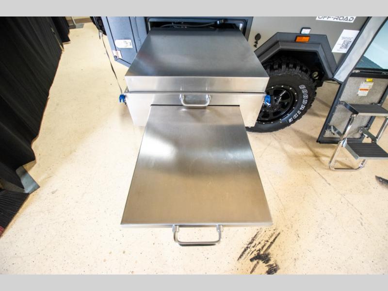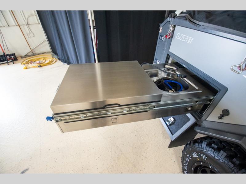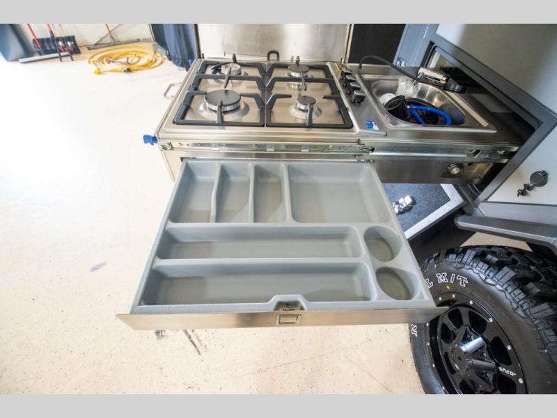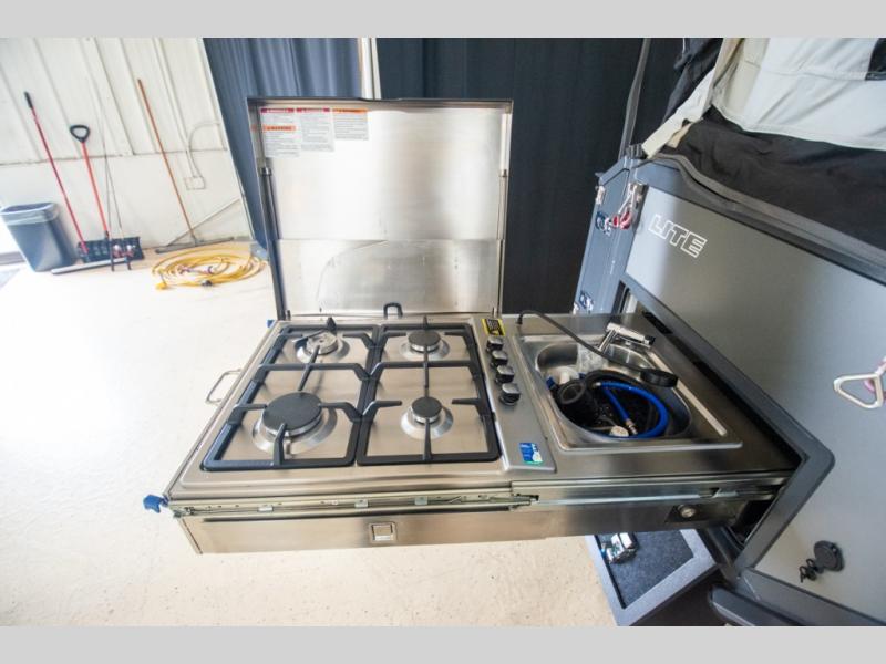 Compact, rugged, versatile, and ready for action with the rapid deployment of the AIR inflation technology, this OPUS folding pop-up camper is easily ready in just minutes! You can sleep each night above ground on your own RV queen tent bed and dine at the U-shaped dinette lounge with plush leatherette seating that converts into additional sleeping space if needed. The stainless steel kitchen slide out gives you a four-burner cooktop to make meals, plus you will have a 12V fridge slide out to stow your cold items. There are six windows with screens for optimal air ventilation when camping.
