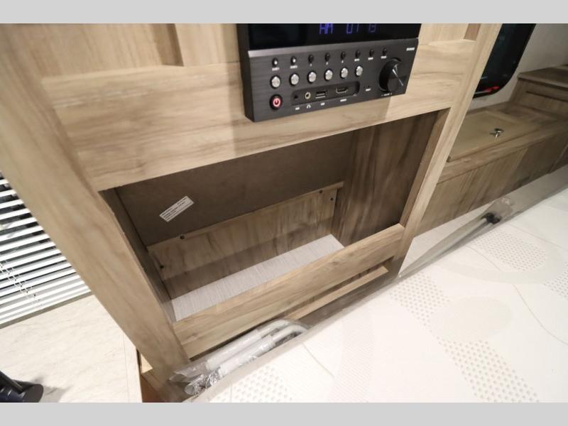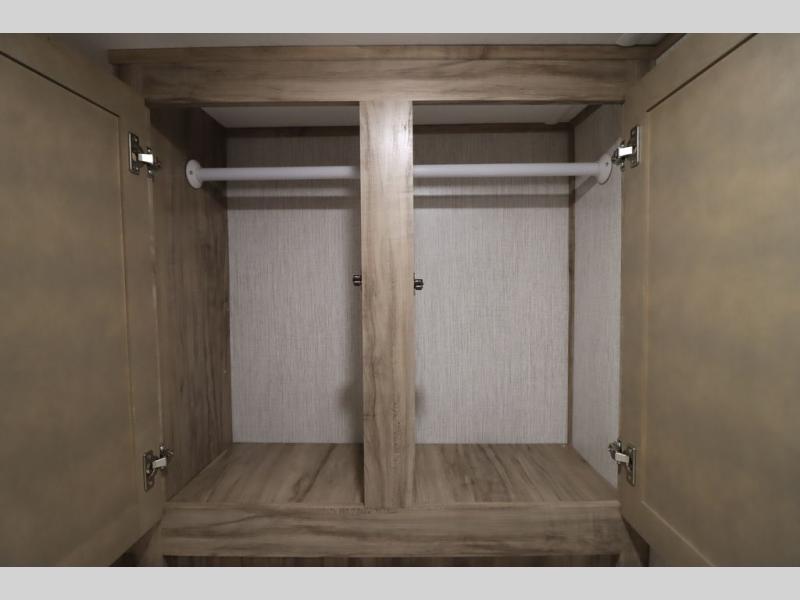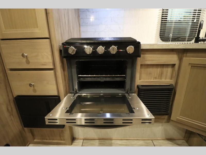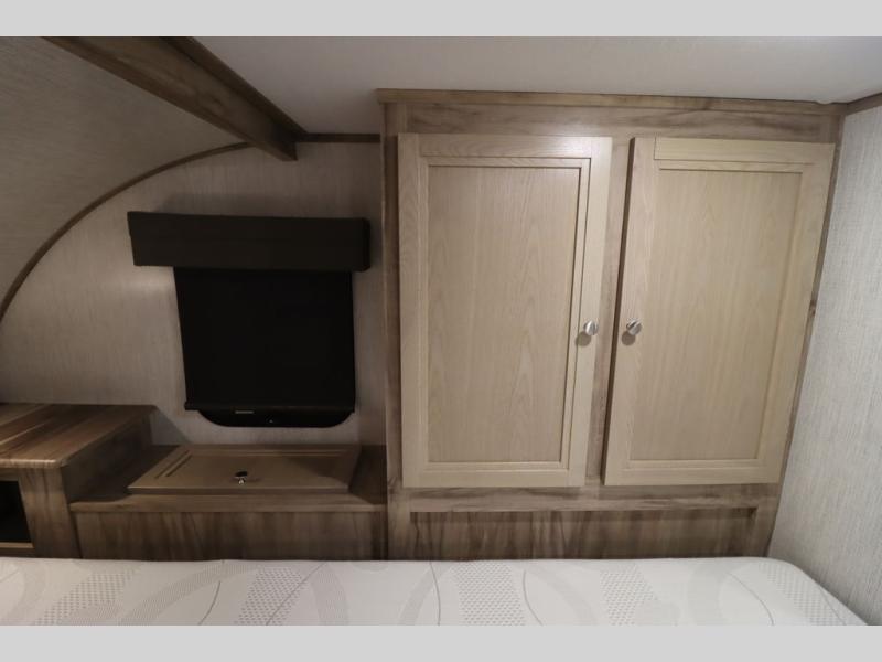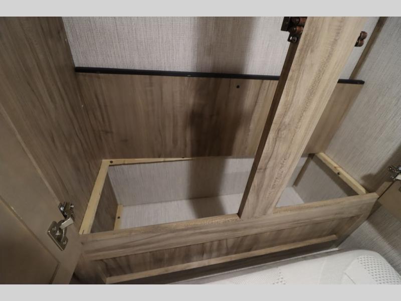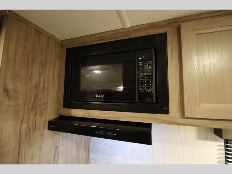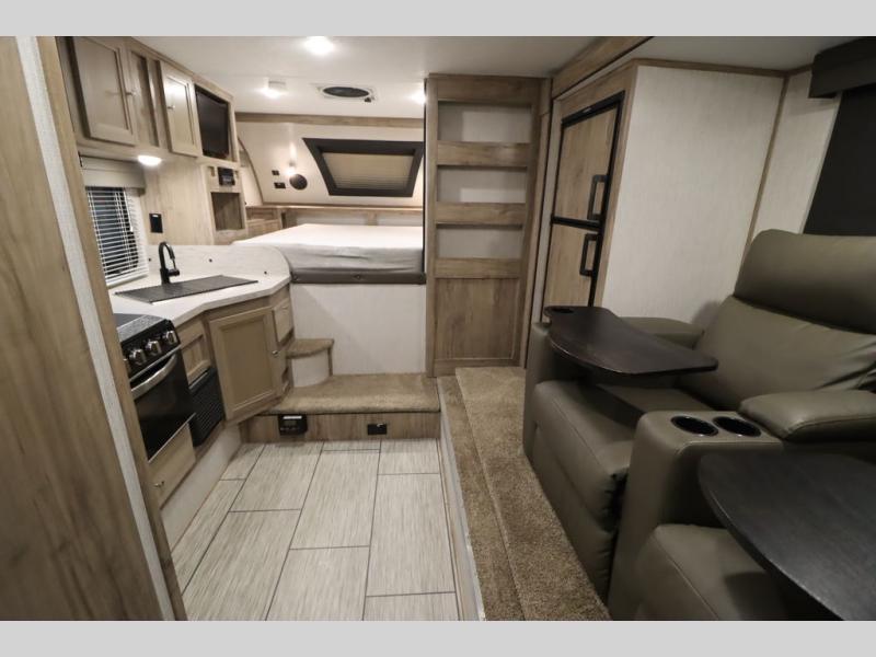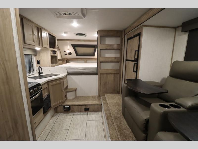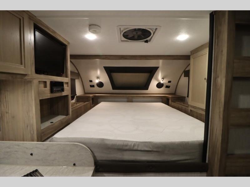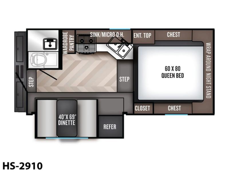 Start adventuring in true comfort with this hard side truck camper! The 40" x 69" booth dinette slide offers a comfortable place to enjoy your meals and even transform into an extra sleeping space, plus it is right next to the two way 6 cu. ft. refrigerator so you don't have to go far for a cold beverage. You can also choose the optional theater seating in place of the dinette for even more comfort. The wardrobe/pantry is good for double use and is next to the wet bath so you can easily grab a towel. Enjoy a good night's rest each night on the front queen bed with a wrap around nightstand, chests on either side, an entertainment center, and a closet to keep your clothes looking their best!
