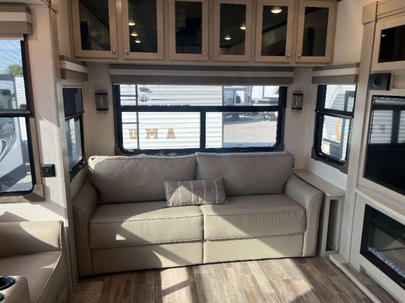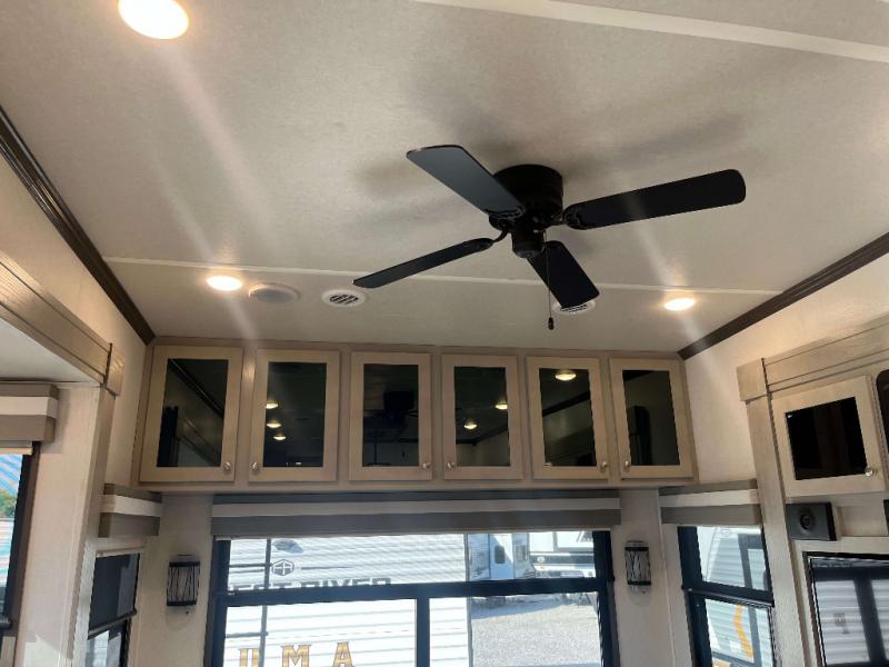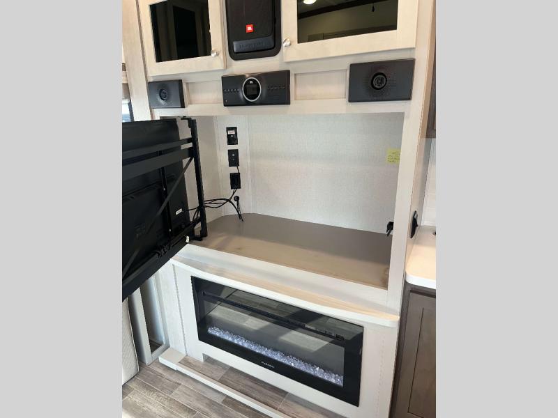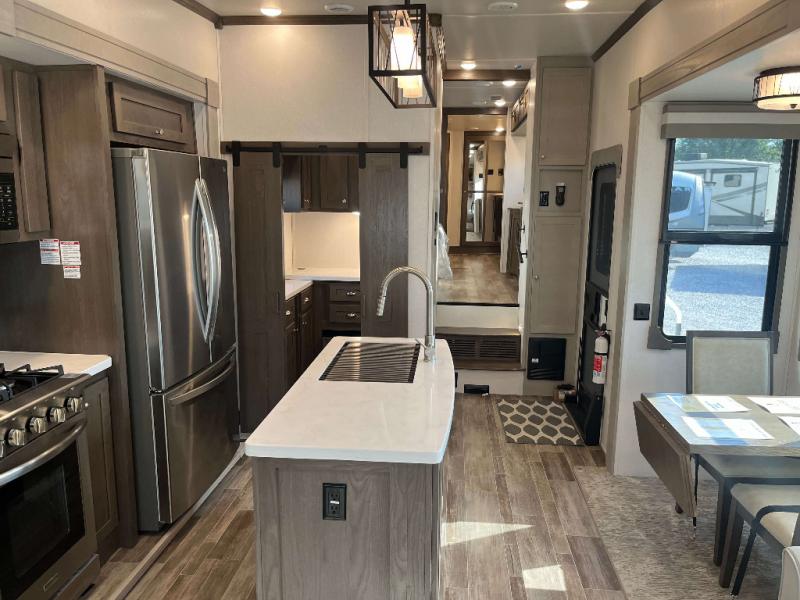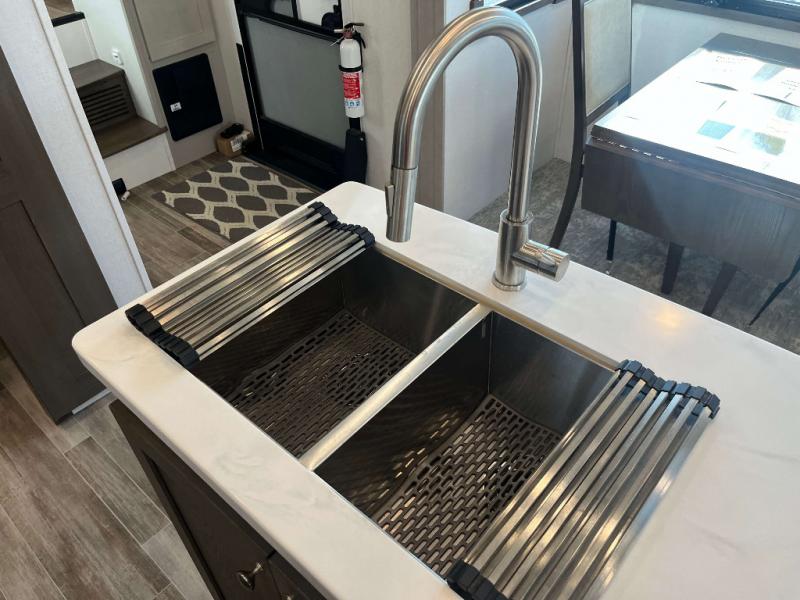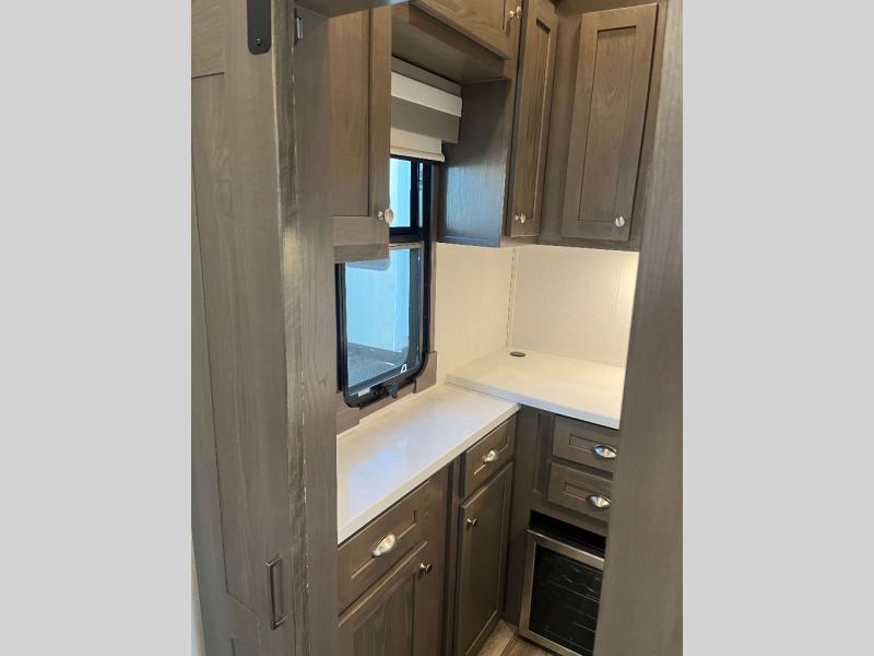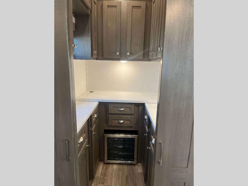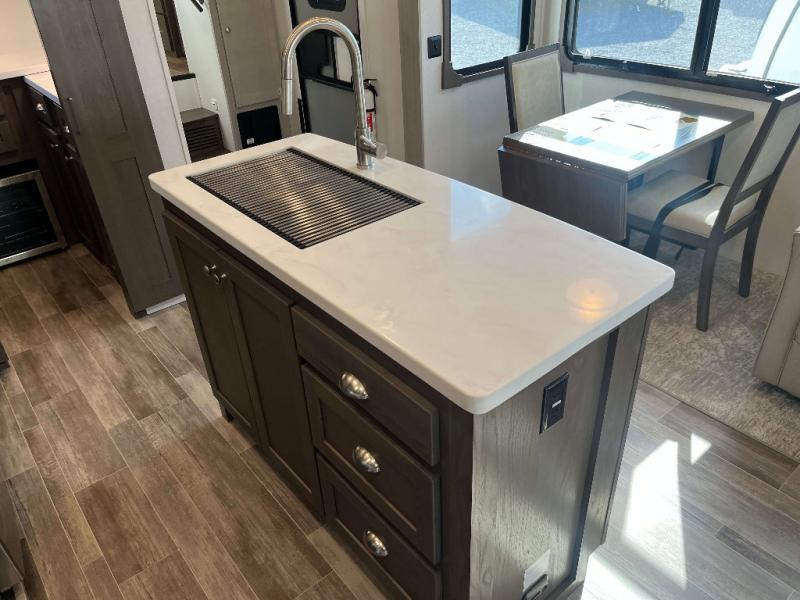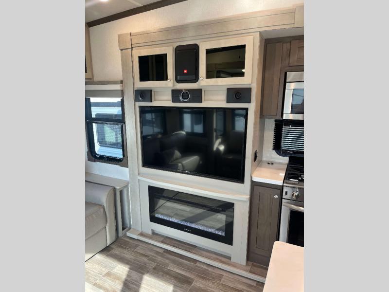 You will be the talk of the campground with this fifth wheel! Its unique butler pantry is perfect for entertaining guests with the U-shaped counter, overhead cabinets to store your drinkware, and cooler to keep your beverages cold while still leaving space in the 20 cu. ft. stainless steel refrigerator for your perishables. You can have game night indoors at the table and chairs or set up a table and chairs underneath the two power awnings. The rear living area offers a comfortable place to watch the big game too with a 88" split tri-fold sofa and 65" power theater seating directly across from the entertainment center with an electric fireplace and 50" TV with JBL sound system. Two can get ready at once in the front bathroom with the dual sink vanity and you can even add an optional washer and dryer!