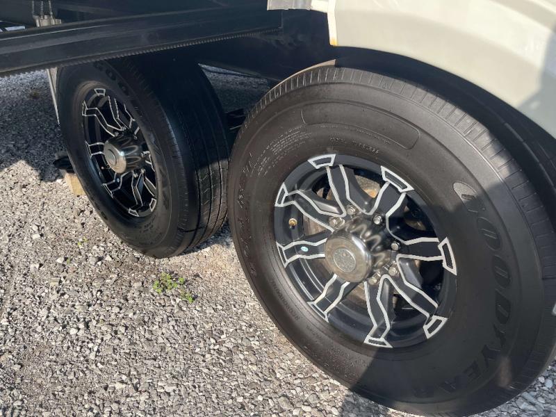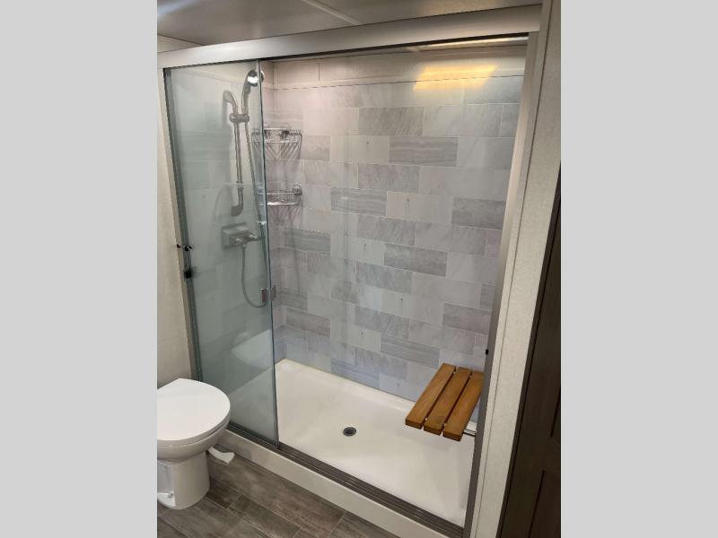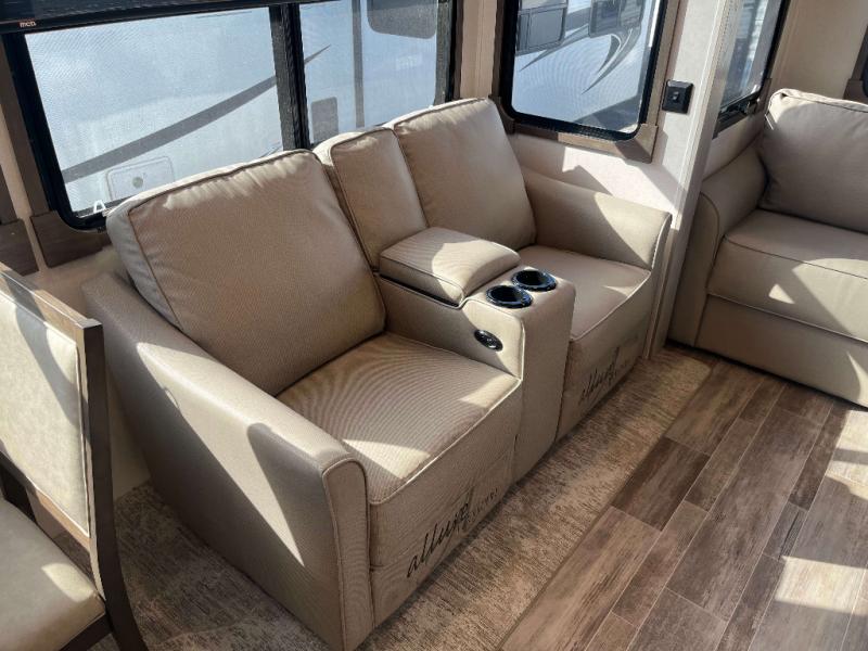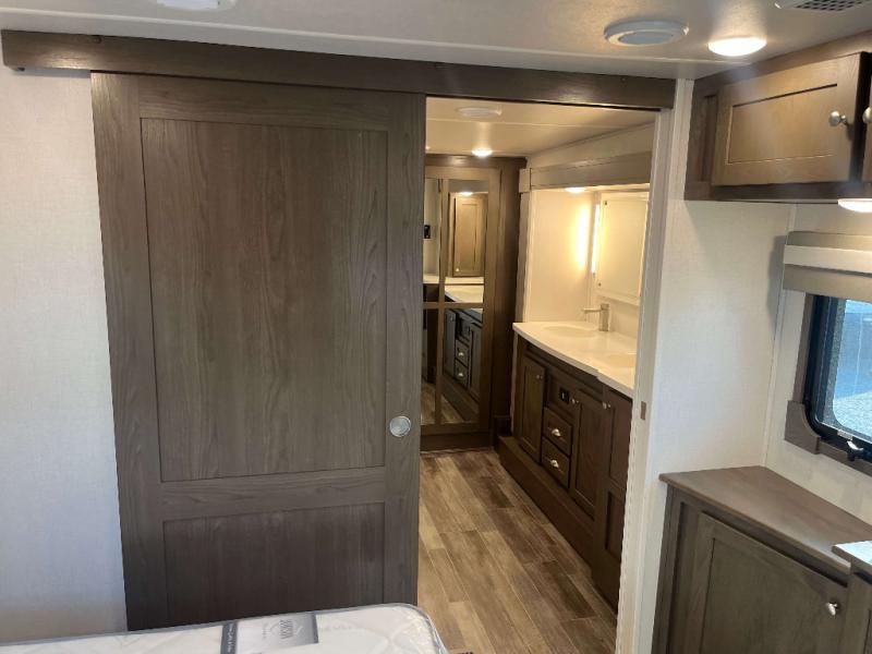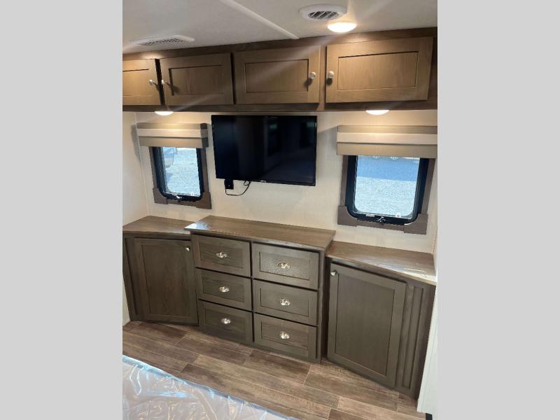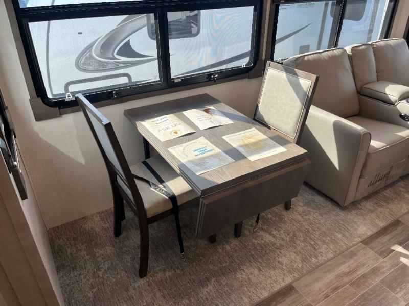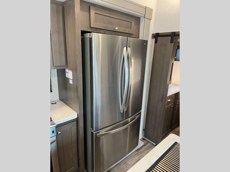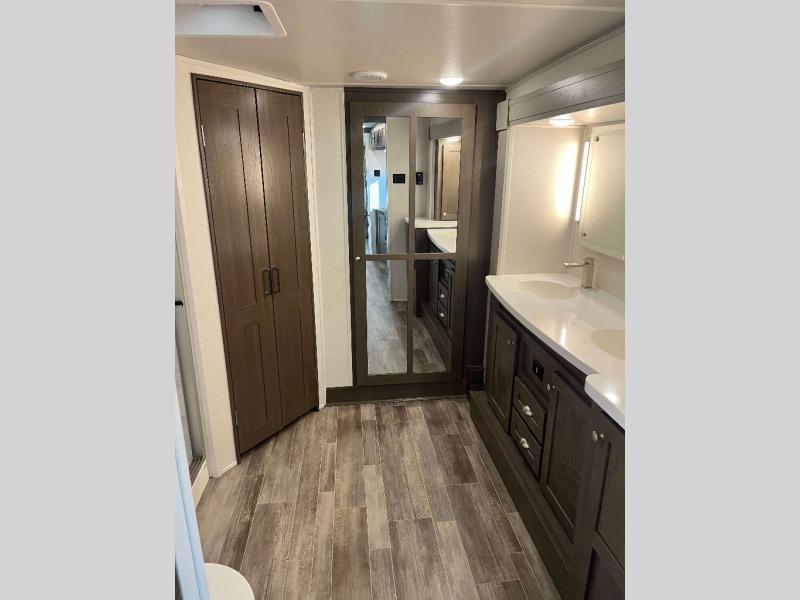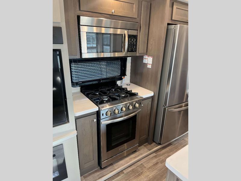 You will be the talk of the campground with this fifth wheel! Its unique butler pantry is perfect for entertaining guests with the U-shaped counter, overhead cabinets to store your drinkware, and cooler to keep your beverages cold while still leaving space in the 20 cu. ft. stainless steel refrigerator for your perishables. You can have game night indoors at the table and chairs or set up a table and chairs underneath the two power awnings. The rear living area offers a comfortable place to watch the big game too with a 88" split tri-fold sofa and 65" power theater seating directly across from the entertainment center with an electric fireplace and 50" TV with JBL sound system. Two can get ready at once in the front bathroom with the dual sink vanity and you can even add an optional washer and dryer!