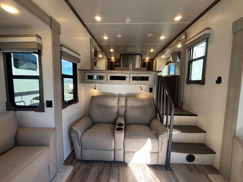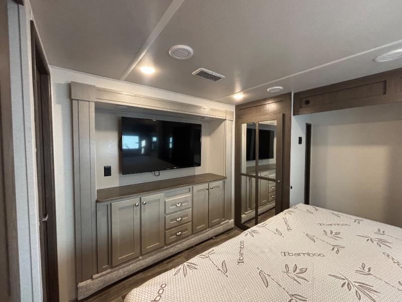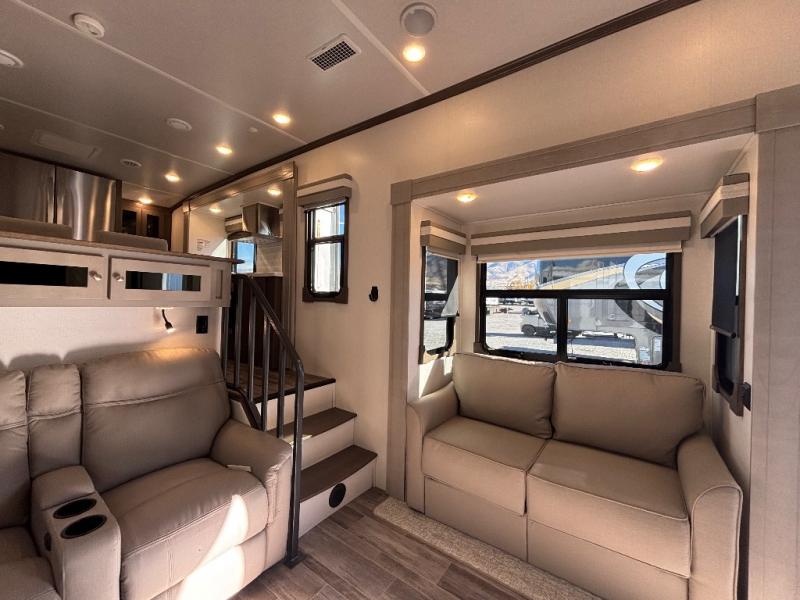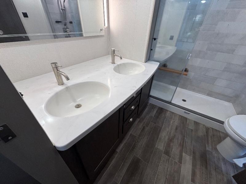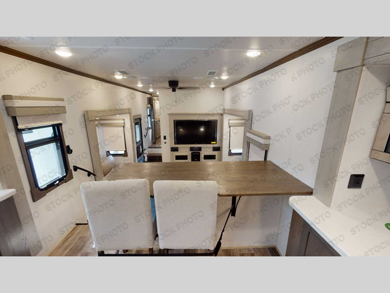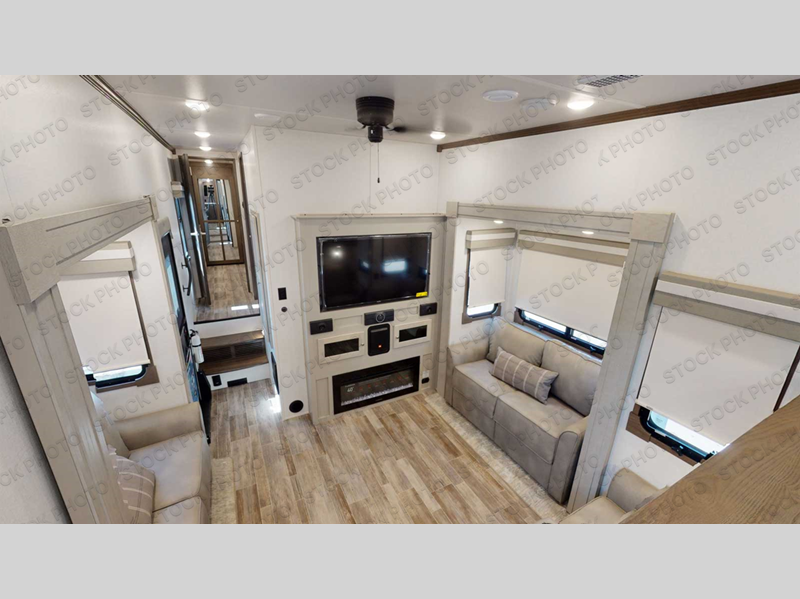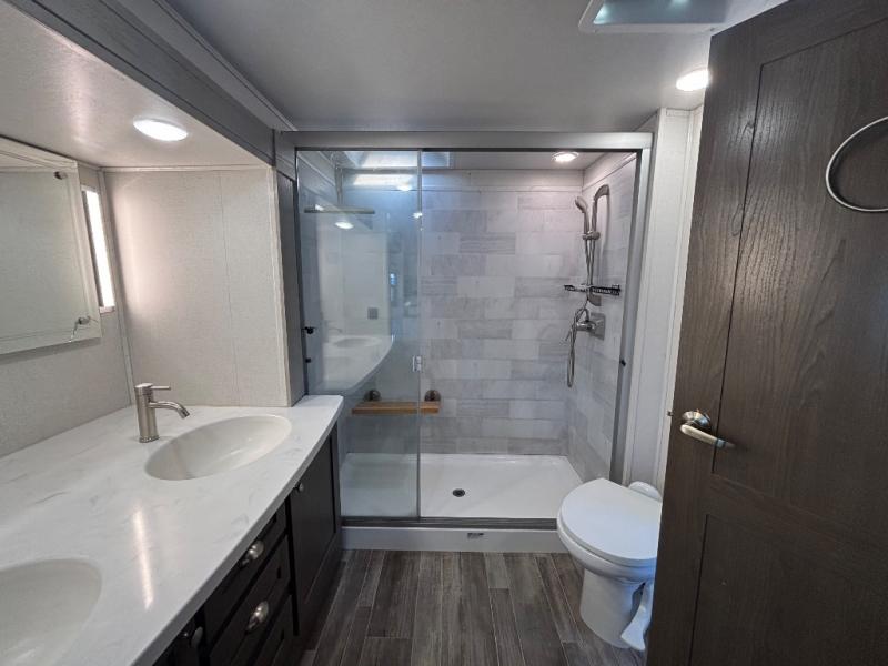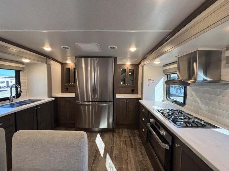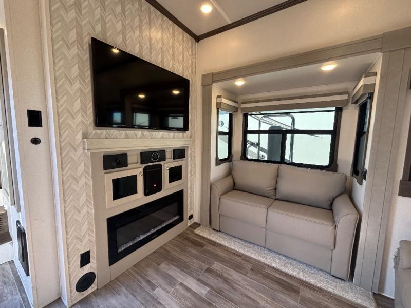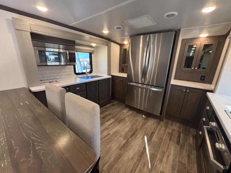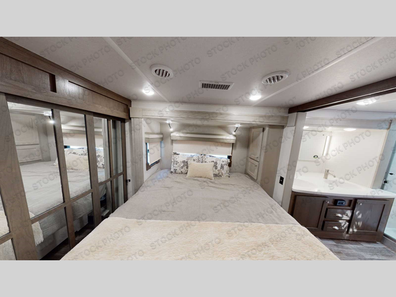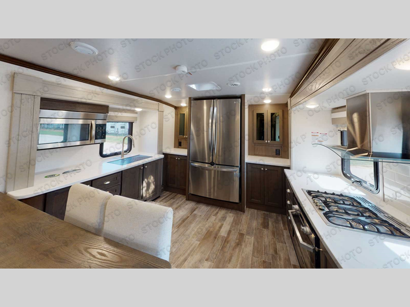 The front kitchen in this fifth wheel is a chef's dream come true while camping! It has prep stations on either side of the 20 cu. ft. stainless steel refrigerator, plenty of countertop space on either side of the four burner Insignia cooktop, and even countertop space by the large single bowl stainless steel sink, plus there is a high top table with two bar stools that overlooks the living area. Inside the living area there are opposing 60" split tri-fold sofa slides and a 65" power theater seating across from an entertainment center with an electric fireplace and a 50" TV with JBL sound system. The dual entry bathroom has a dual sink vanity so two to can get ready at once, a large signature spa shower with a teak flip up seat, a closet, and a linen area to keep your towels close. The rear private bedroom will have you feeling right at home with a king bed slide across from a wardrobe slide and a second wardrobe with mirrored sliding doors, as well as an area prepped to add an optional washer and dryer!