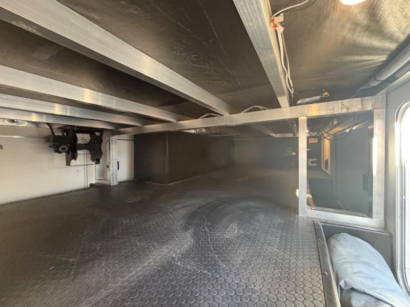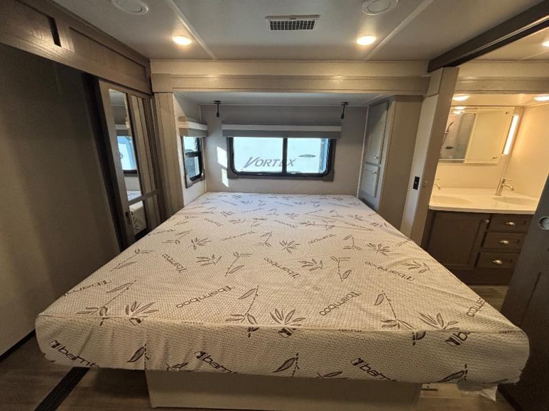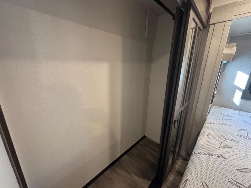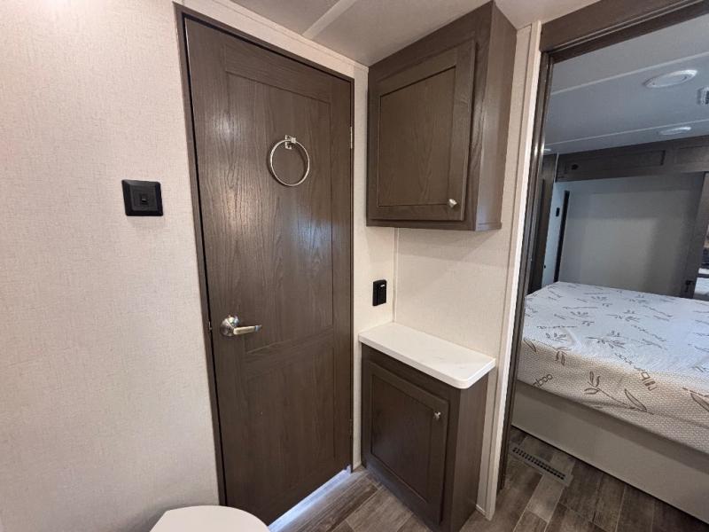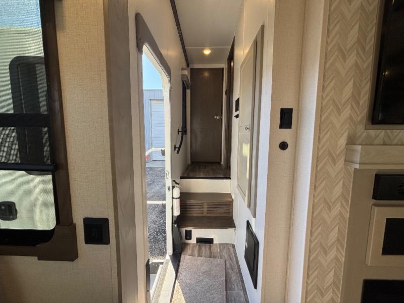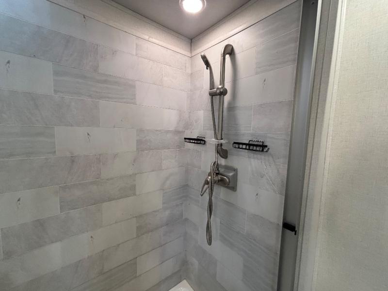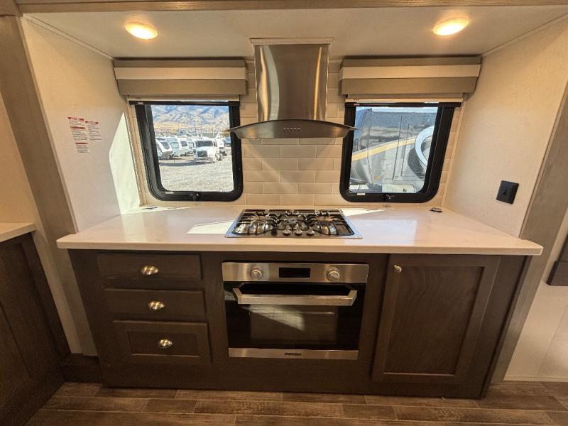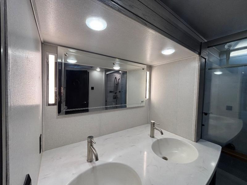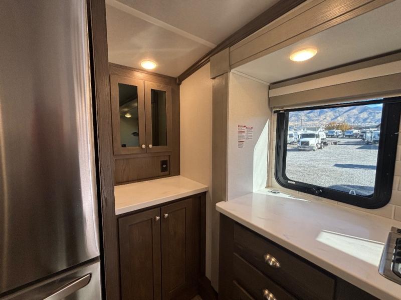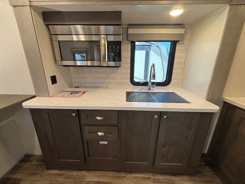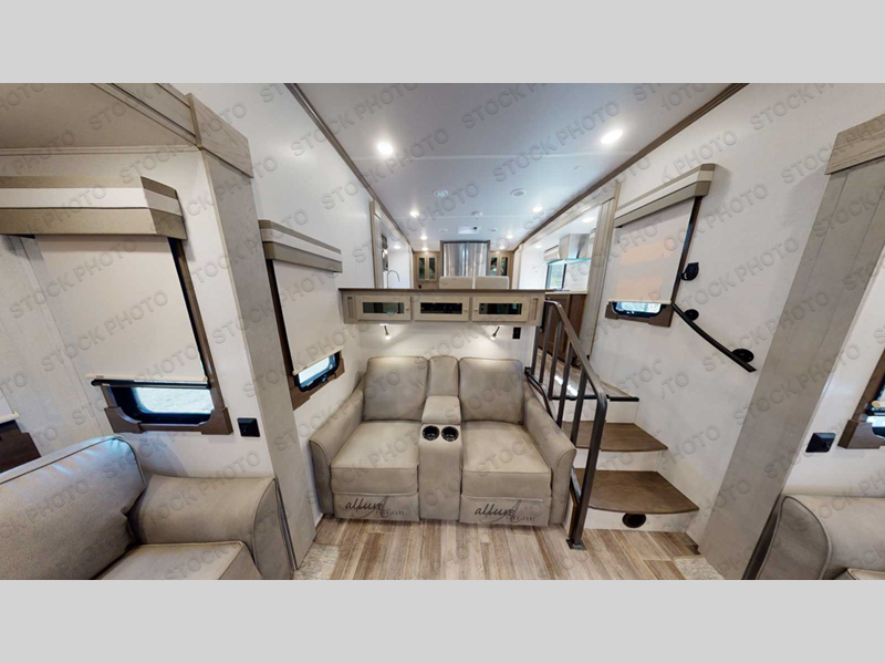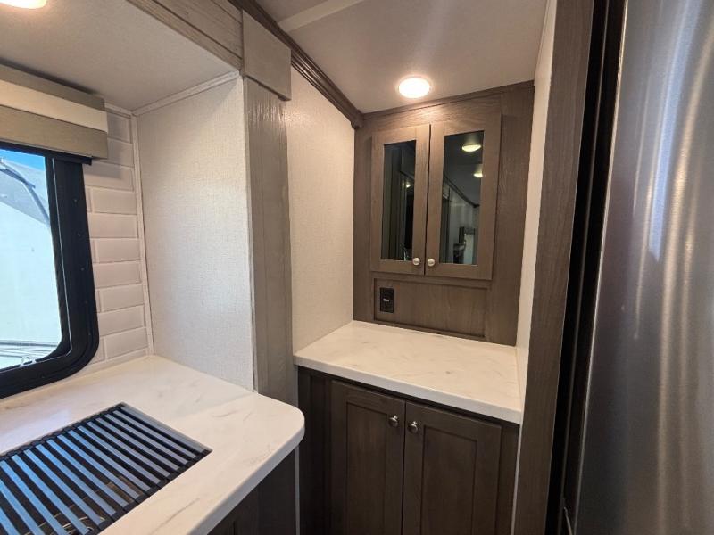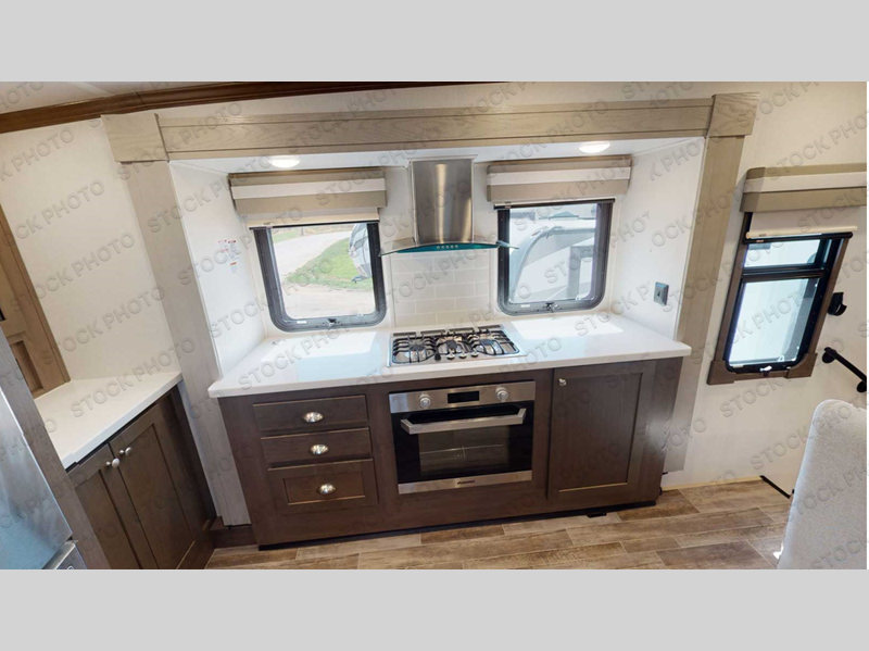 The front kitchen in this fifth wheel is a chef's dream come true while camping! It has prep stations on either side of the 20 cu. ft. stainless steel refrigerator, plenty of countertop space on either side of the four burner Insignia cooktop, and even countertop space by the large single bowl stainless steel sink, plus there is a high top table with two bar stools that overlooks the living area. Inside the living area there are opposing 60" split tri-fold sofa slides and a 65" power theater seating across from an entertainment center with an electric fireplace and a 50" TV with JBL sound system. The dual entry bathroom has a dual sink vanity so two to can get ready at once, a large signature spa shower with a teak flip up seat, a closet, and a linen area to keep your towels close. The rear private bedroom will have you feeling right at home with a king bed slide across from a wardrobe slide and a second wardrobe with mirrored sliding doors, as well as an area prepped to add an optional washer and dryer!