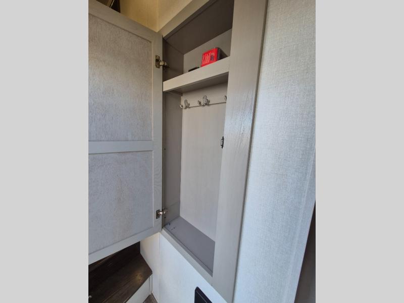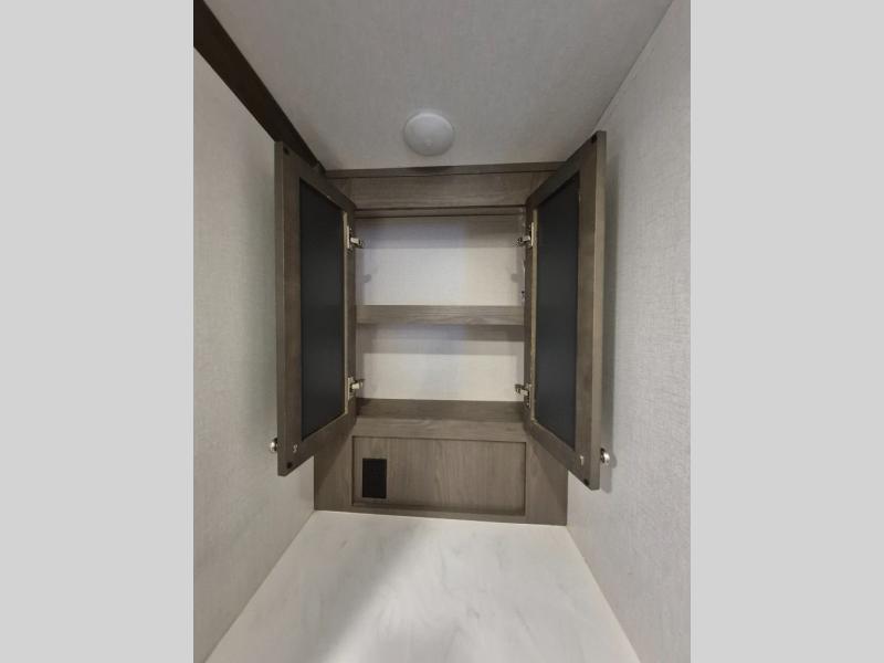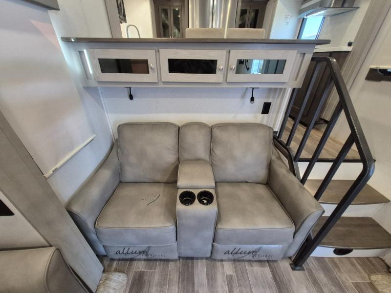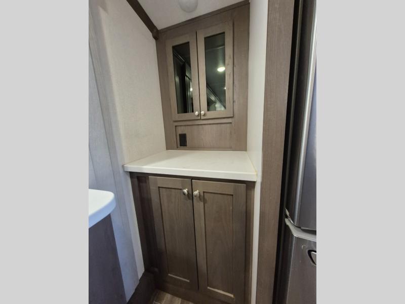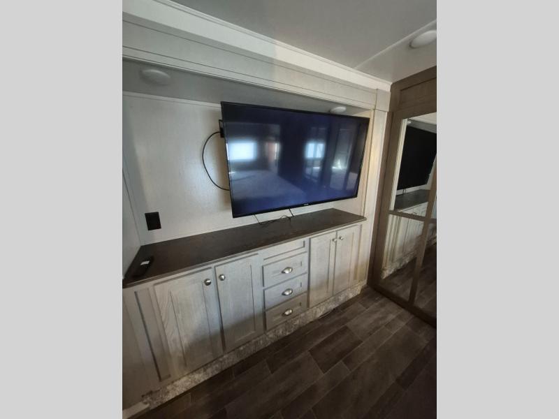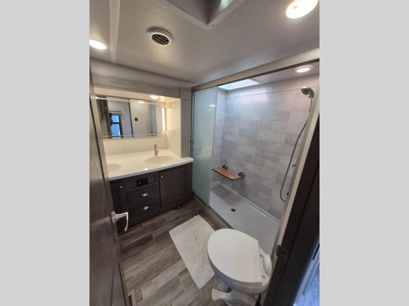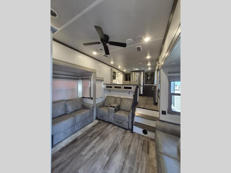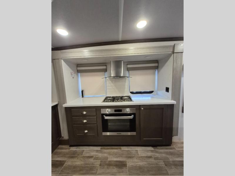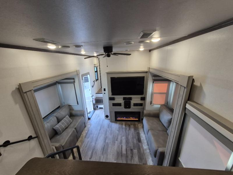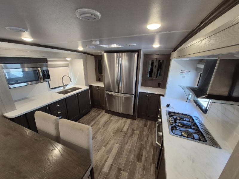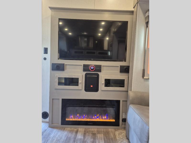 The front kitchen in this fifth wheel is a chef's dream come true while camping! It has prep stations on either side of the 20 cu. ft. stainless steel refrigerator, plenty of countertop space on either side of the four burner Insignia cooktop, and even countertop space by the large single bowl stainless steel sink, plus there is a high top table with two bar stools that overlooks the living area. Inside the living area there are opposing 60" split tri-fold sofa slides and a 65" power theater seating across from an entertainment center with an electric fireplace and a 50" TV with JBL sound system. The dual entry bathroom has a dual sink vanity so two to can get ready at once, a large signature spa shower with a teak flip up seat, a closet, and a linen area to keep your towels close. The rear private bedroom will have you feeling right at home with a king bed slide across from a wardrobe slide and a second wardrobe with mirrored sliding doors, as well as an area prepped to add an optional washer and dryer!