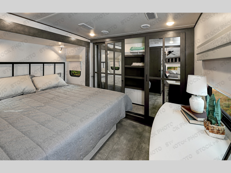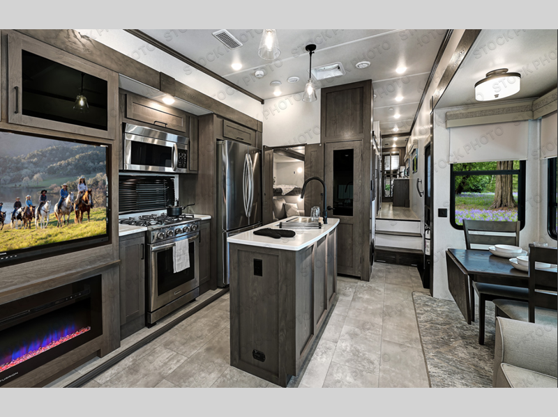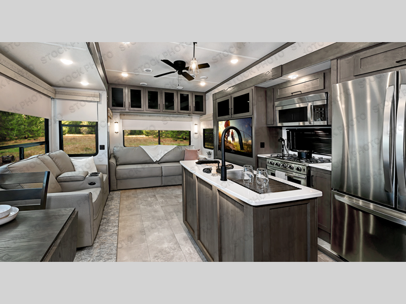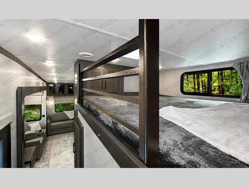 Enjoy a whole lot of comfort, convenience and residential features in this fifth wheel as you explore the outdoors at different RV parks and campgrounds. Beginning with the middle bunkhouse which offers a tri-fold sofa slide with a flip bunk above and lots of storage to utilize this room as a bedroom for your family and friends, and a second living area and/or office for yourself, plus the loft above that provides storage space or extra sleeping space. The full bathroom is between this area and the front bedroom which provides an oasis with a king bed slide, two wardrobes and a space prepped for a washer/dryer option. Everyone can relax and visit in the rear living area with a split tri-fold sofa, and power theater seats plus a free-standing table with chairs. And the cook will love the kitchen with all the residential features including the four burner gas cooktop, plus the choice to use the outside kitchen for a few meals as well.