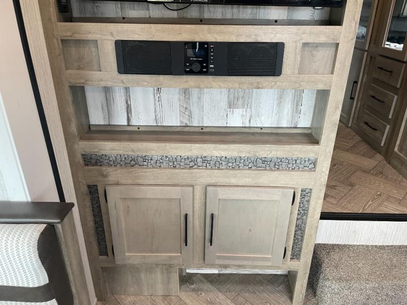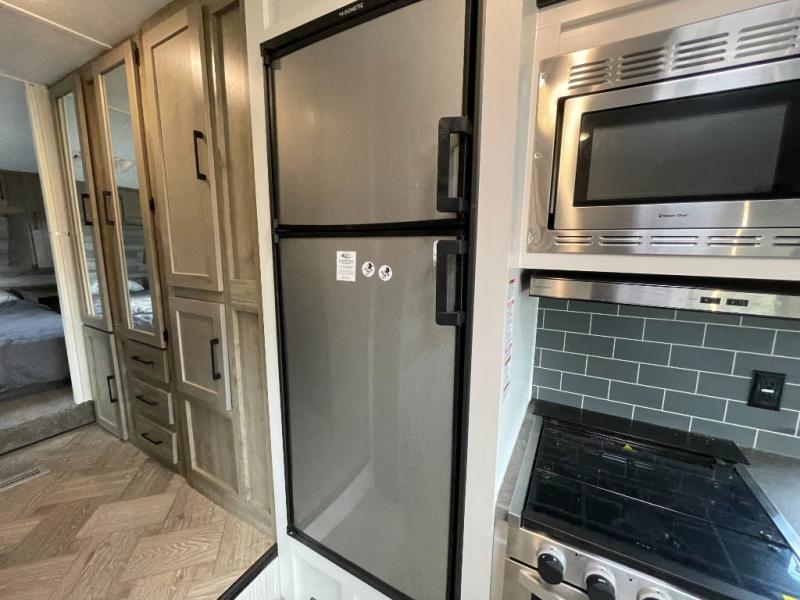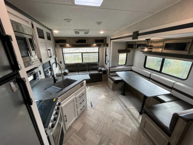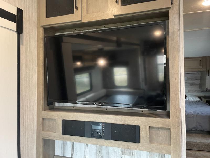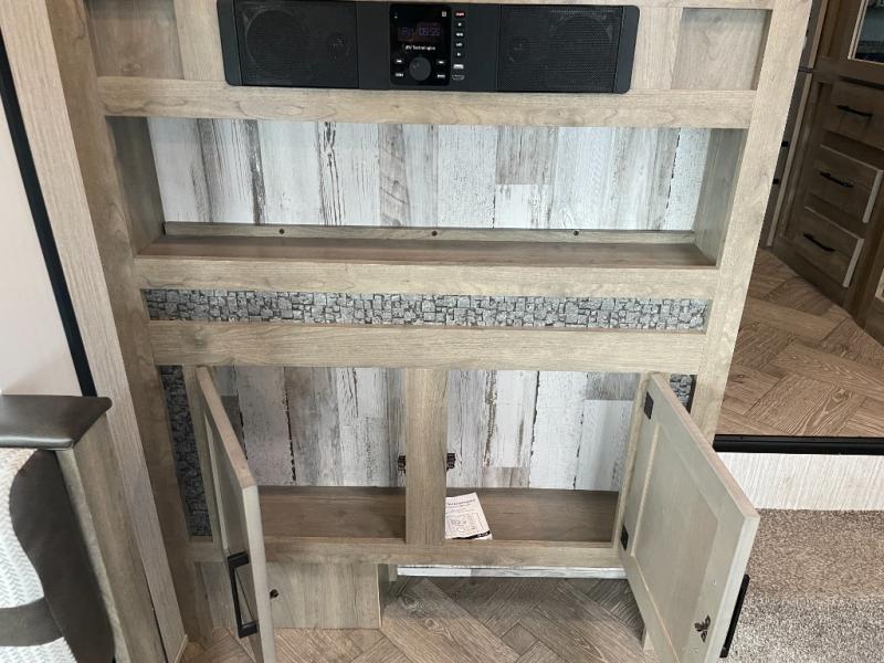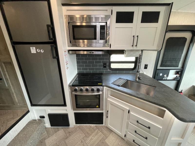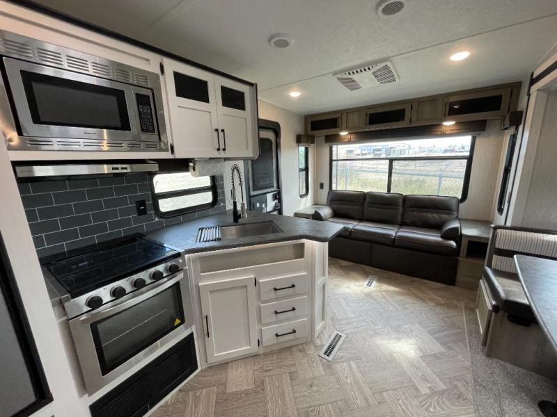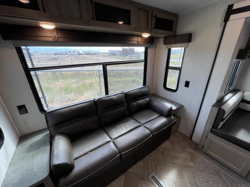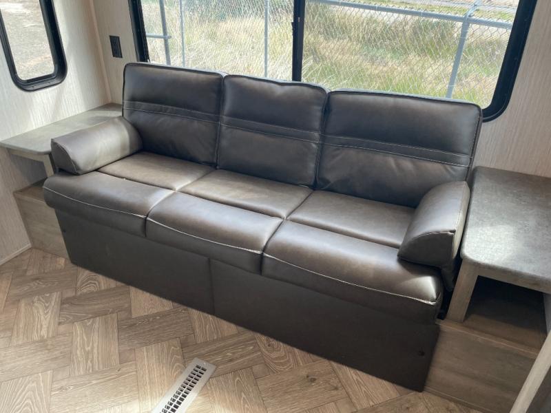 Pack your bags and hitch up this fifth wheel for a fun adventure! It comes with comfortable standard features but many optional features to fit your needs better like the optional recliner chairs in place of the rear sofa, the optional table and chairs in place of the U-shaped dinette, and the optional exterior micro kitchen with griddle. The inside kitchen has everything you need to prepare your best home cooked meals and an entertainment center to have your favorite movie playing in the background while you cook. There is a 32" x 32" radius shower in the full bathroom to freshen up after a fun day at the beach, and the front private bedroom has a privacy curtain to draw when you're ready to lay down on the queen bed with shirt closets on either side!