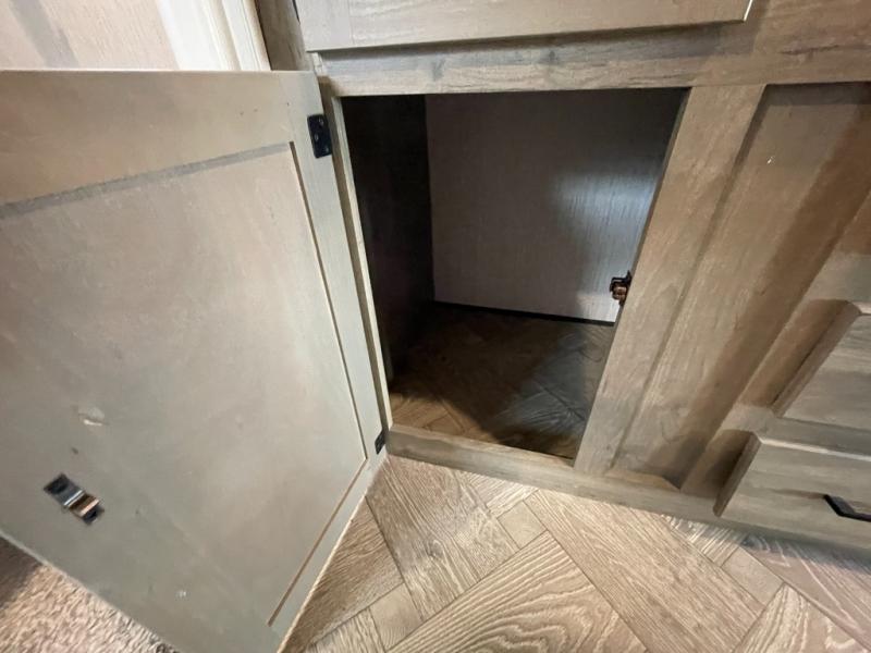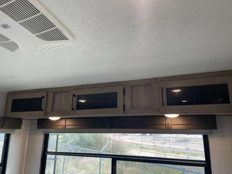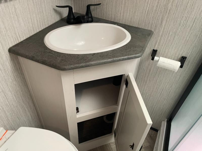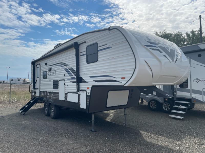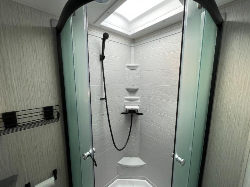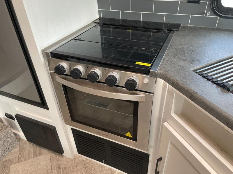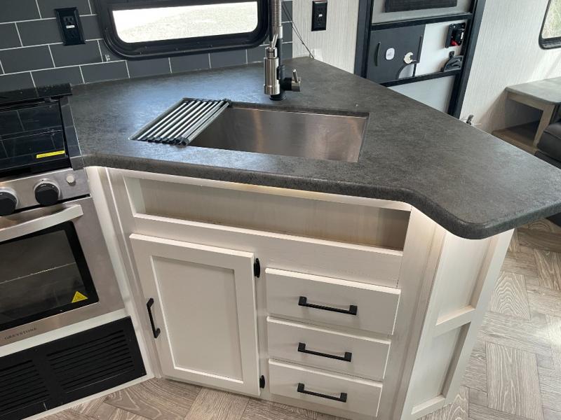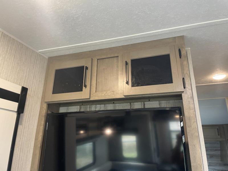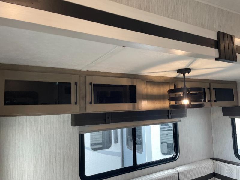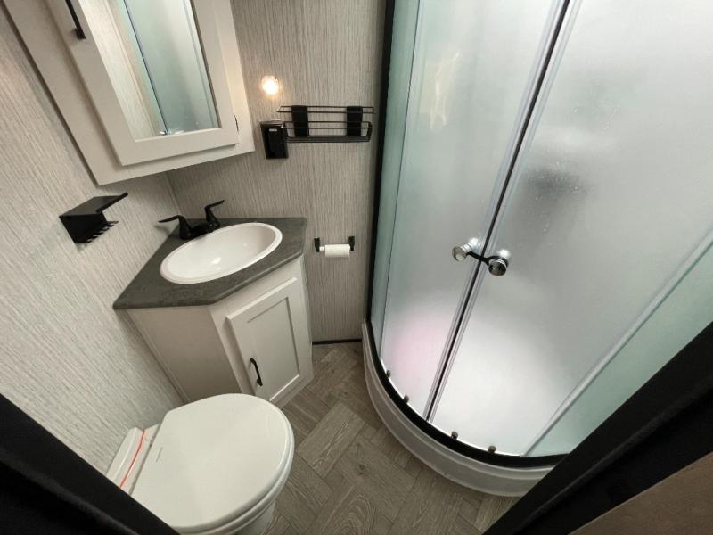 Pack your bags and hitch up this fifth wheel for a fun adventure! It comes with comfortable standard features but many optional features to fit your needs better like the optional recliner chairs in place of the rear sofa, the optional table and chairs in place of the U-shaped dinette, and the optional exterior micro kitchen with griddle. The inside kitchen has everything you need to prepare your best home cooked meals and an entertainment center to have your favorite movie playing in the background while you cook. There is a 32" x 32" radius shower in the full bathroom to freshen up after a fun day at the beach, and the front private bedroom has a privacy curtain to draw when you're ready to lay down on the queen bed with shirt closets on either side!