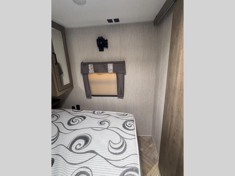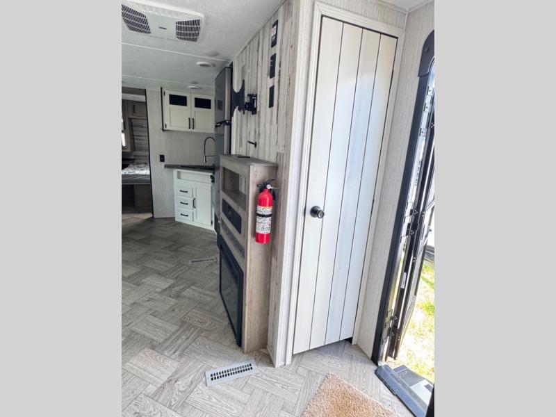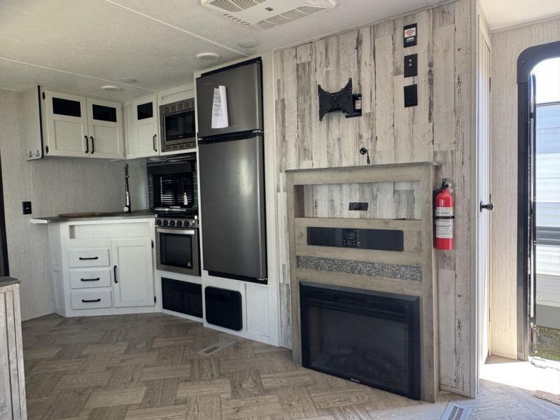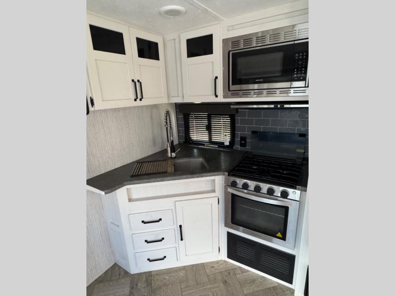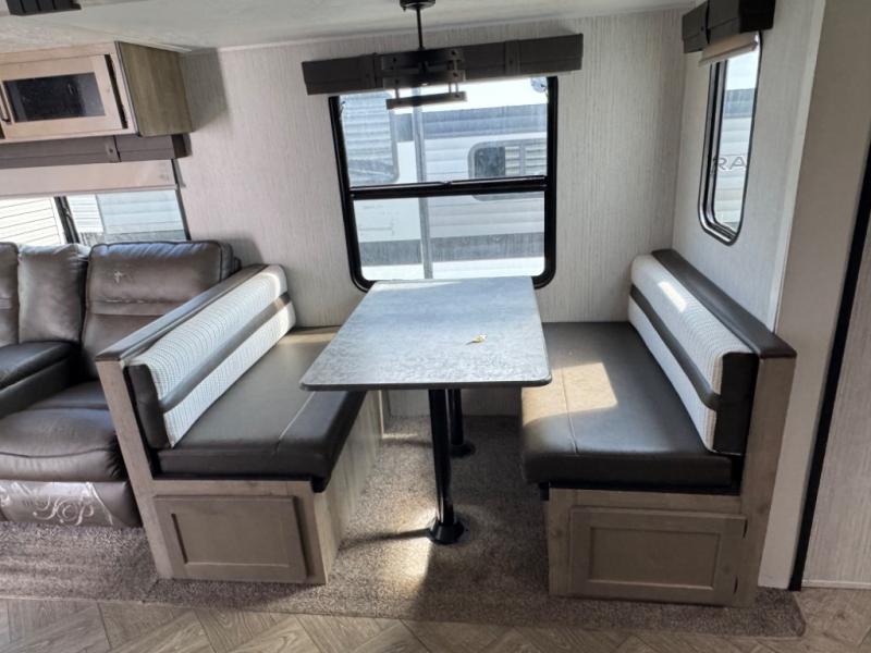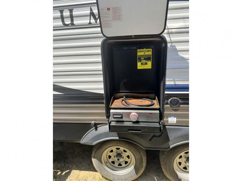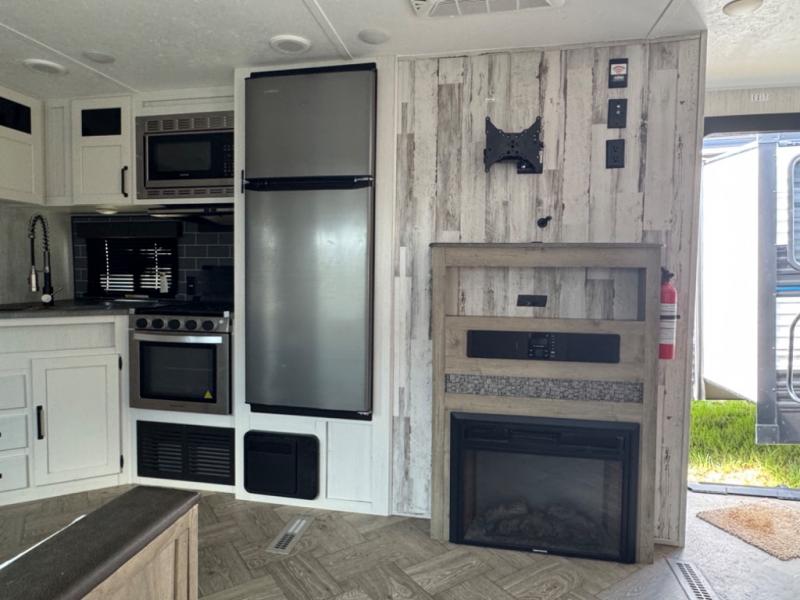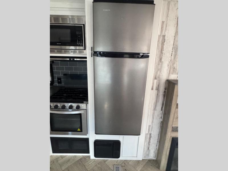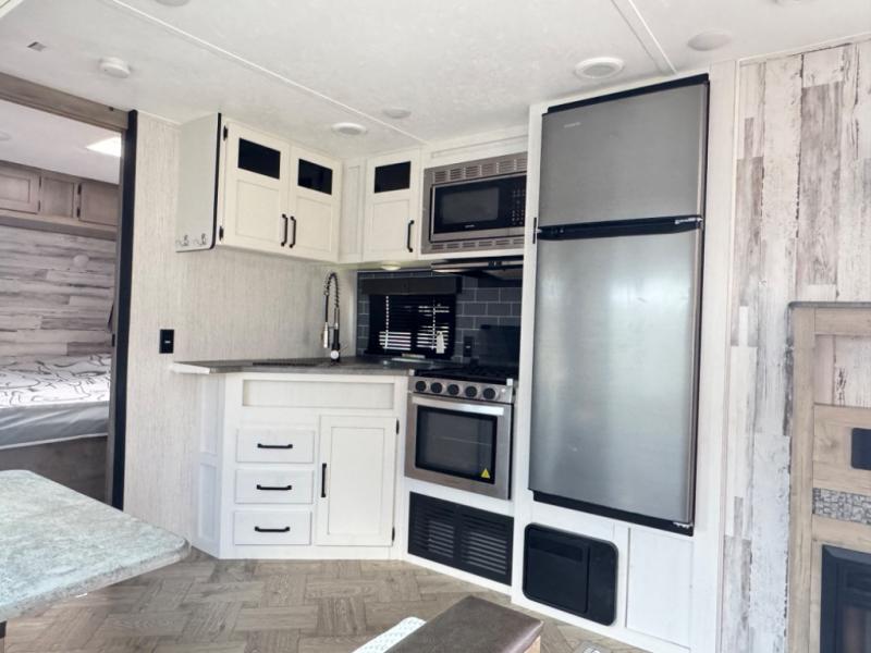 Pack your bags and hitch up this travel trailer for a great adventure! The full rear bathroom has a 32" x 40" shower with a seat and a closet for you to start each morning feeling clean and fresh. Now that you're ready for the day, grab some eggs from the 11 cu. ft. stainless steel refrigerator to fry up on the three burner cooktop and enjoy at the booth dinette. If mother nature is raining on your parade then you can relax on the sofa and watch your favorite movies with the entertainment center which has a closet/pantry behind it. You can even choose to add an optional exterior micro kitchen with griddle to enjoy breakfast outdoors!