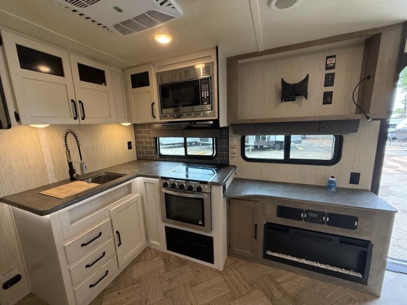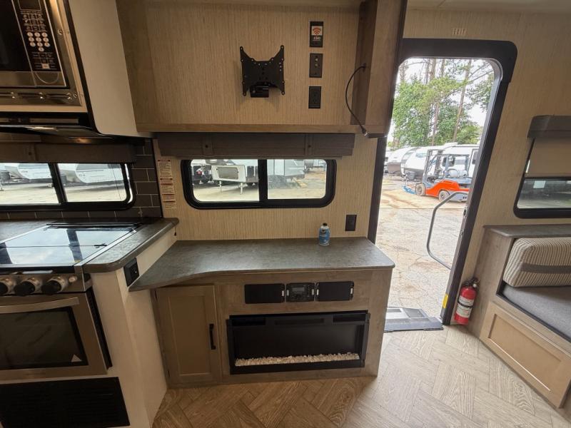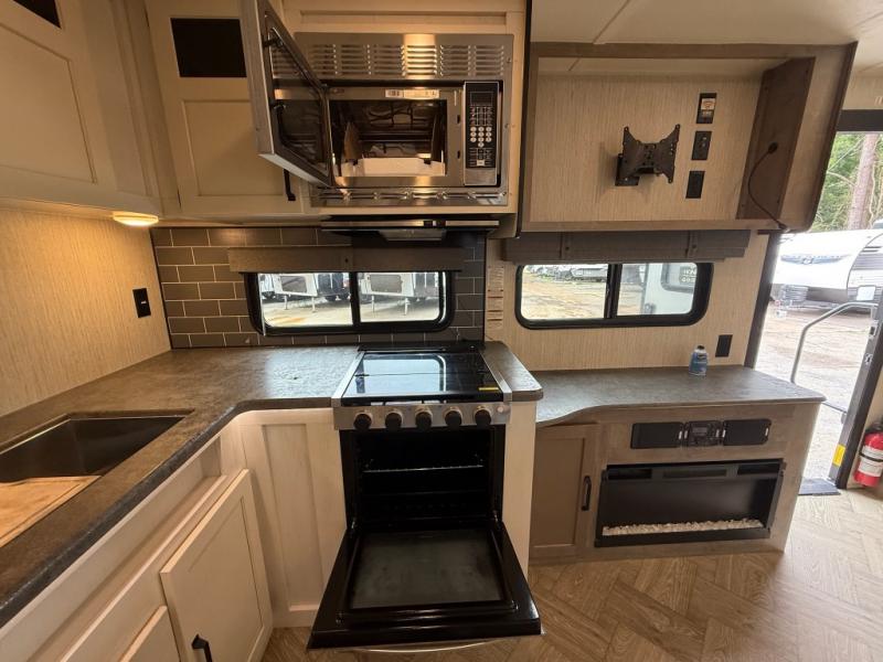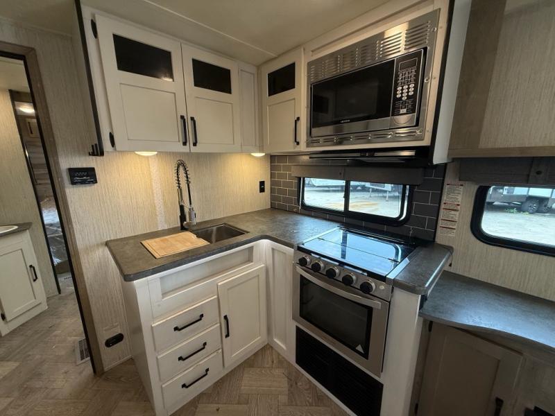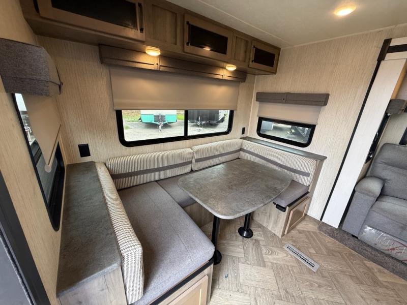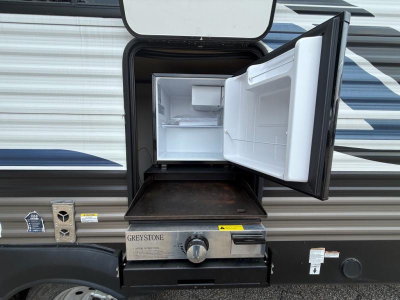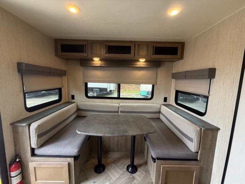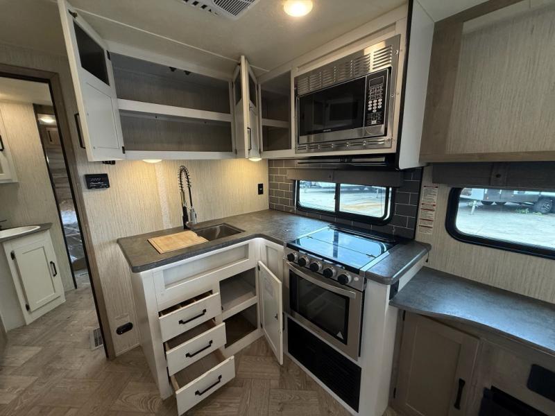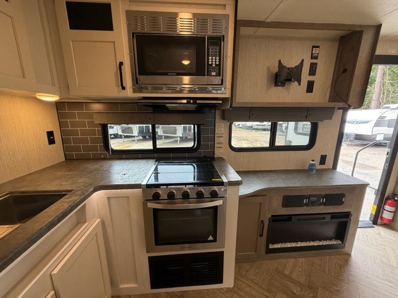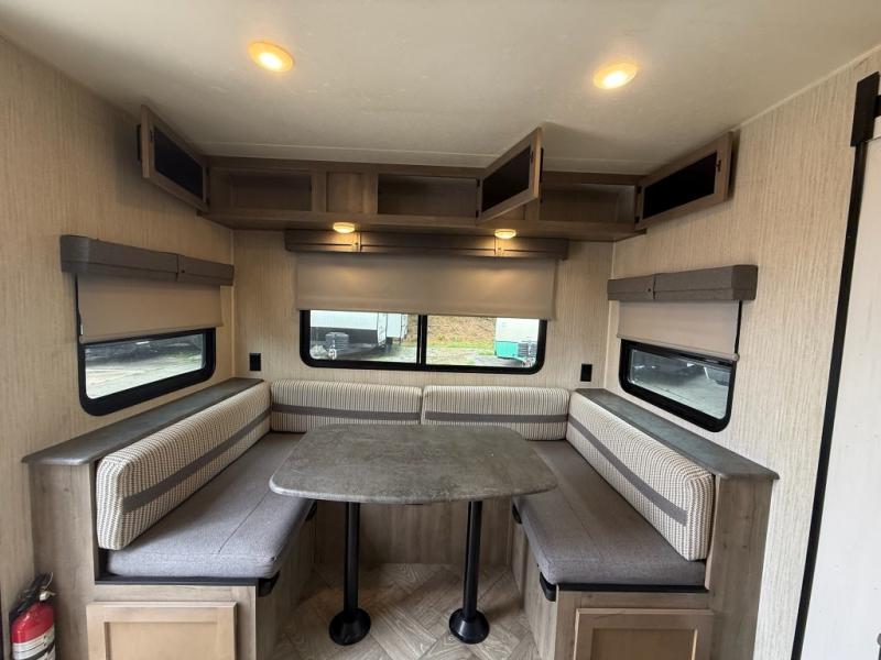 You won't believe all that this travel trailer has to offer! From the rear U-shaped dinette that is great for eating meals, playing games, and even transforming into extra sleeping spaces to the dual entry doors that will create a smooth flow of traffic in and out of the unit. The chef can prepare their best meals either indoors with the three burner cooktop or add the optional exterior micro kitchen with griddle to breathe some fresh air in while they cook. The walk-through bathroom is easy for everyone to access, especially those staying in the front bedroom, and has a 32" x 40" shower with a seat to freshen up in each morning!