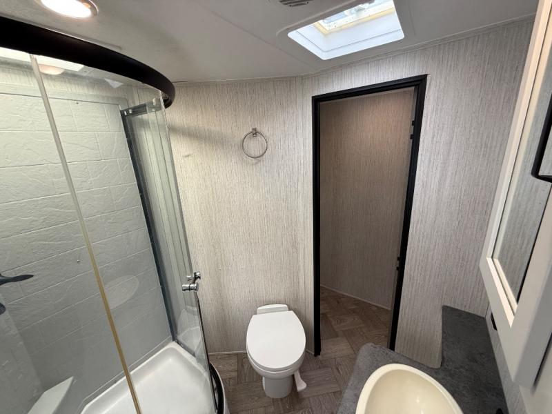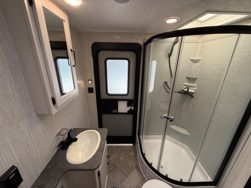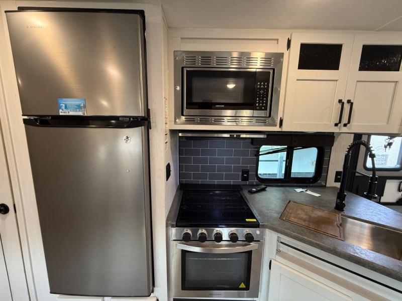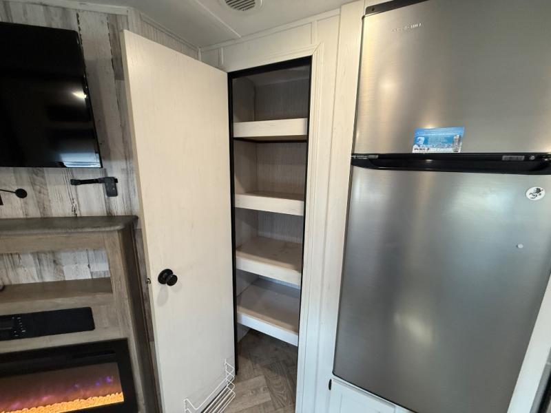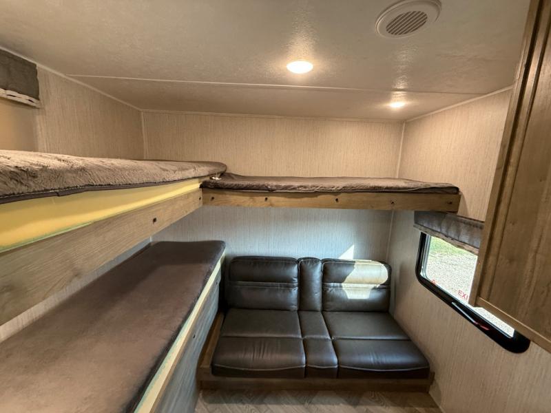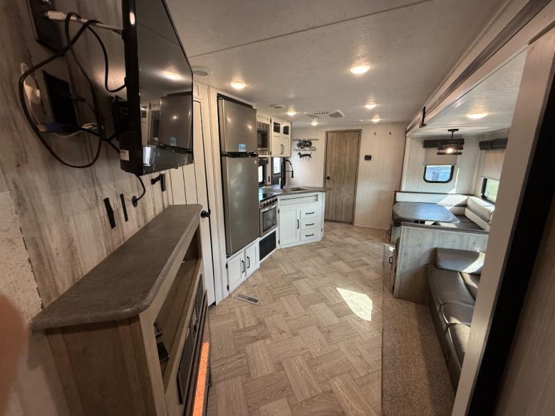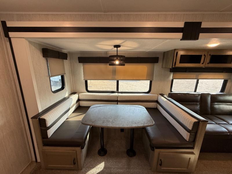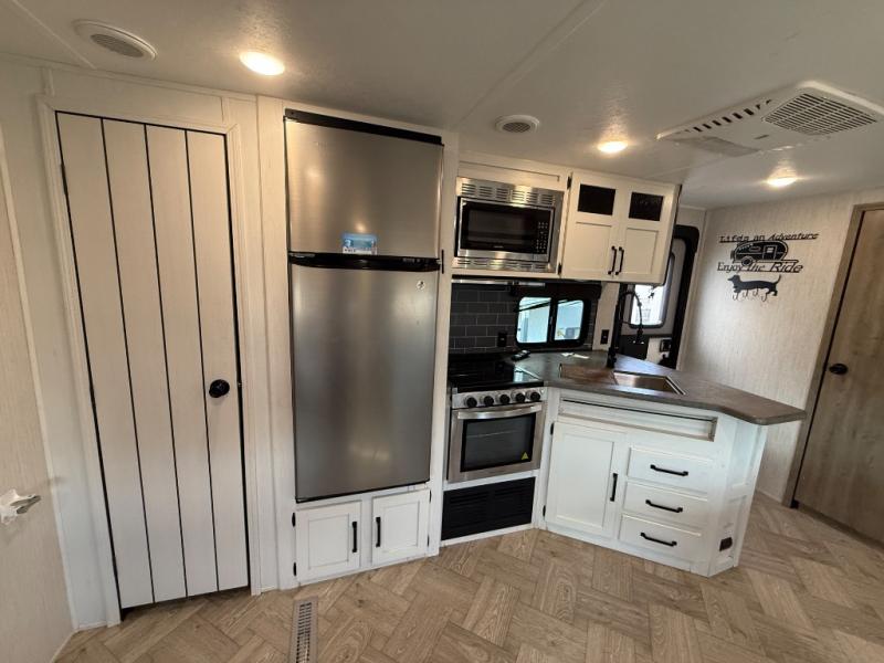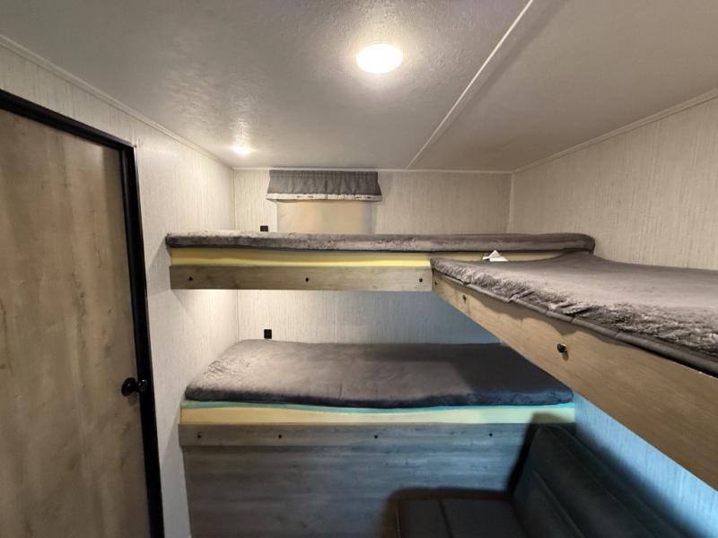 There's a comfortable place to sleep for the whole family in this travel trailer! The rear private bunkhouse has a set of 28" x 76" bunk beds, a 28" x 65" bunk above a sofa, and a wardrobe with an entertainment center above it so they can bring a cousin or two to join in on the fun. You will have your own privacy with the front private bedroom which has a queen bed with shirt closets and nightstands on either side of it. The dual entry bathroom has a 34" x 34" radius shower for everyone to freshen up and one of the entrances leads directly outside so you can get back to having fun fast. Prepare your best home cooked meals indoors with the walk-in pantry, the three burner cooktop, and the 11 cu. ft. stainless steel refrigerator or at the optional exterior mini camp kitchen with griddle. Plus, there is a U-shaped dinette to enjoy your meals and even transform into an extra sleeping space!