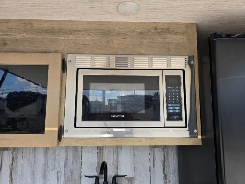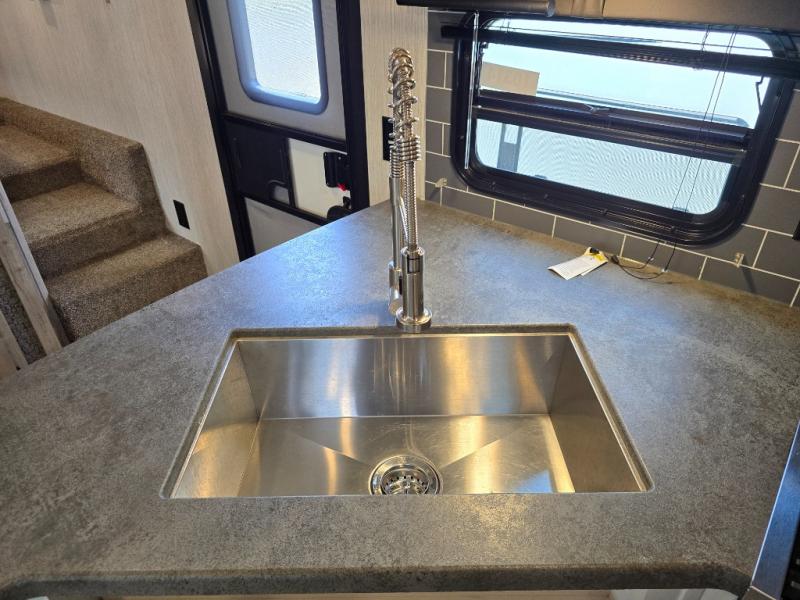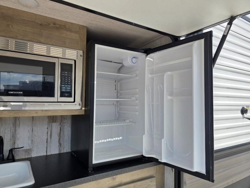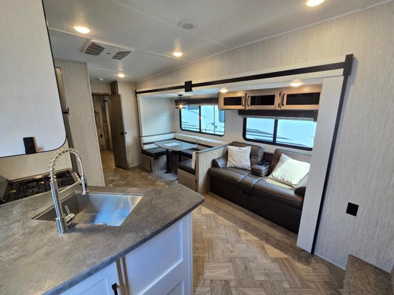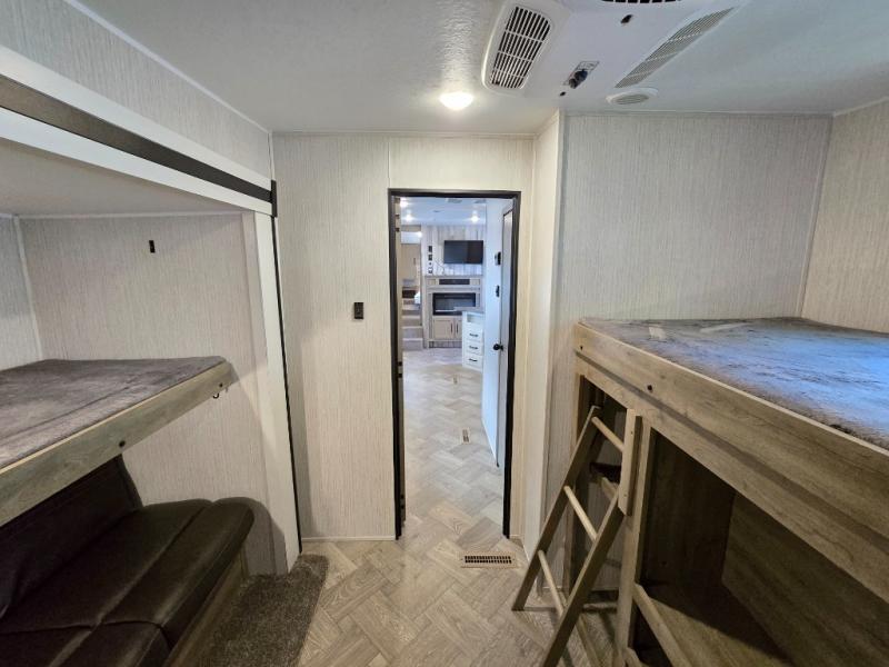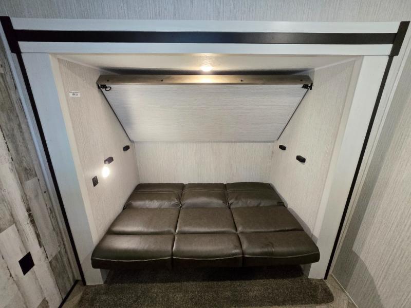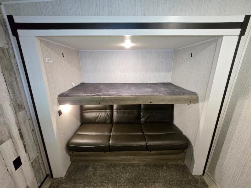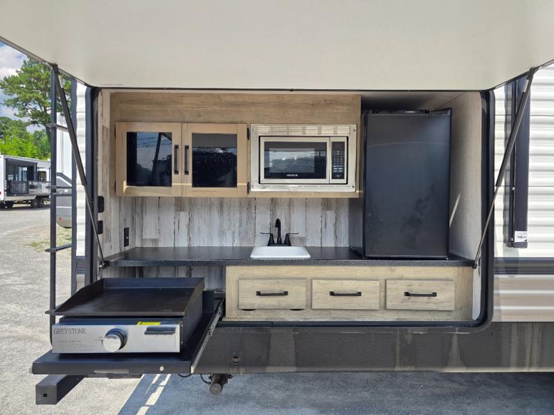 With a rear private bunkhouse in this fifth wheel, your kids or guests will have a comfortable place to lay their head at night! Inside the bunkhouse is a 38" x 76" bunk above an entertainment center and a 32" x 69" bunk above a jiffy sofa slide. The U-shaped dinette and sofa slide can also transform into extra sleeping spaces when you aren't using them to watch a movie across from the entertainment center or enjoying a meal. Everyone can stay squeaky clean with the 32" x 40" shower with a seat in the full bathroom, and their bellies full with the indoor three burner cooktop or the optional exterior mini camp kitchen with griddle for a sunrise pancake breakfast!