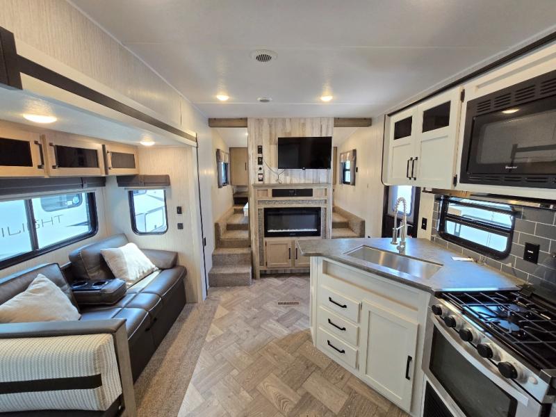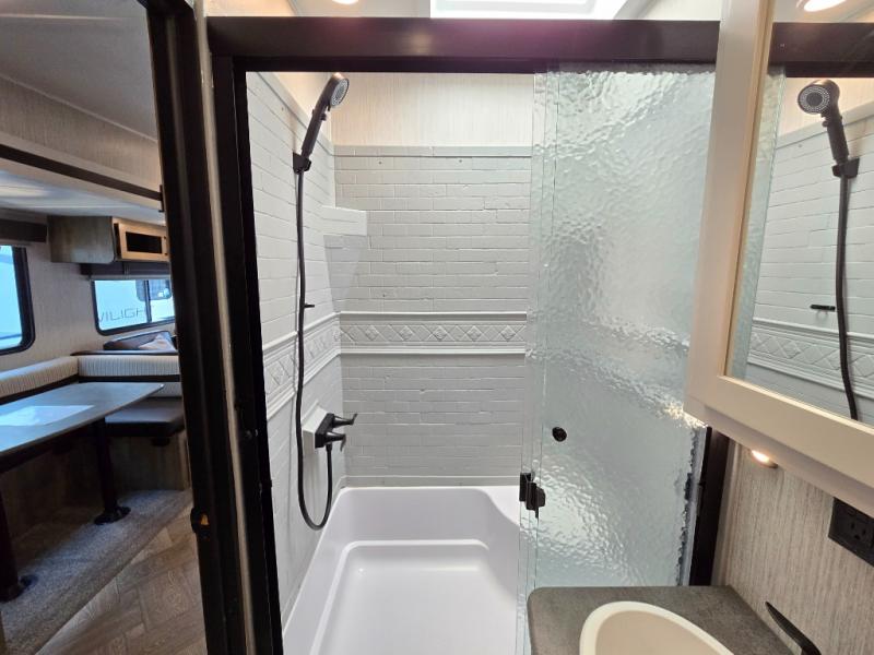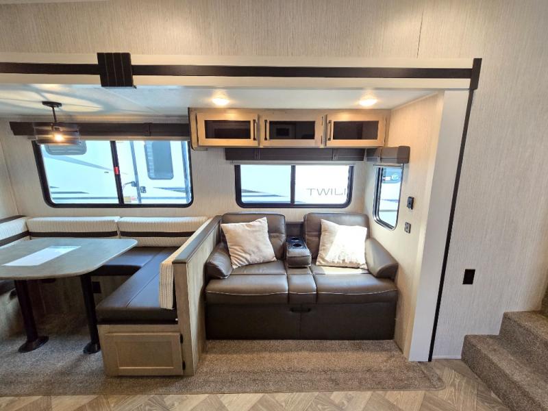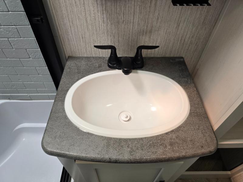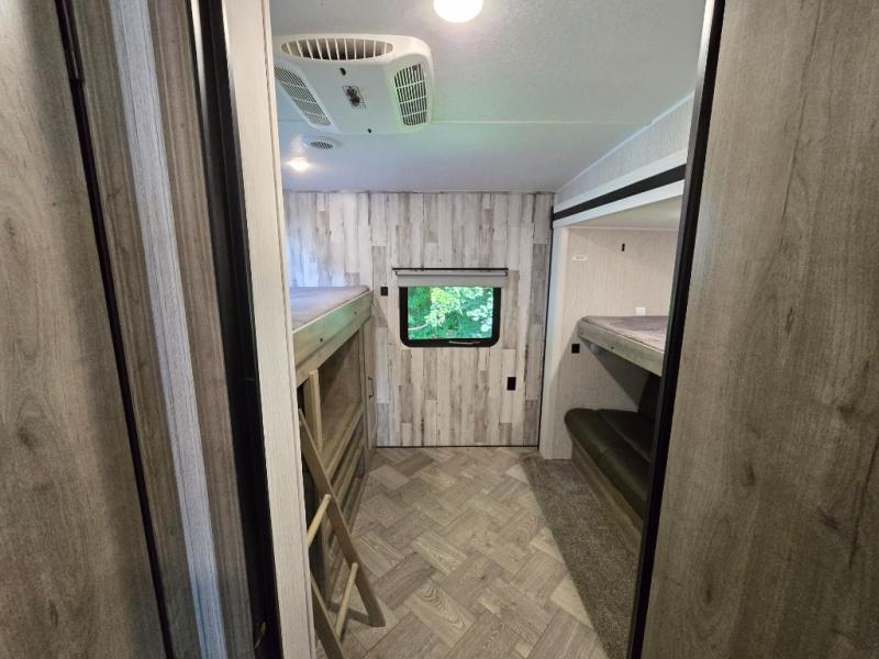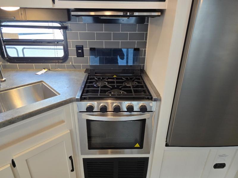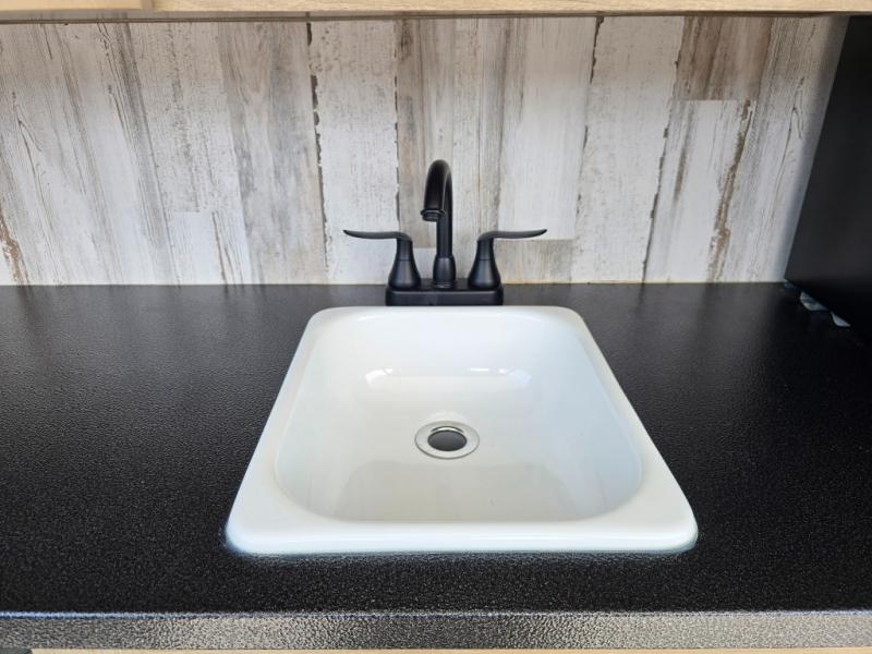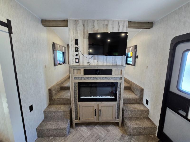 With a rear private bunkhouse in this fifth wheel, your kids or guests will have a comfortable place to lay their head at night! Inside the bunkhouse is a 38" x 76" bunk above an entertainment center and a 32" x 69" bunk above a jiffy sofa slide. The U-shaped dinette and sofa slide can also transform into extra sleeping spaces when you aren't using them to watch a movie across from the entertainment center or enjoying a meal. Everyone can stay squeaky clean with the 32" x 40" shower with a seat in the full bathroom, and their bellies full with the indoor three burner cooktop or the optional exterior mini camp kitchen with griddle for a sunrise pancake breakfast!