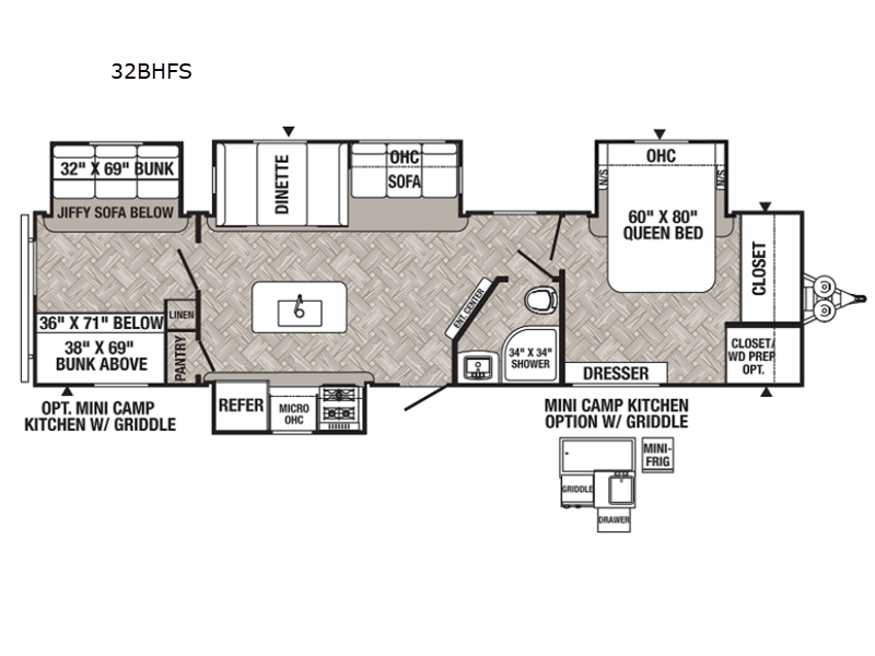 You will be the talk of the campground with this travel trailer! The front private bedroom has a queen bed slide across from a dresser and a front closet with another closet next to it that is prepped to add an optional washer and dryer for clean clothes throughout your entire trip. Freshen up each morning in the full bathroom with the 34" x 34" radius shower then head to the kitchen to fry up some eggs on the three burner cooktop. You can enjoy your meals at the booth dinette and the kitchen island will make your clean up easier with the sink that has a high rise faucet and sprayer. There is even an optional exterior kitchen with griddle to prepare your meals in the great outdoors. The rear private bunkhouse has a 32" x 69" bunk above a jiffy sofa slide, a 38" x 69" bunk above a 36" x 71" bunk and a linen closet.