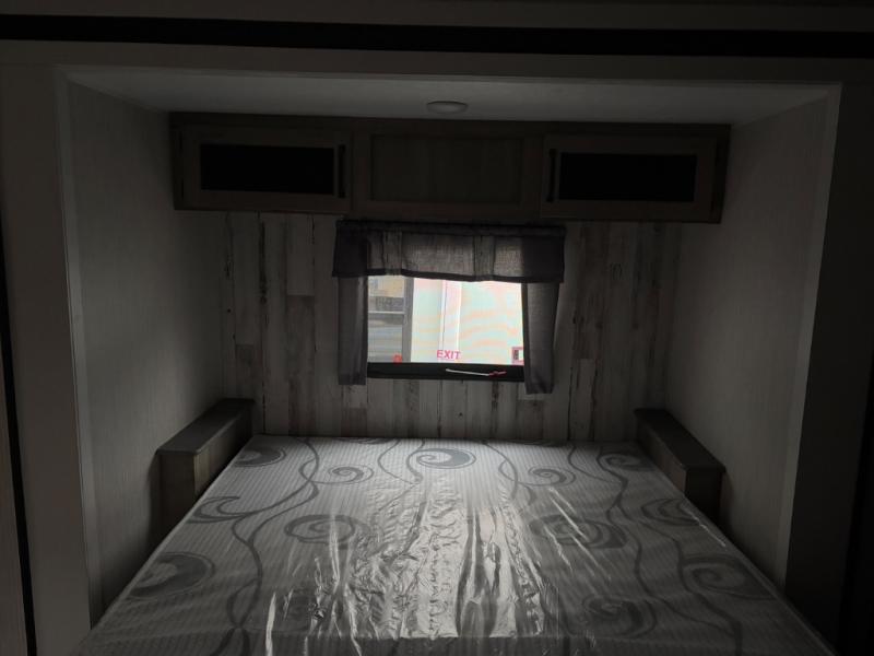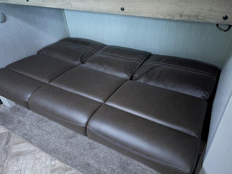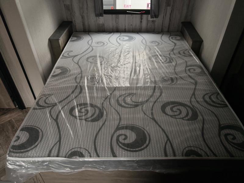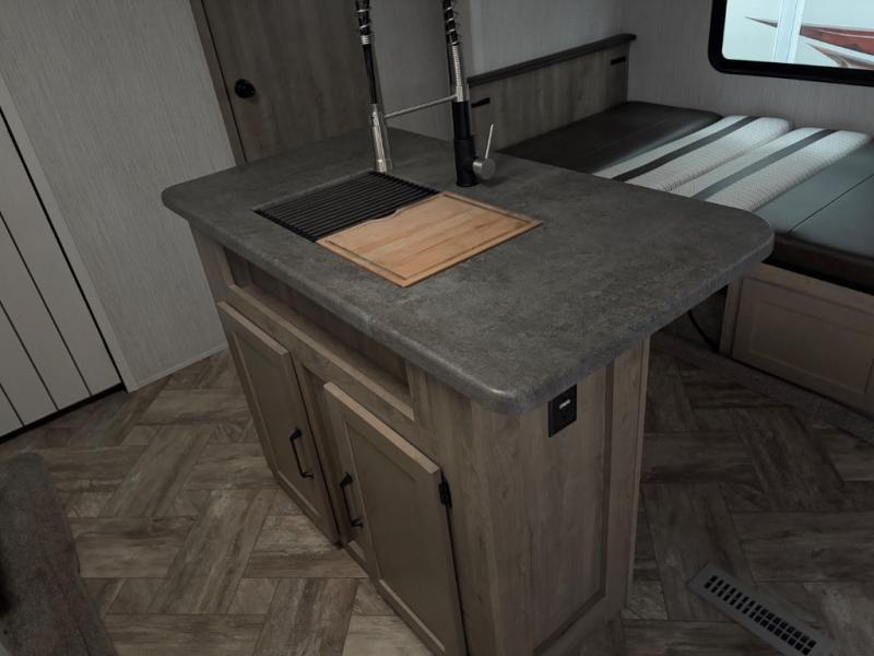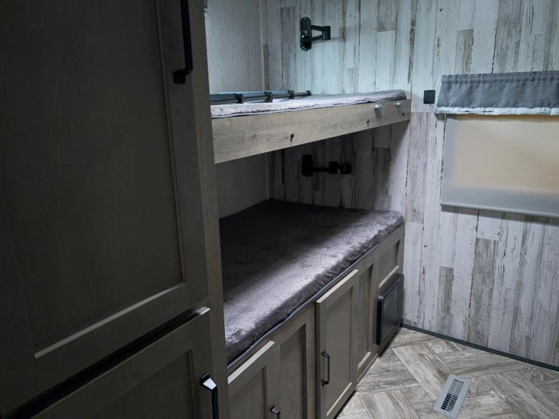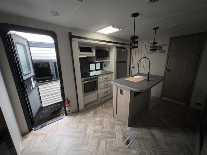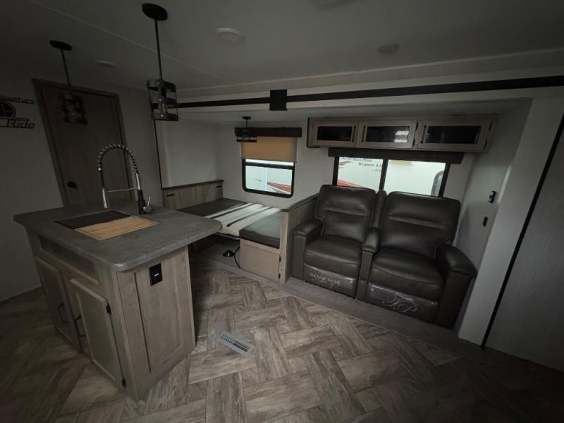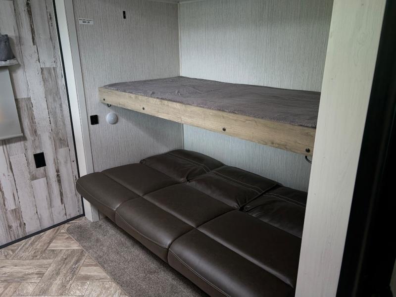 You will be the talk of the campground with this travel trailer! The front private bedroom has a queen bed slide across from a dresser and a front closet with another closet next to it that is prepped to add an optional washer and dryer for clean clothes throughout your entire trip. Freshen up each morning in the full bathroom with the 34" x 34" radius shower then head to the kitchen to fry up some eggs on the three burner cooktop. You can enjoy your meals at the booth dinette and the kitchen island will make your clean up easier with the sink that has a high rise faucet and sprayer. There is even an optional exterior kitchen with griddle to prepare your meals in the great outdoors. The rear private bunkhouse has a 32" x 69" bunk above a jiffy sofa slide, a 38" x 69" bunk above a 36" x 71" bunk and a linen closet.