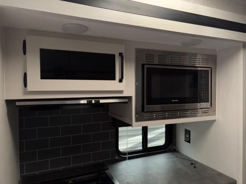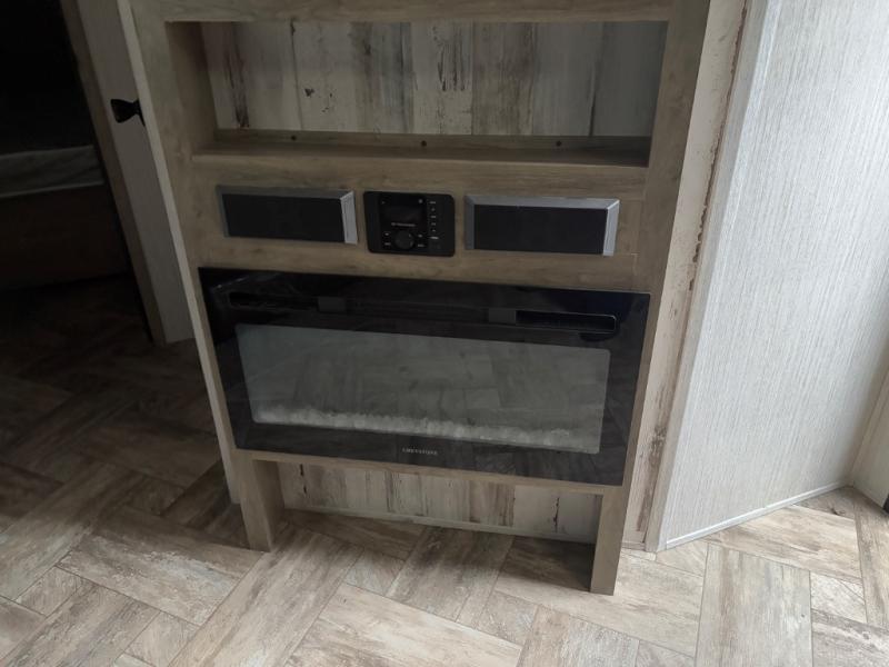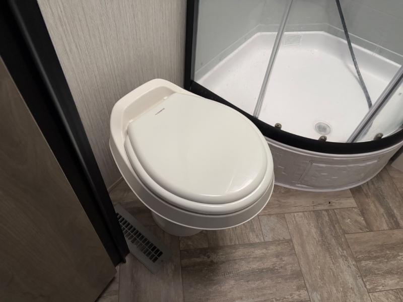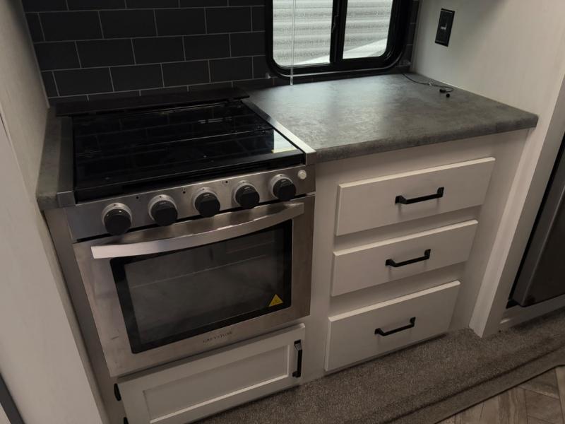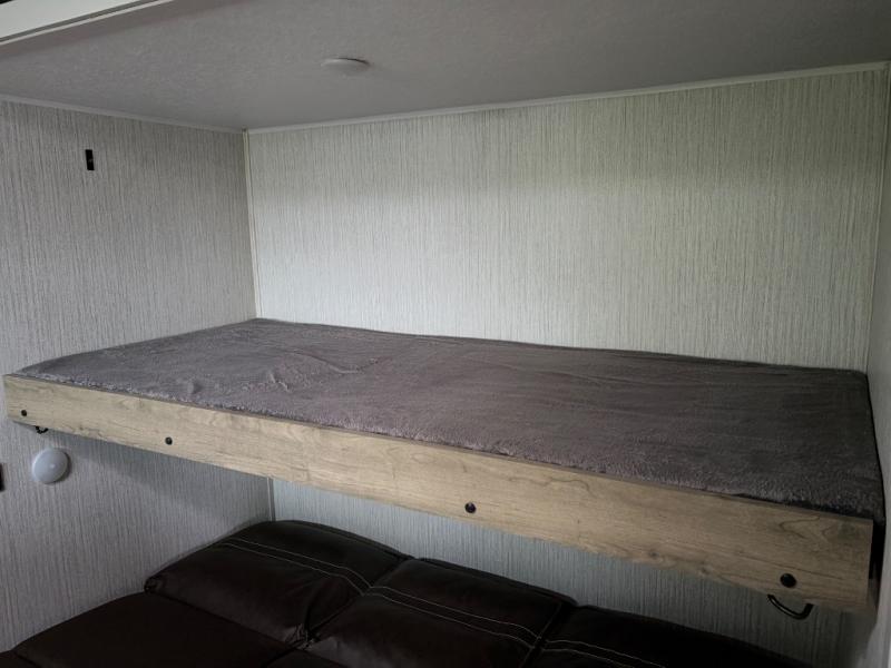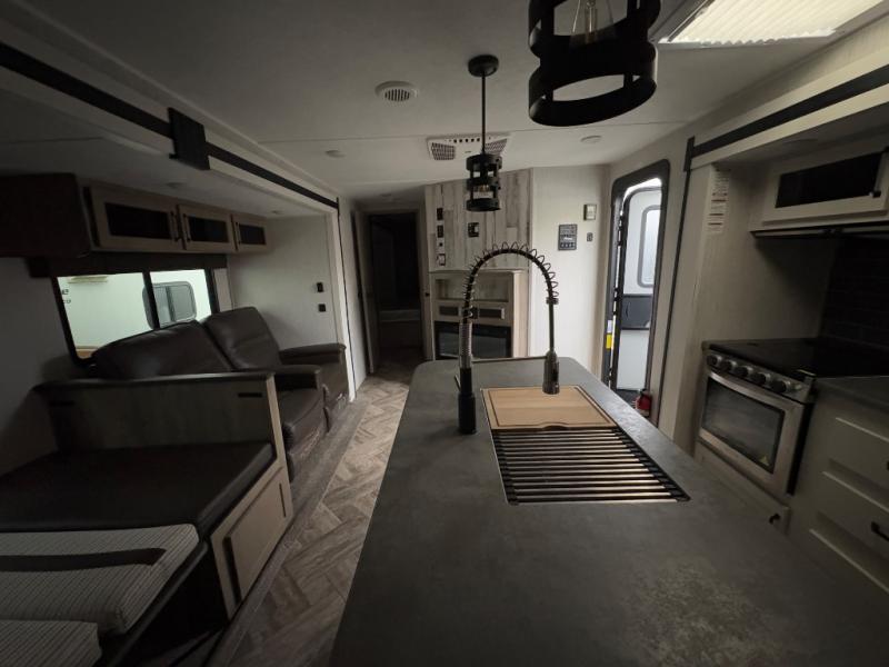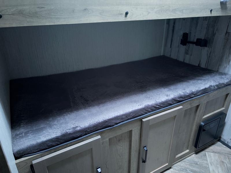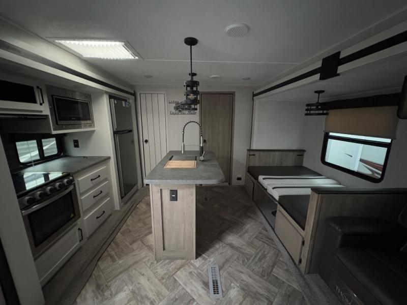 You will be the talk of the campground with this travel trailer! The front private bedroom has a queen bed slide across from a dresser and a front closet with another closet next to it that is prepped to add an optional washer and dryer for clean clothes throughout your entire trip. Freshen up each morning in the full bathroom with the 34" x 34" radius shower then head to the kitchen to fry up some eggs on the three burner cooktop. You can enjoy your meals at the booth dinette and the kitchen island will make your clean up easier with the sink that has a high rise faucet and sprayer. There is even an optional exterior kitchen with griddle to prepare your meals in the great outdoors. The rear private bunkhouse has a 32" x 69" bunk above a jiffy sofa slide, a 38" x 69" bunk above a 36" x 71" bunk and a linen closet.