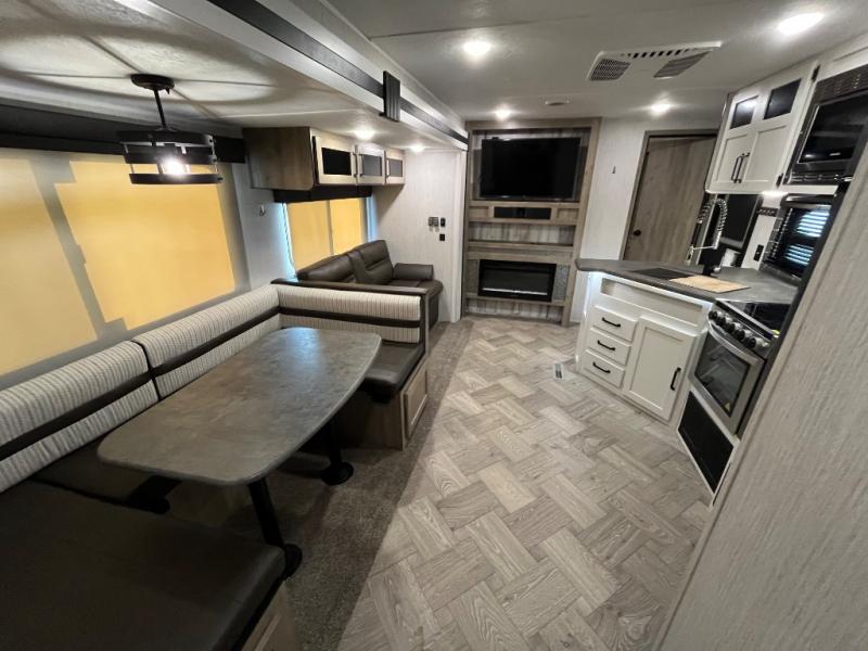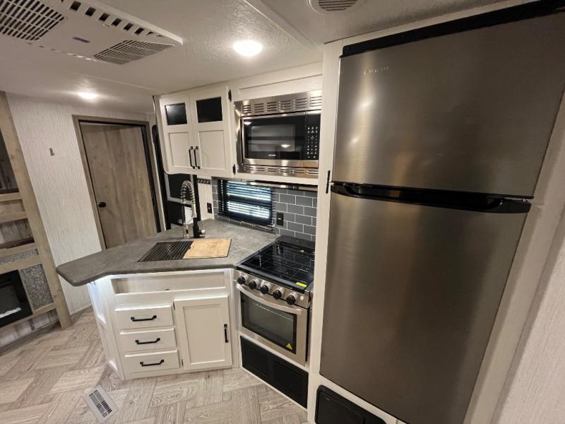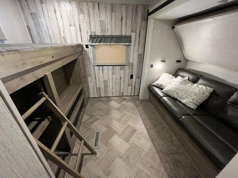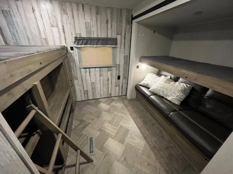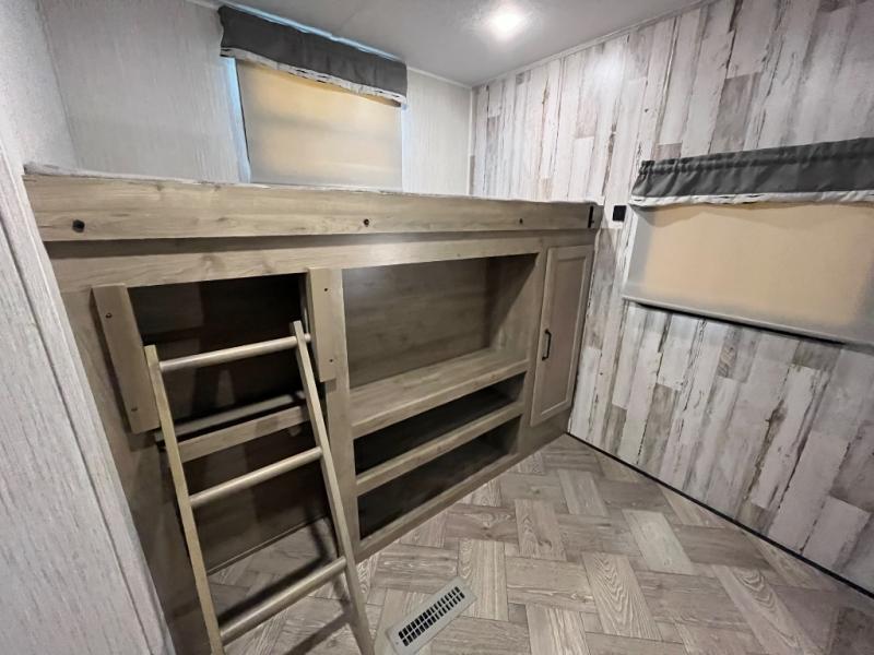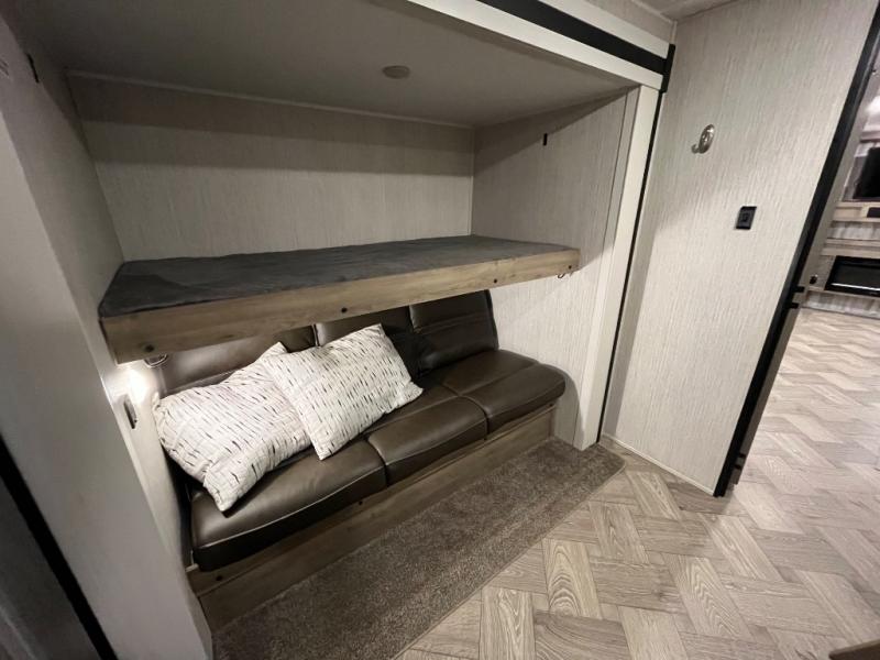 The whole family will love camping in this travel trailer! The kids will have their own privacy with the rear private bunkhouse which has a 32" x 69" bunk above a jiffy sofa slide and a 38" x 76" bunk above an entertainment center to keep them occupied on those rainy days. And you will have your own privacy with the front private bedroom that has a queen bed slide across from a dresser and a front closet with another closet next to it that is prepped to add an optional washer and dryer. Everyone can stay clean in the full bathroom with the 34" x 34" radius shower and their bellies full with a three burner cooktop. There is also an optional exterior kitchen with different layouts to choose from so you can be sure to have the one that meets your needs the best!