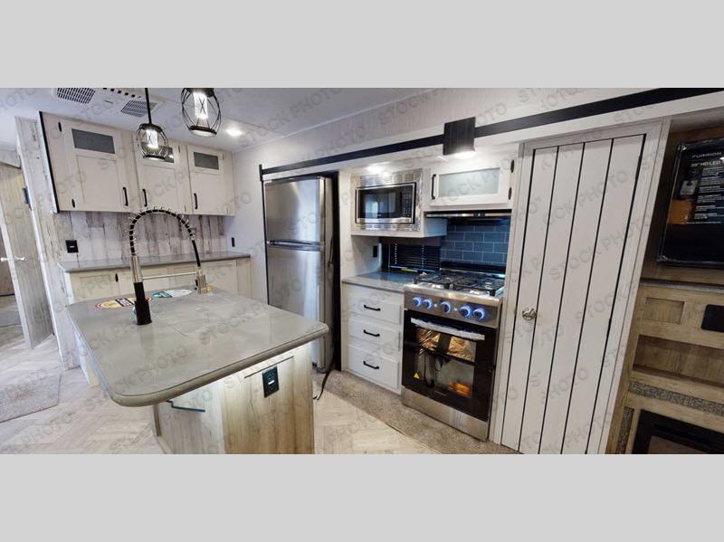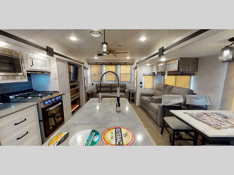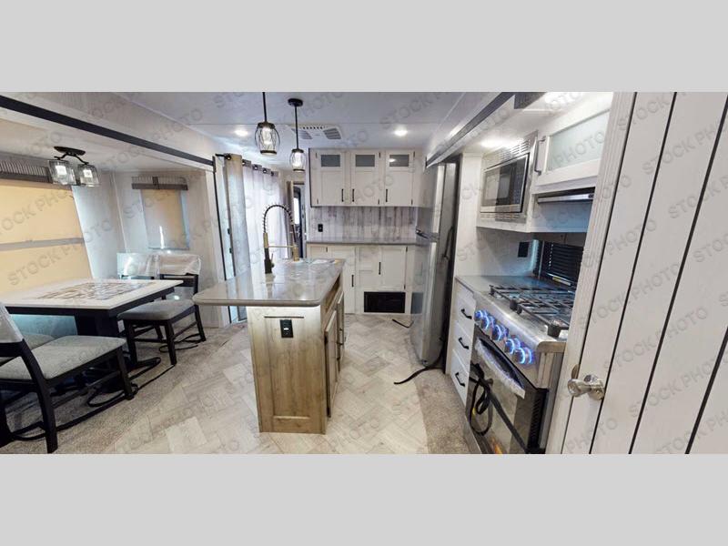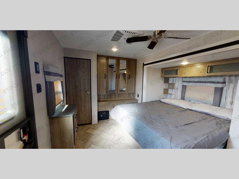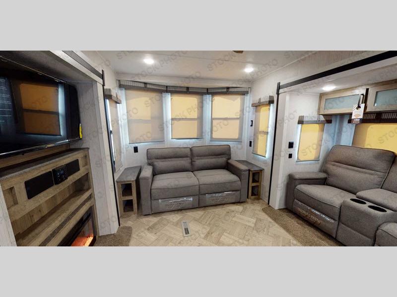 Get ready to enjoy your destination for a weekend or even longer in comfort with the front living and kitchen combined area. The sofa and booth dinette offer relaxing and dining space as well as sleeping space when needed. There are two recliners you are sure to love, and you might have decided to add the optional fireplace. There is a kitchen island to prepare and serve meals from, and wash the dishes. The kitchen offers full amenities including a residential style refrigerator and plenty of storage. You will surely enjoy the natural lighting from the patio door, and the second entry/exit is located in the rear private bedroom where you can sleep like a king, and you might like to wash your clothes if you added a washer/dryer option to the prepped space.