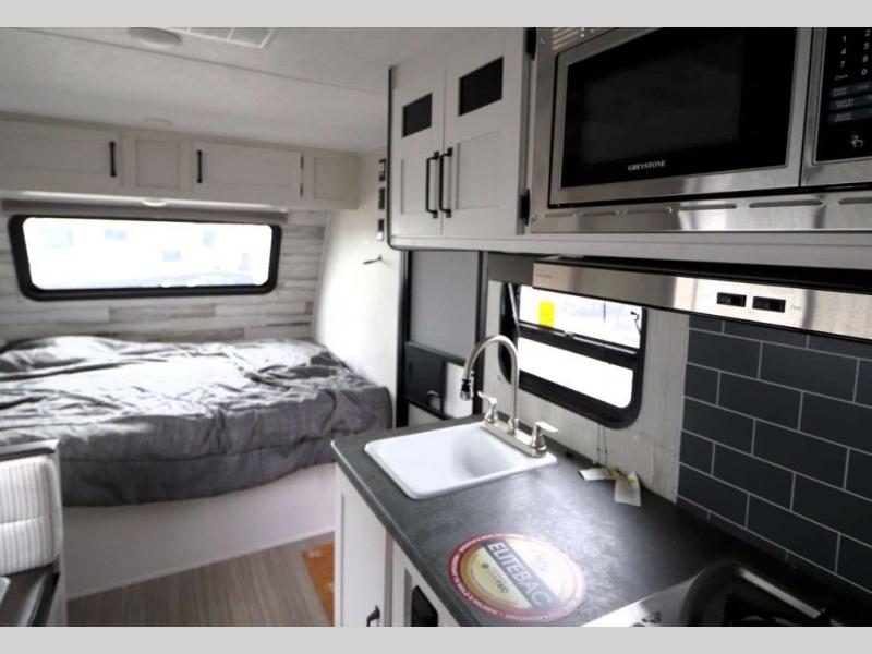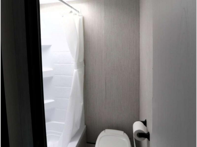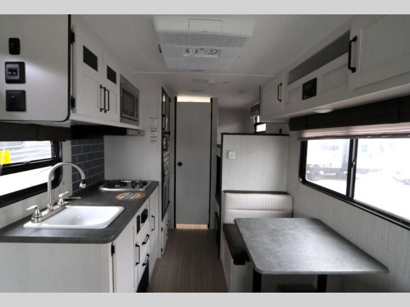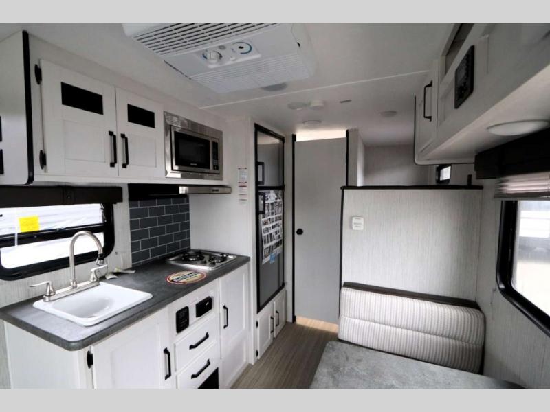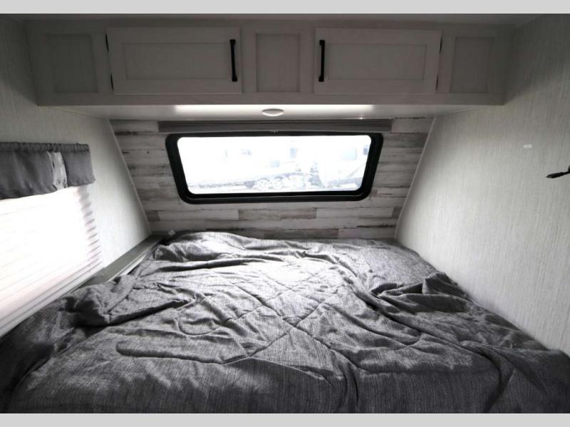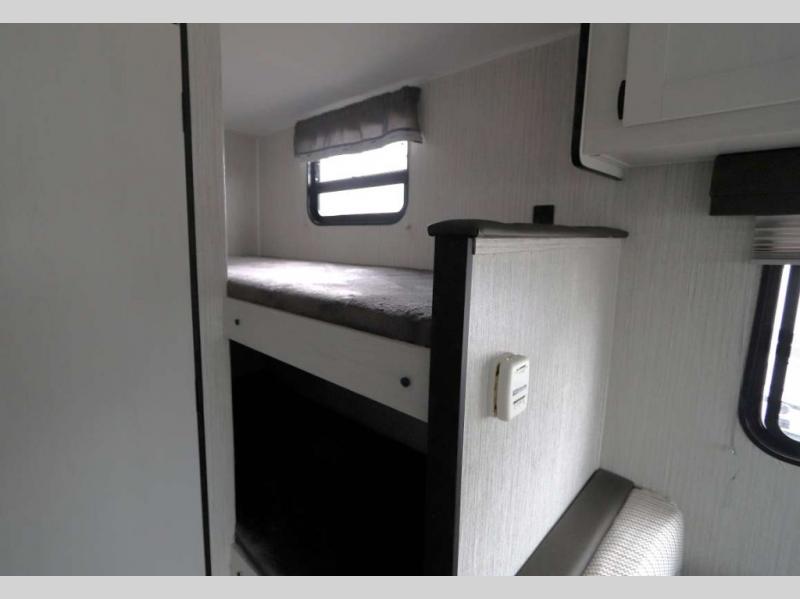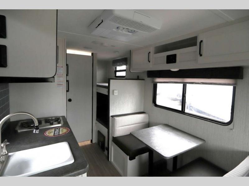The family is ready, are you? After loading up your clothes, food and gear, you and your crew can camp with everything you need plus more inside this trailer. The kids will surely claim the bunks as their own, and you will have an RV queen bed up front. Two can dine at the booth dinette, or everyone can dine outside under the 12' electric awning after adding your camping chairs. The cook will have a two-burner cooktop and stainless steel microwave to whip up meals, and the residential refrigerator can hold the leftovers. And everyone will stay clean using the private toilet and tub/shower next to the bunks.
