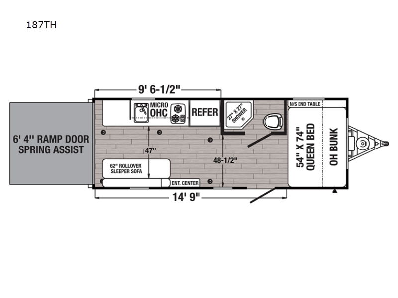 Ramp up the fun in this travel trailer toy hauler! You can easily load your toy(s) in the 14'9" of cargo space with different widths depending how much space you need. After unloading, this area will become your living and kitchen combined space. There is a two-burner cooktop, a residential refrigerator, and counter space for the cook plus you can relax on the rollover sleeper sofa on the opposite side until someone needs this for their sleeping arrangements. The bathroom includes a toilet and shower to clean off the dirt from the ride, and the front offers a queen bed with bunk above.