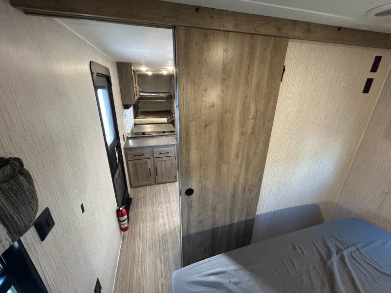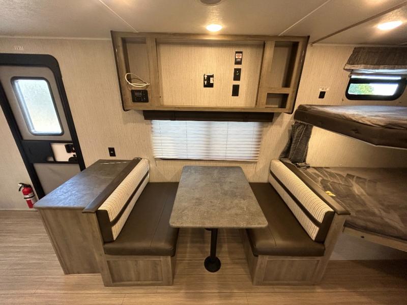 There's room for the whole family in this travel trailer! You will enjoy your own privacy with the front private bedroom which features a 60" x 74" RV queen bed with shirt closets on either side to hang your clothes, and a shelf above for your books or alarm clock. The kiddos can sleep on the set of 48" x 76" double stacked double bunk beds with storage underneath. They can even invite a friend or two to join in on the fun and sleep on either the sofa or booth dinette once converted. Everyone can freshen up in the rear corner bathroom with a 32" x 40" shower with a seat, and keep their bellies full with the three burner cooktop. You could even choose to add the optional outside mini camp kitchen with a griddle, a mini fridge, and a sink with a drawer below for your cooking utensils if you like cooking outdoors!