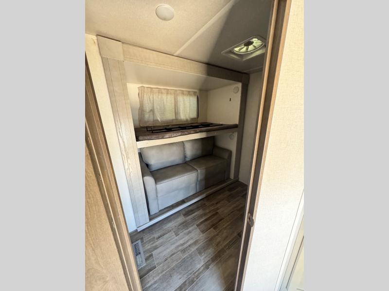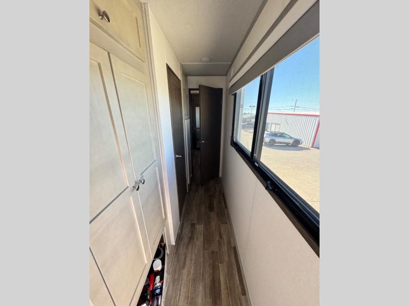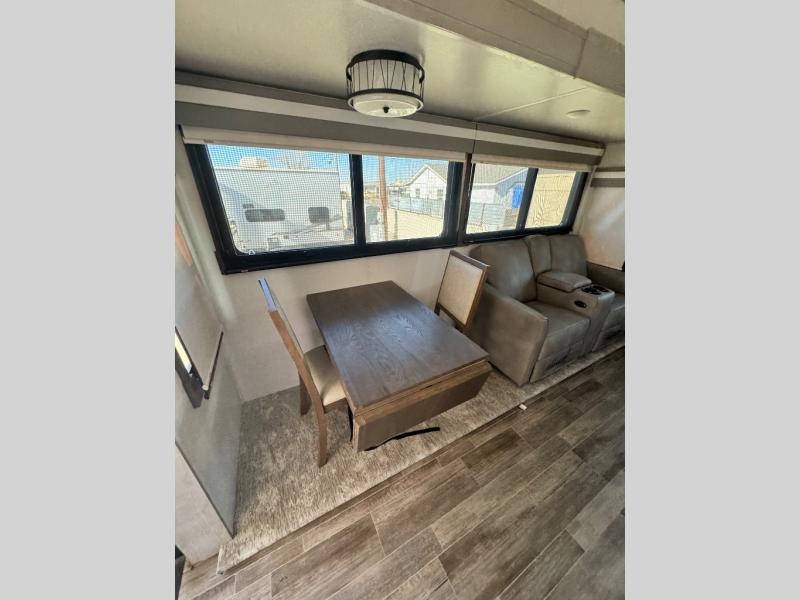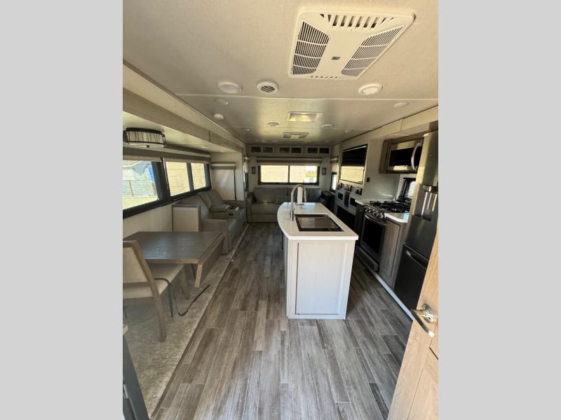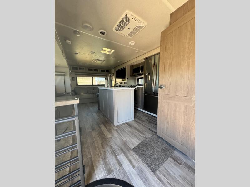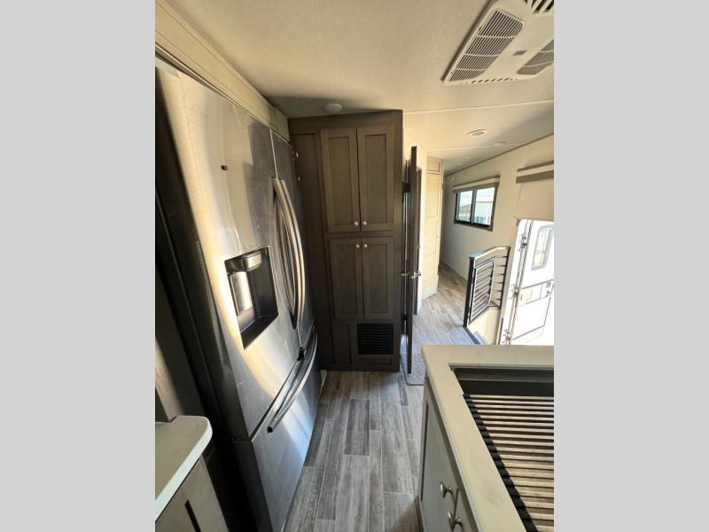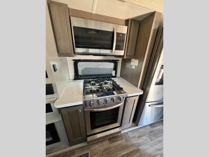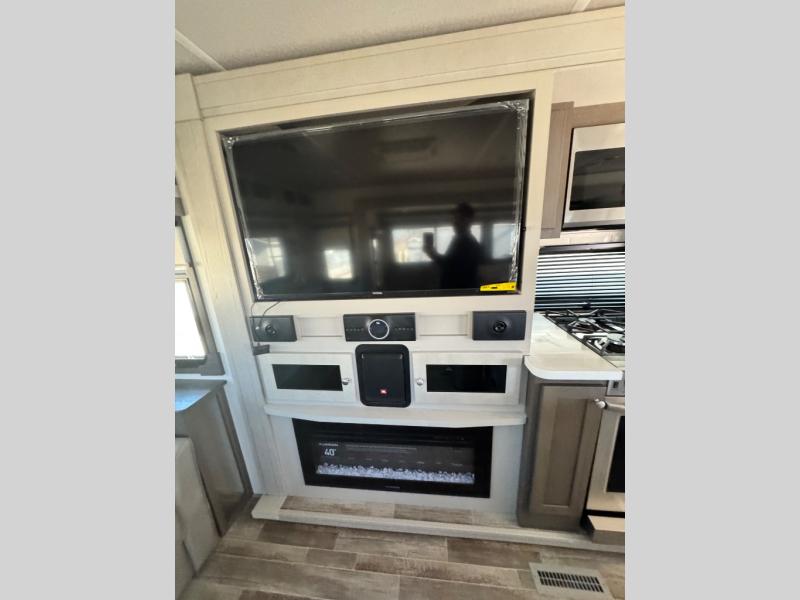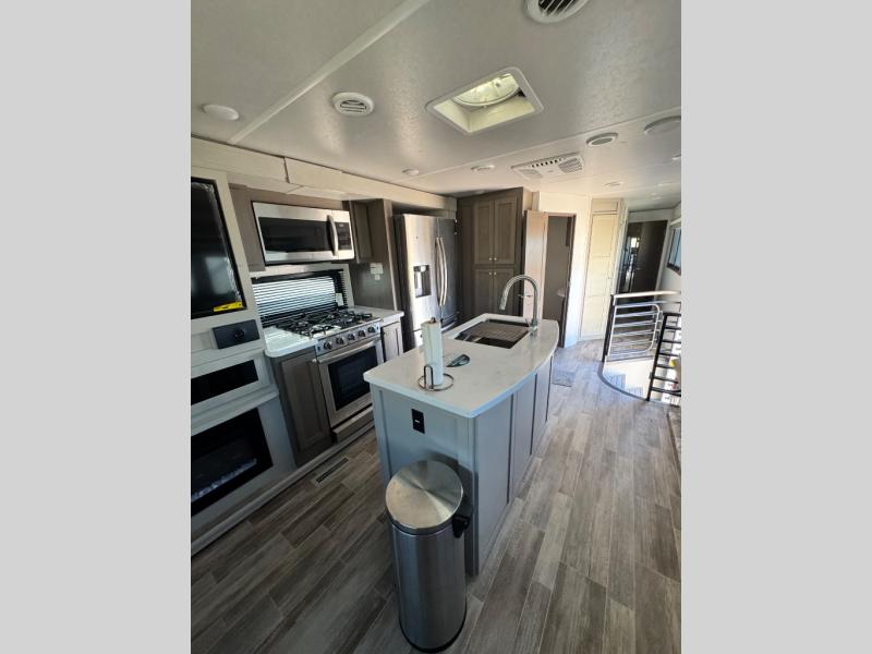 Get ready to live in comfort and style when you take this fifth wheel with you! You will love the unique railing entry and spacious main living area and kitchen thanks to the dual opposing slides. You can relax on the theater seats with cupholders, the split tri-fold sofa that also offers sleeping space, or at the wall-mounted free-standing table with extension and residential dinette chairs. The kitchen is loaded with amenities including the residential appliances, the pantry, and the island. And you will love the multi-functional middle bunkhouse that offers a flip-up bunk and 68" tri-fold sofa below, plus a desk countertop that you can utilize as an office or the kids can do homework from here. The front bedroom includes a king bed slide, a pop-up 32" TV with fireplace below, a wardrobe and a space prepped for a washer and dryer option. The Signature Spa walk-in shower with a teak wood seat inside the full bathroom is just another reason you will love this RV.
