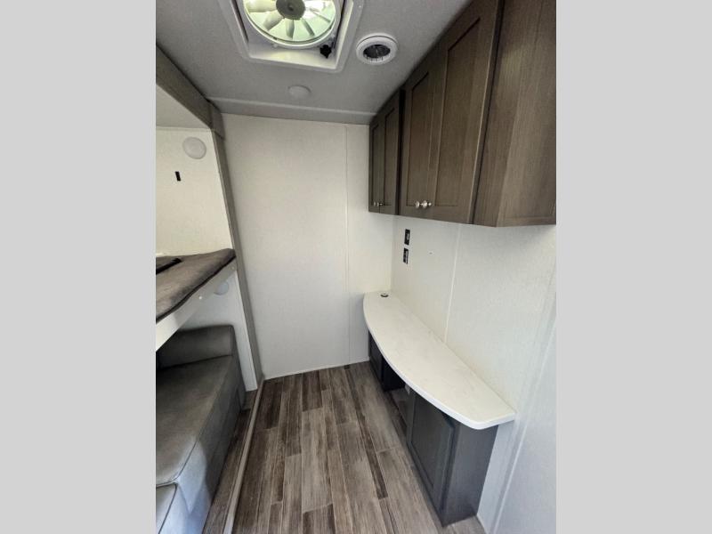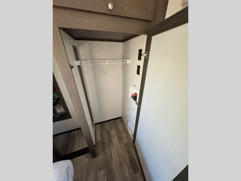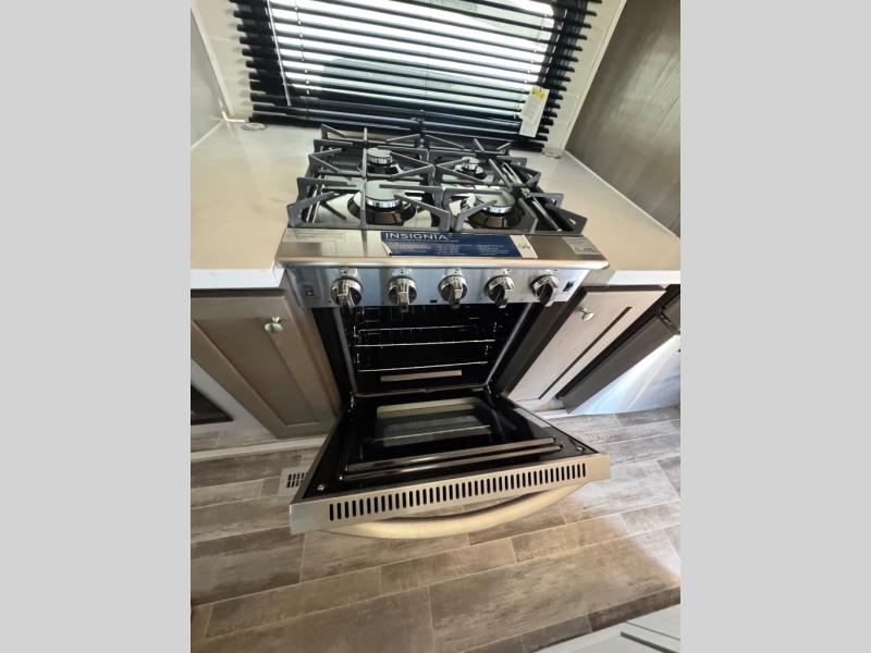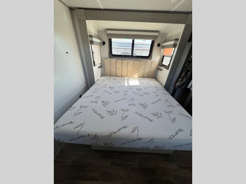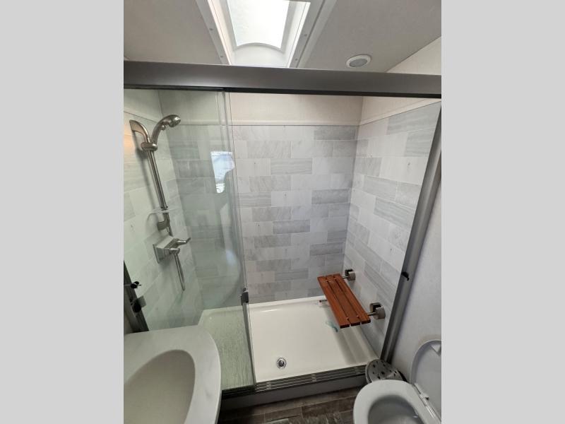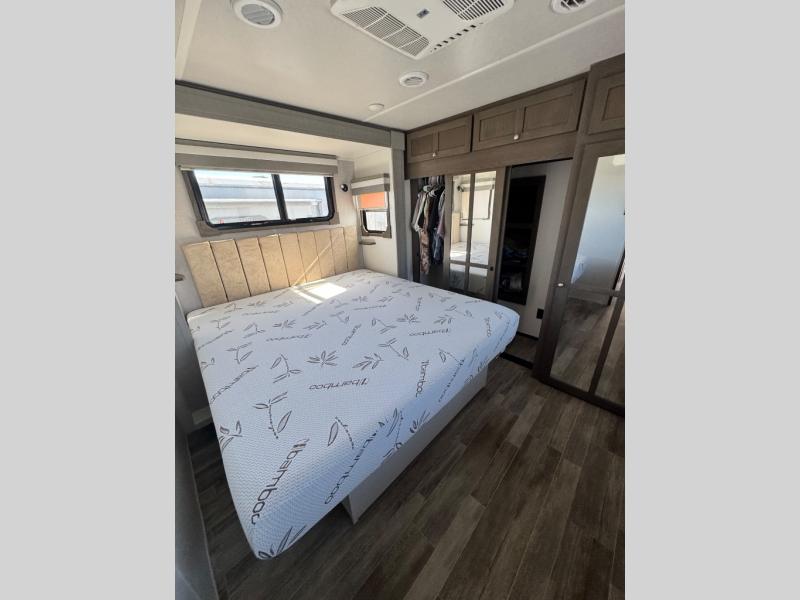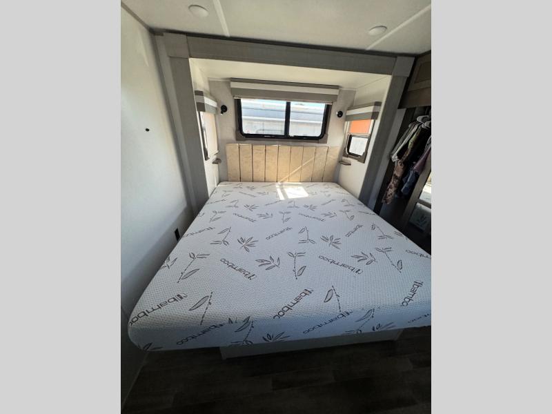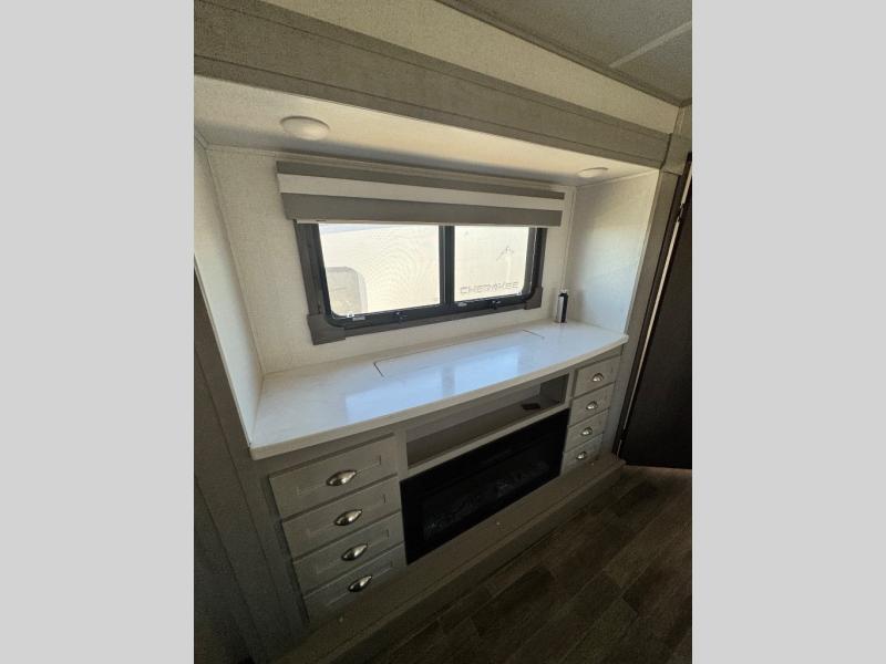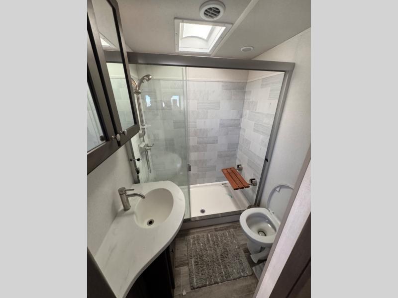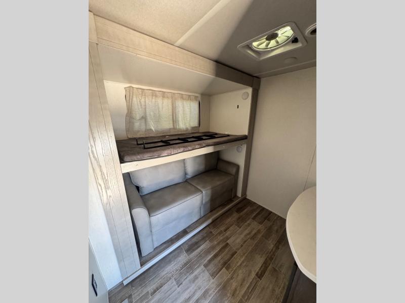 Get ready to live in comfort and style when you take this fifth wheel with you! You will love the unique railing entry and spacious main living area and kitchen thanks to the dual opposing slides. You can relax on the theater seats with cupholders, the split tri-fold sofa that also offers sleeping space, or at the wall-mounted free-standing table with extension and residential dinette chairs. The kitchen is loaded with amenities including the residential appliances, the pantry, and the island. And you will love the multi-functional middle bunkhouse that offers a flip-up bunk and 68" tri-fold sofa below, plus a desk countertop that you can utilize as an office or the kids can do homework from here. The front bedroom includes a king bed slide, a pop-up 32" TV with fireplace below, a wardrobe and a space prepped for a washer and dryer option. The Signature Spa walk-in shower with a teak wood seat inside the full bathroom is just another reason you will love this RV.