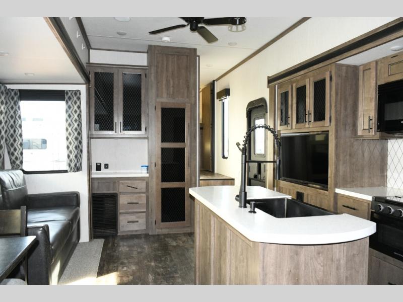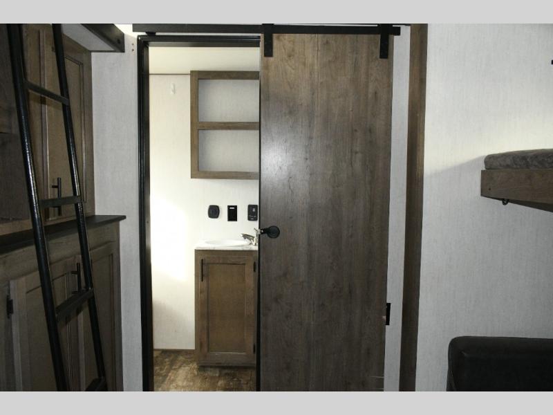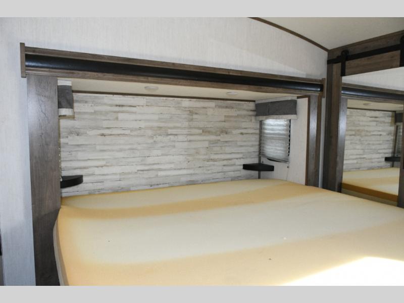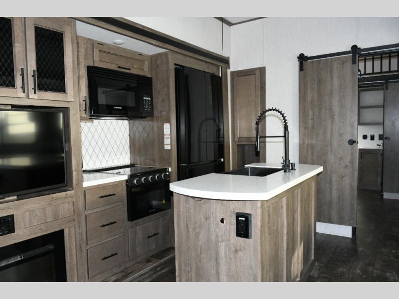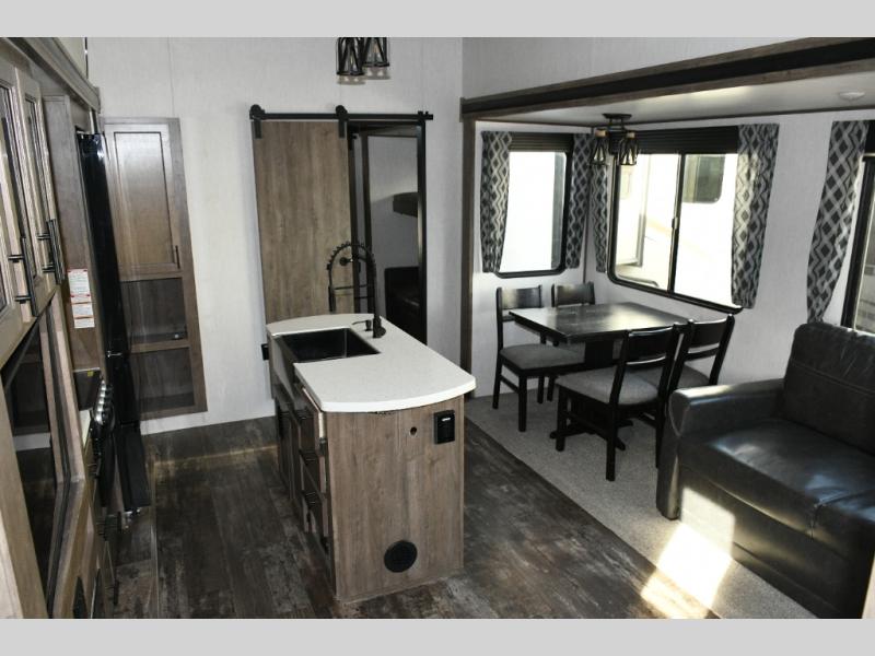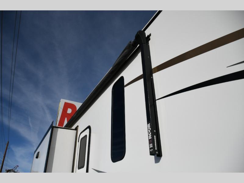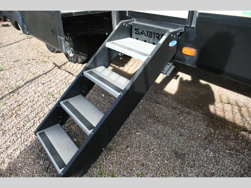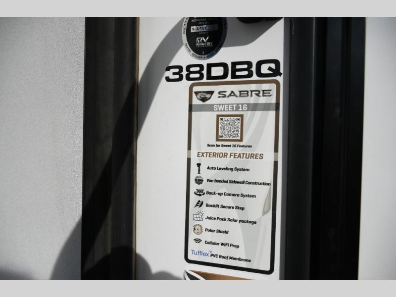 This fifth wheel turns busy travel days into relaxed living. Kids claim the loft and bunkhouse, guests enjoy their own bathroom, and adults retreat to the private front bedroom. Meal prep is easy in the island kitchen or outside at the outdoor kitchen, and evenings are spent under the awning sharing stories and planning the next day’s adventure. With space, storage, and smart design, the Sabre 38DBQ makes family travel seamless and enjoyable.