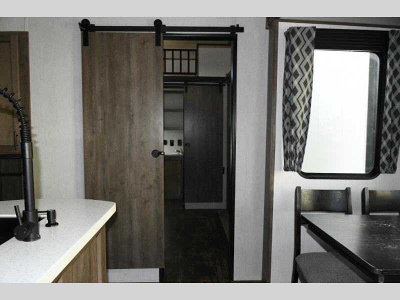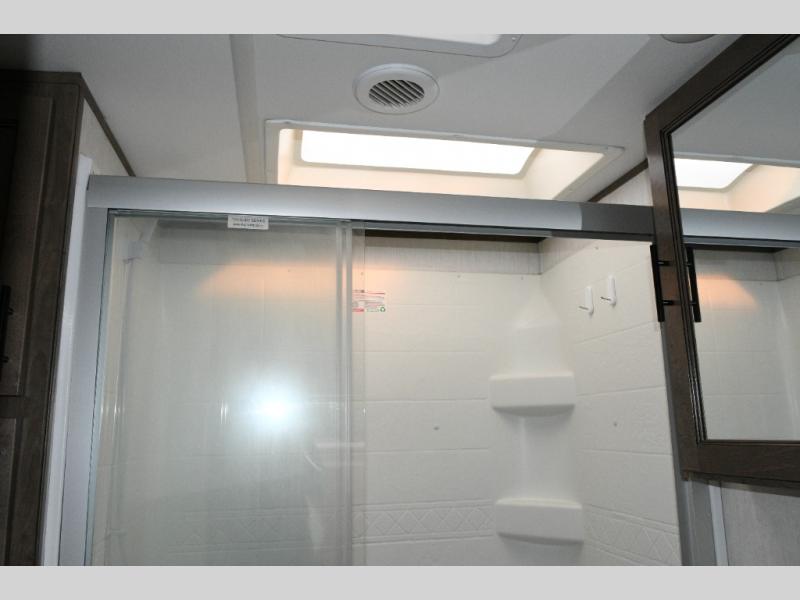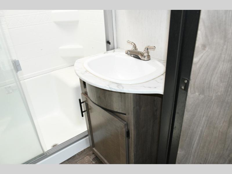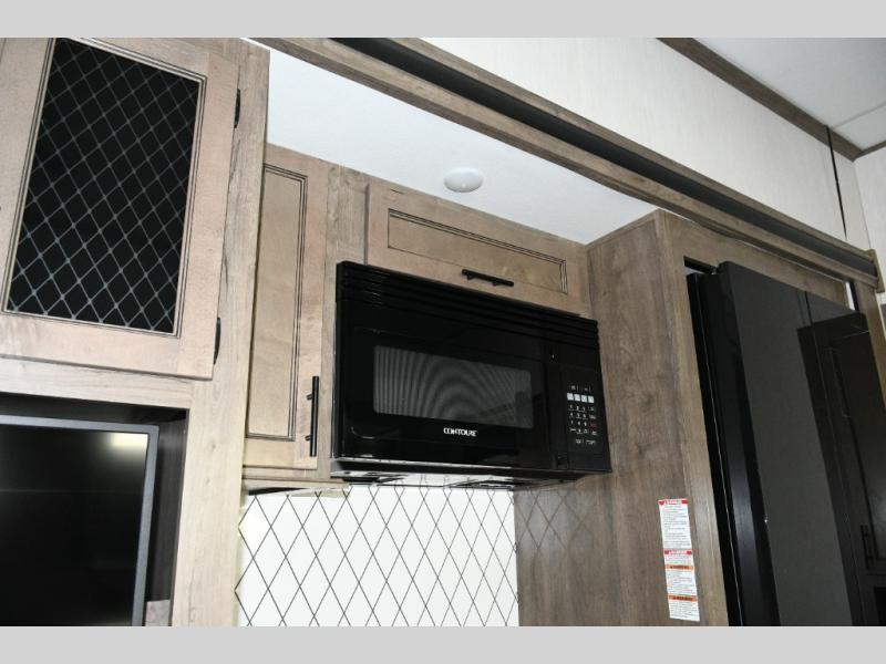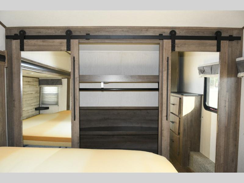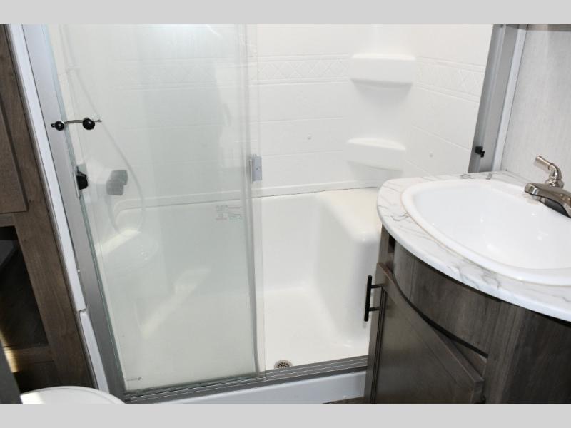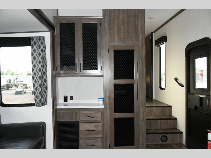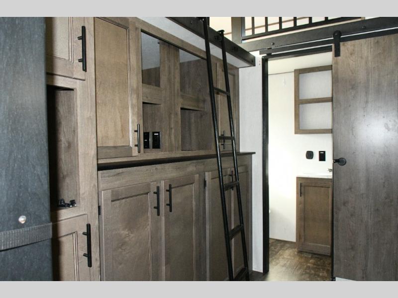 This fifth wheel turns busy travel days into relaxed living. Kids claim the loft and bunkhouse, guests enjoy their own bathroom, and adults retreat to the private front bedroom. Meal prep is easy in the island kitchen or outside at the outdoor kitchen, and evenings are spent under the awning sharing stories and planning the next day’s adventure. With space, storage, and smart design, the Sabre 38DBQ makes family travel seamless and enjoyable.