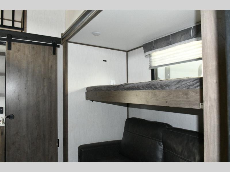 • Dedicated rear bunkhouse featuring a tri-fold sofa with bunk above