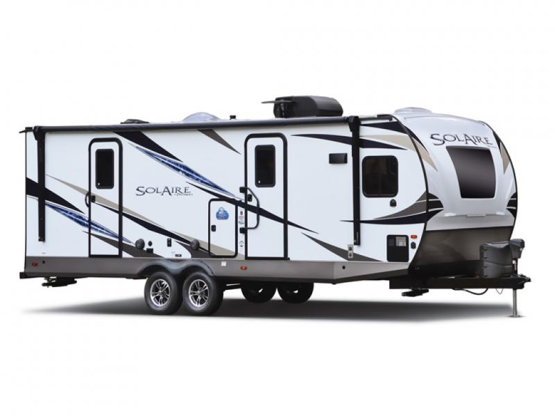 With any SolAire Ultra Lite travel trailer by Palomino, there is independent suspension axles for a smooth ride, an aluminum superstructure frame for light weight towing, and a barreled ceiling for a more spacious interior. Also included is a 2/3 front fiberglass cap, white hi-gloss exterior, Dexter Tor-Flex torsion axles, and a power tongue jack. The interior offers solid surface countertops for style and durability, a stainless steel kitchen sink with a roll cover for easy cleanups, ball bearing drawer guides, and LED interior lighting. Make your selection today!
