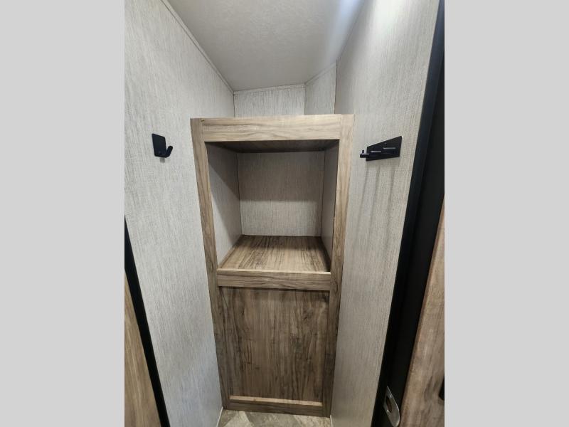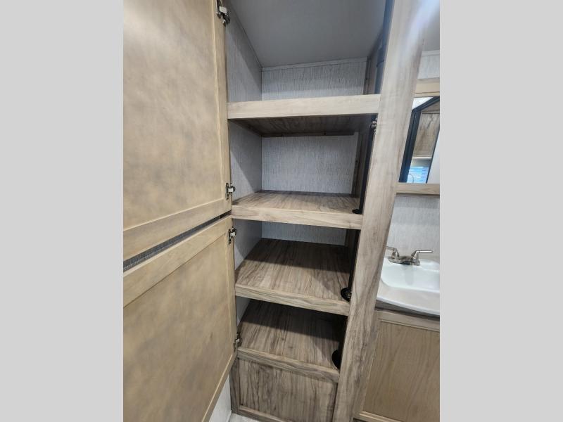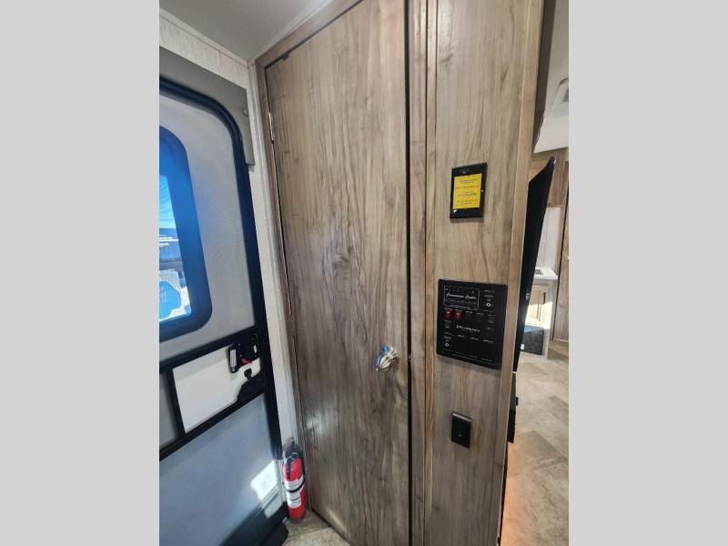 The cook in the family will love this trailer with a pull out stove with a refrigerator along the exterior for making meals while outdoors while everyone enjoys the protection from the 19' power awning. And the full kitchen amenities inside include a glass top flush mount range, a microwave, an 11 cu. ft. refrigerator and a pantry. You can relax inside on the theater seats that are within a large slide out while watching the entertainment center, and the entry closet is super handy. The full rear bathroom gives you the space you need as well as a shower with a seat. And the front bedroom provides a queen bed, dual wardrobes and privacy.