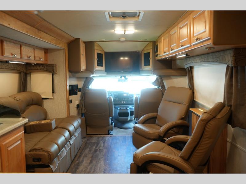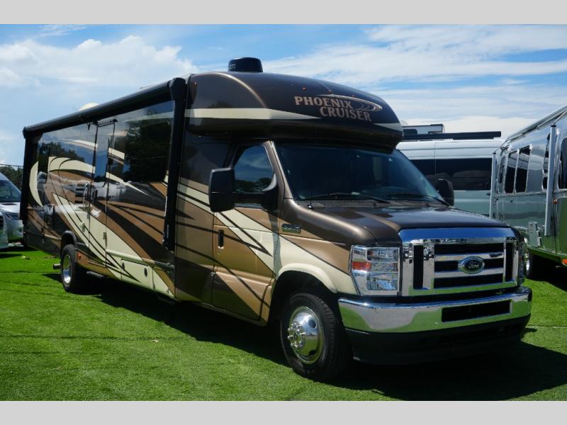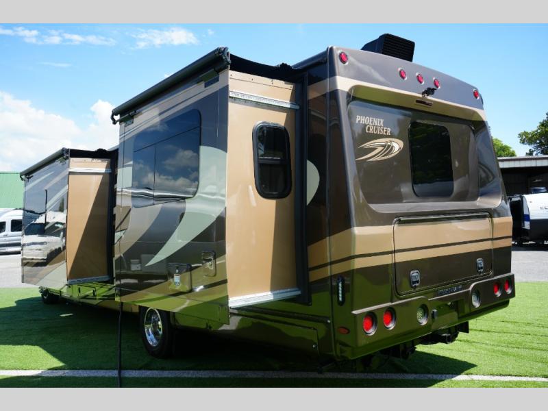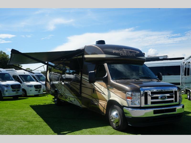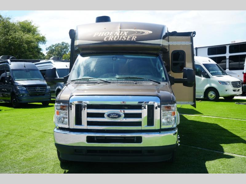 The Phoenix Cruiser 2910D Class B+ is built on a 7.3L V8 with Garmin navigation and a 4,000W generator. It features two slide-outs, an RV queen bed, a rear desk for remote work, and premium lounging space. Call Today! 352.787-7744