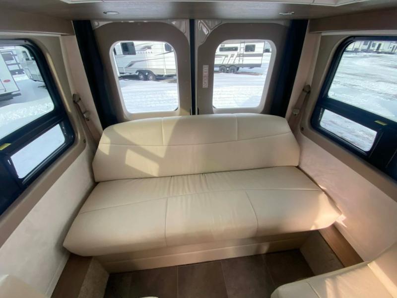 This Plateau Class B diesel motorhome features two dining locations for you to enjoy your delicious meals at thanks to the innovative Lagun table. There is also an array of storage options between the overhead cabinets, the soft-close drawers, and the pull-out pantry. If you have to get a little bit of work done while on the road, then you will love the front lounge workstation with the 120V power outlet, the USB charging ports, and the extended Corian countertop with a privacy shade and storage cabinets too. The microwave makes it easy for you to pop a bag of popcorn and enjoy eating it while you relax on the power sofa with memory foam sofa cushions!