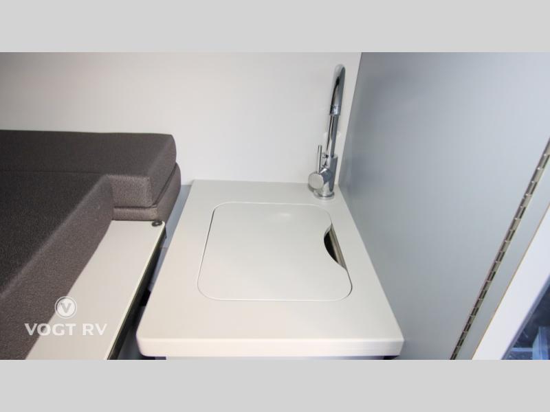 Functional Galley: Features a 3.2 cu. ft. compressor refrigerator, a stainless steel sink, and an induction cooktop.