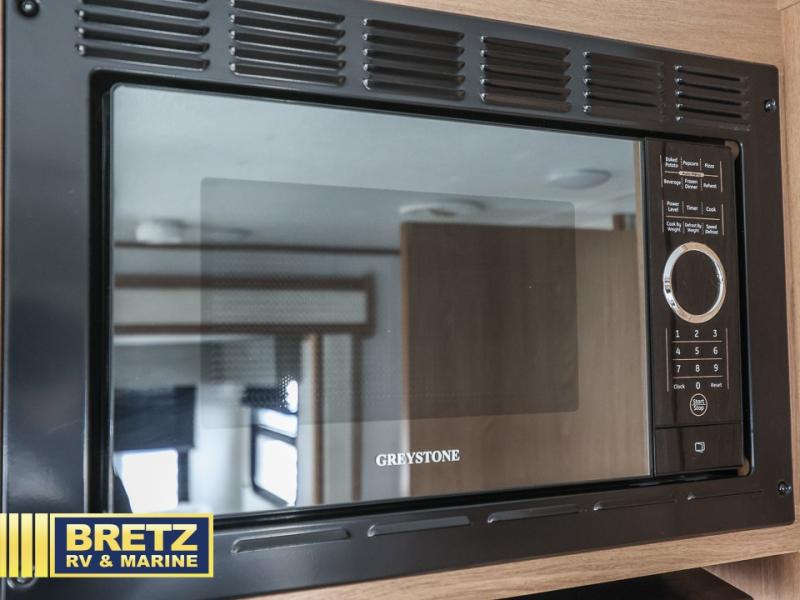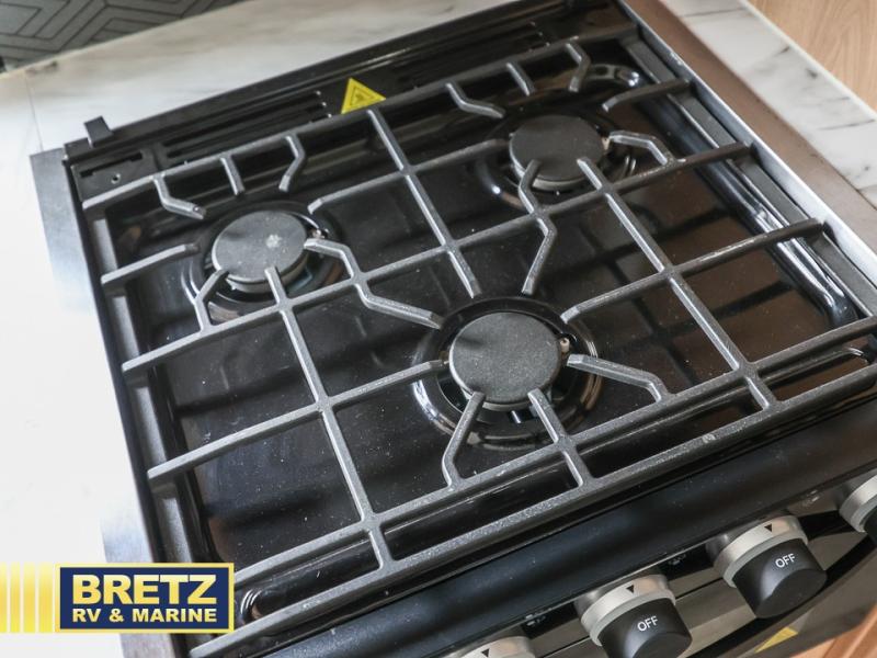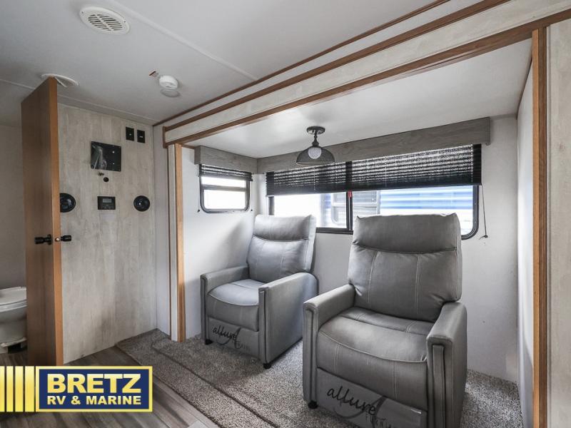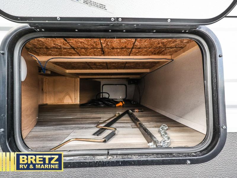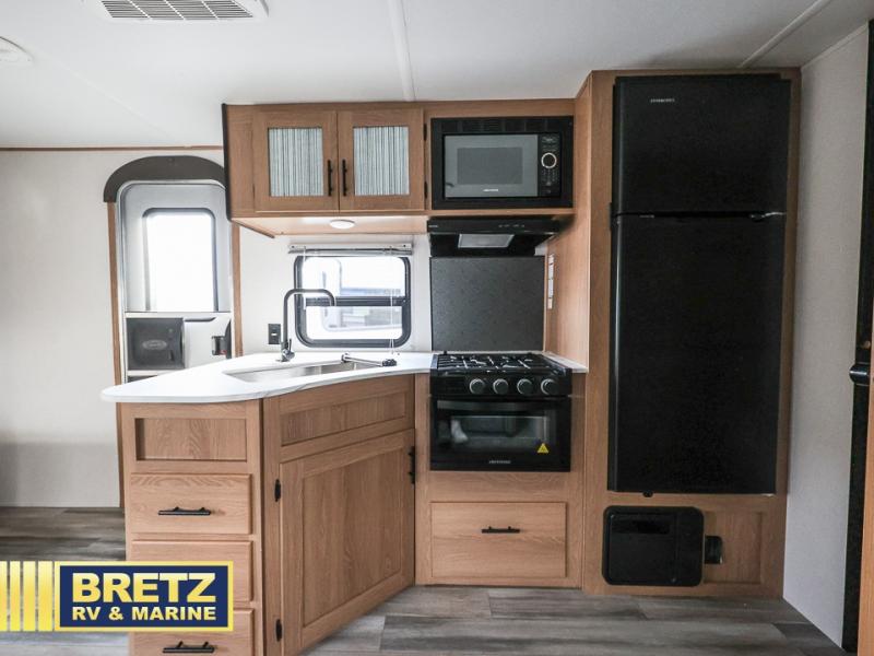 This rear bath travel trailer offers privacy to change and get cleaned up as well as includes linen storage so you will have everything you need in one place. The walk-around queen bed in the private bedroom as well as the furniture folds down into extra sleeping space at night allowing five to six to sleep comfortably after hiking, relaxing and enjoying the outdoors. The cook will appreciate the three-burner range to make snacks and meals to eat at the U-shaped dinette slide or outside under the power awning that creates a covered outdoor living area protected from the elements.