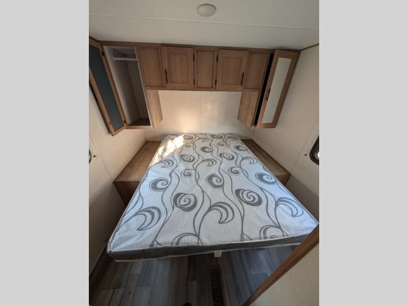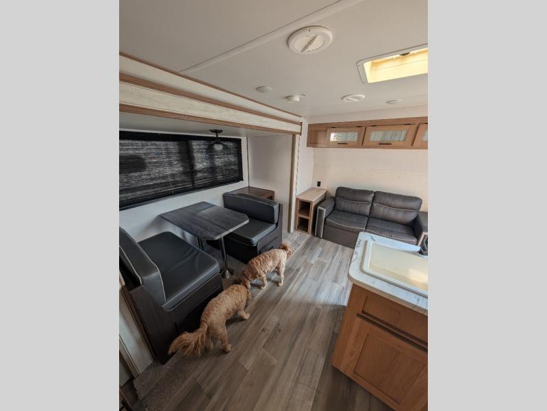 Whether you are a couple or family that loves to camp, this single slide trailer offers more elbow room when relaxing in the combined kitchen and front living area. And the U-shaped dinette can transform into extra sleeping spaces for family or guests after dinner. The kitchen has everything you will need to prepare your best meals including an oversized pantry. And everyone can stay clean using the full bathroom with a shower, plus you can sleep like a queen on the walk-around bed in the rear private bedroom.