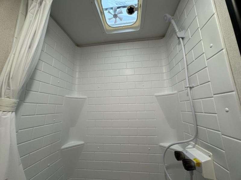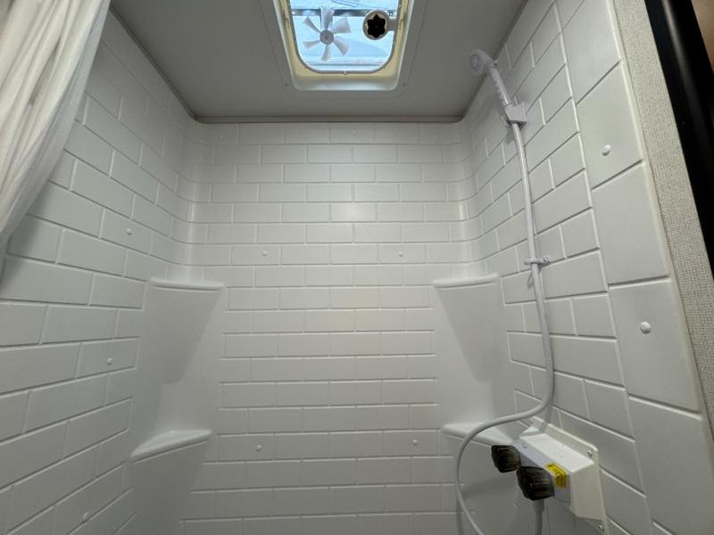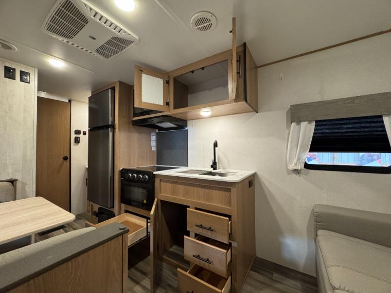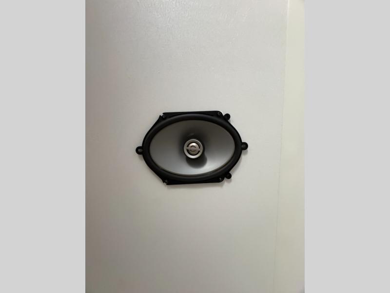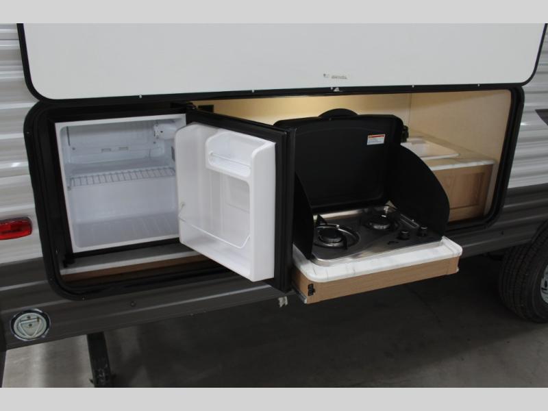 The cook is going to enjoy having choices for every meal, whether to use the full kitchen amenities inside or the outdoor kitchen while visiting with others relaxing under the 13' power awning. With the inclusion of a walk-around queen bed in the front bedroom, plus the sofa and booth dinette in the combined kitchen and living area, and the double-size bunks next to the bathroom sink and private toilet and toilet room, there is plenty of room to sleep eight or nine people each night. And the power awnings plus outdoor speakers give you an additional living area for everyone.